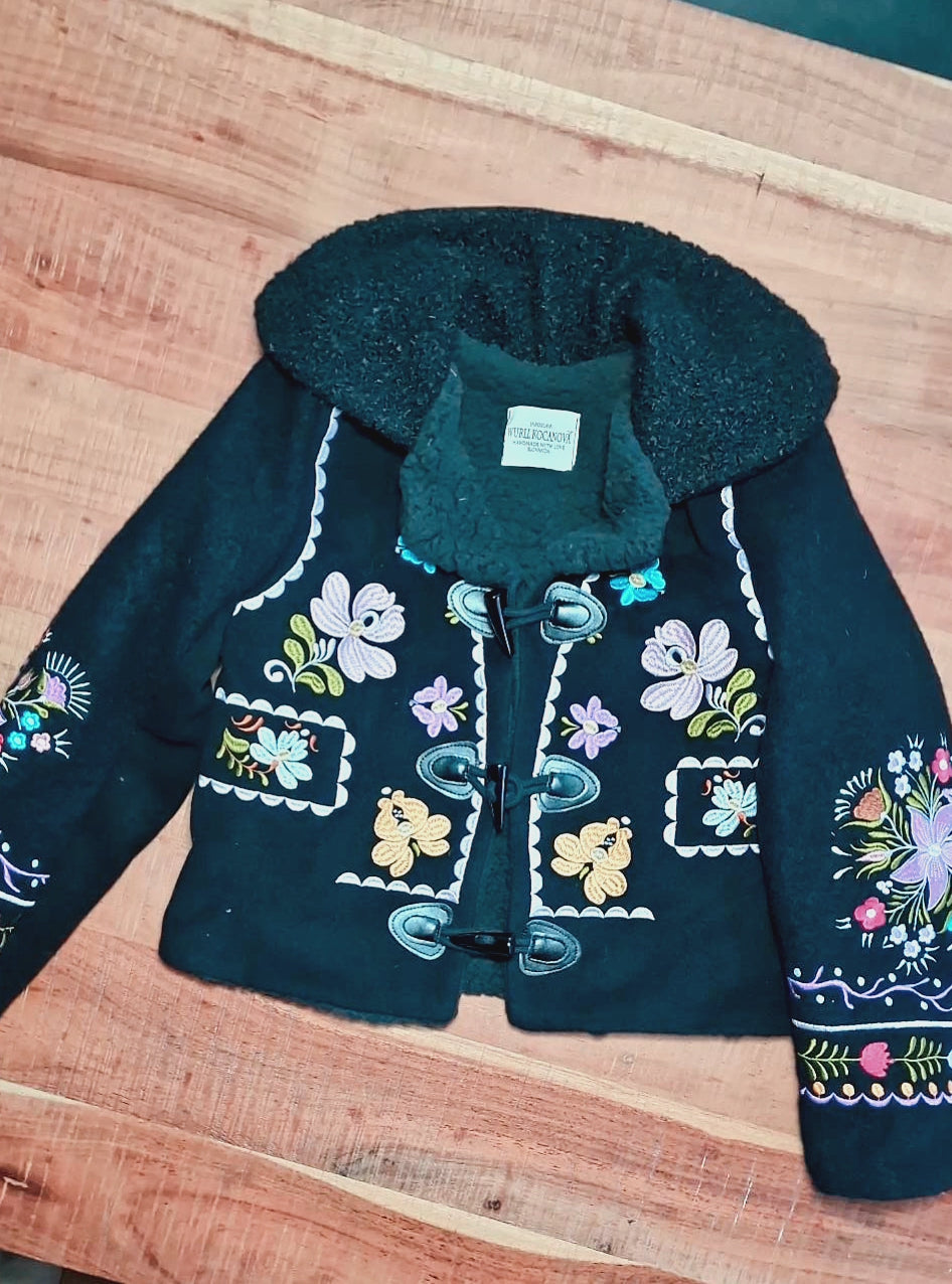 Hrejivý, strojom vyšívaný kabátik so širokým golierom, zapínanie drevenými gombíkmi. Podšitý barančekom.