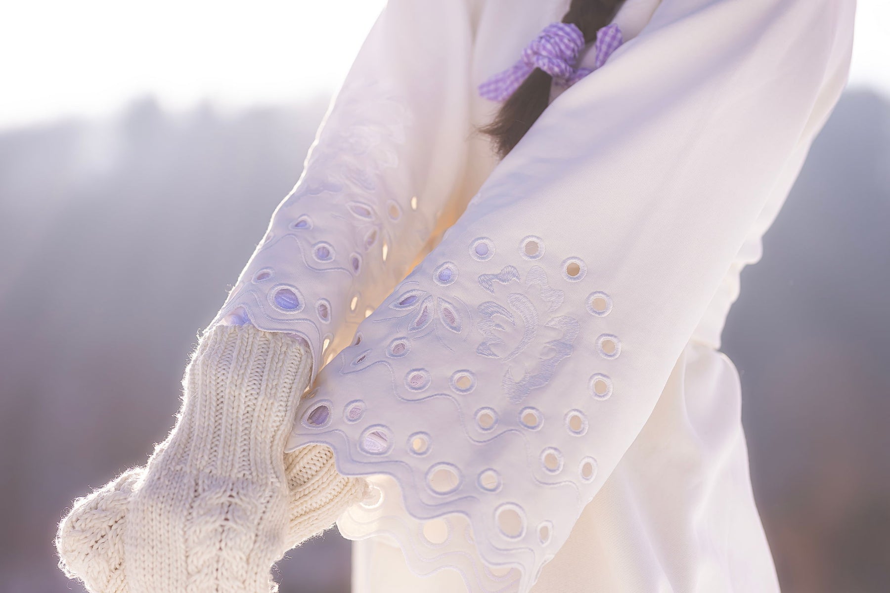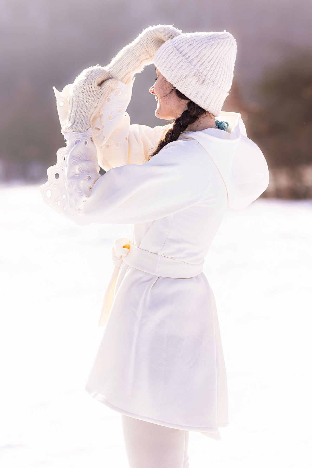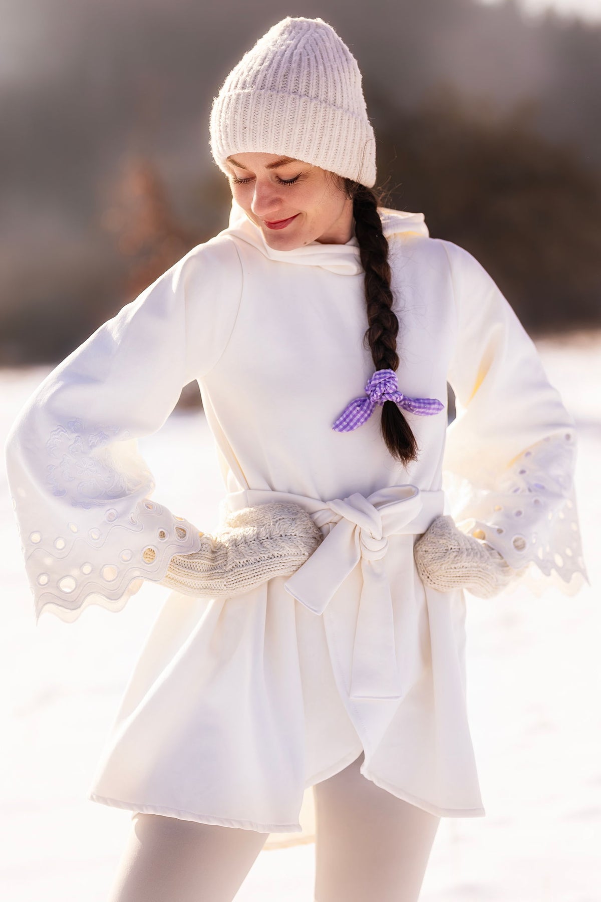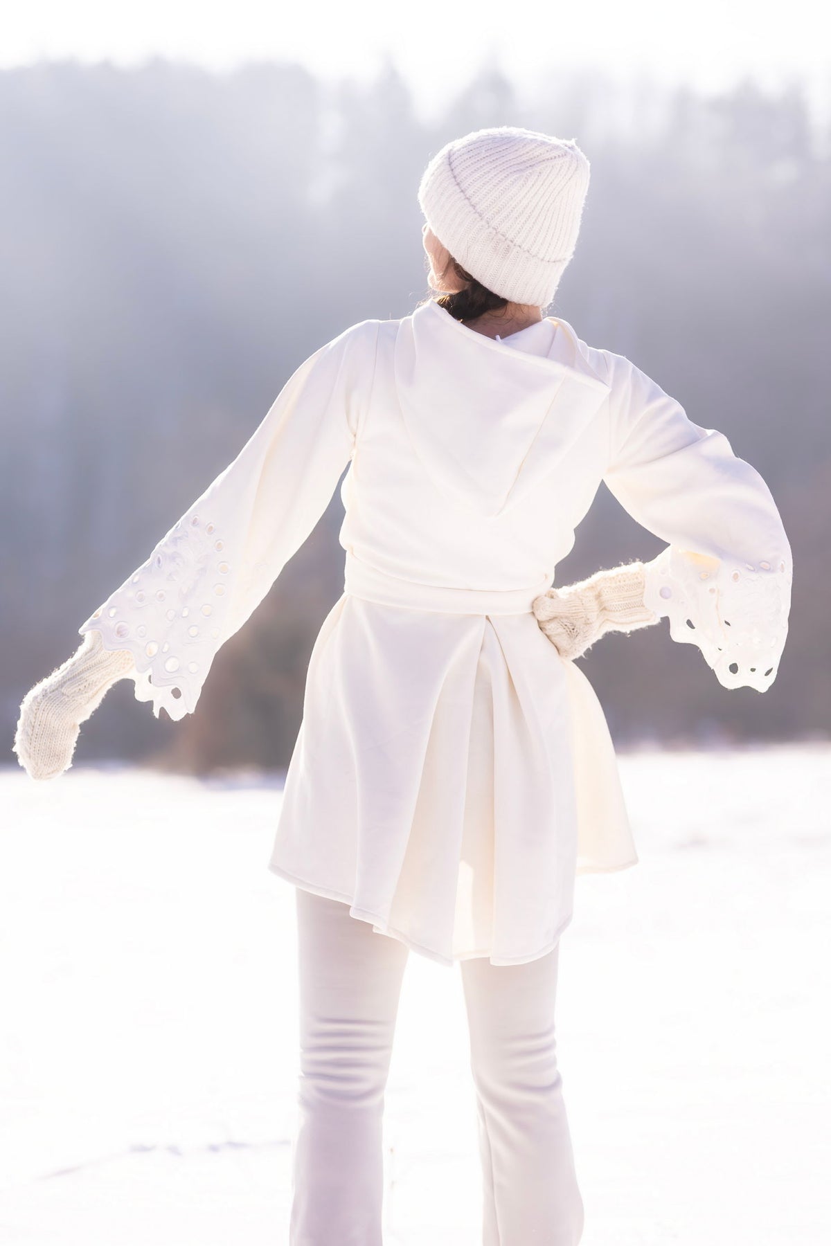 Bavlnená predlžená mikina s kapucňou. Bez podšitia. Na rukávoch autorská, strojom vyšívaná madeira, plný steh, ručne vystrihovaná.