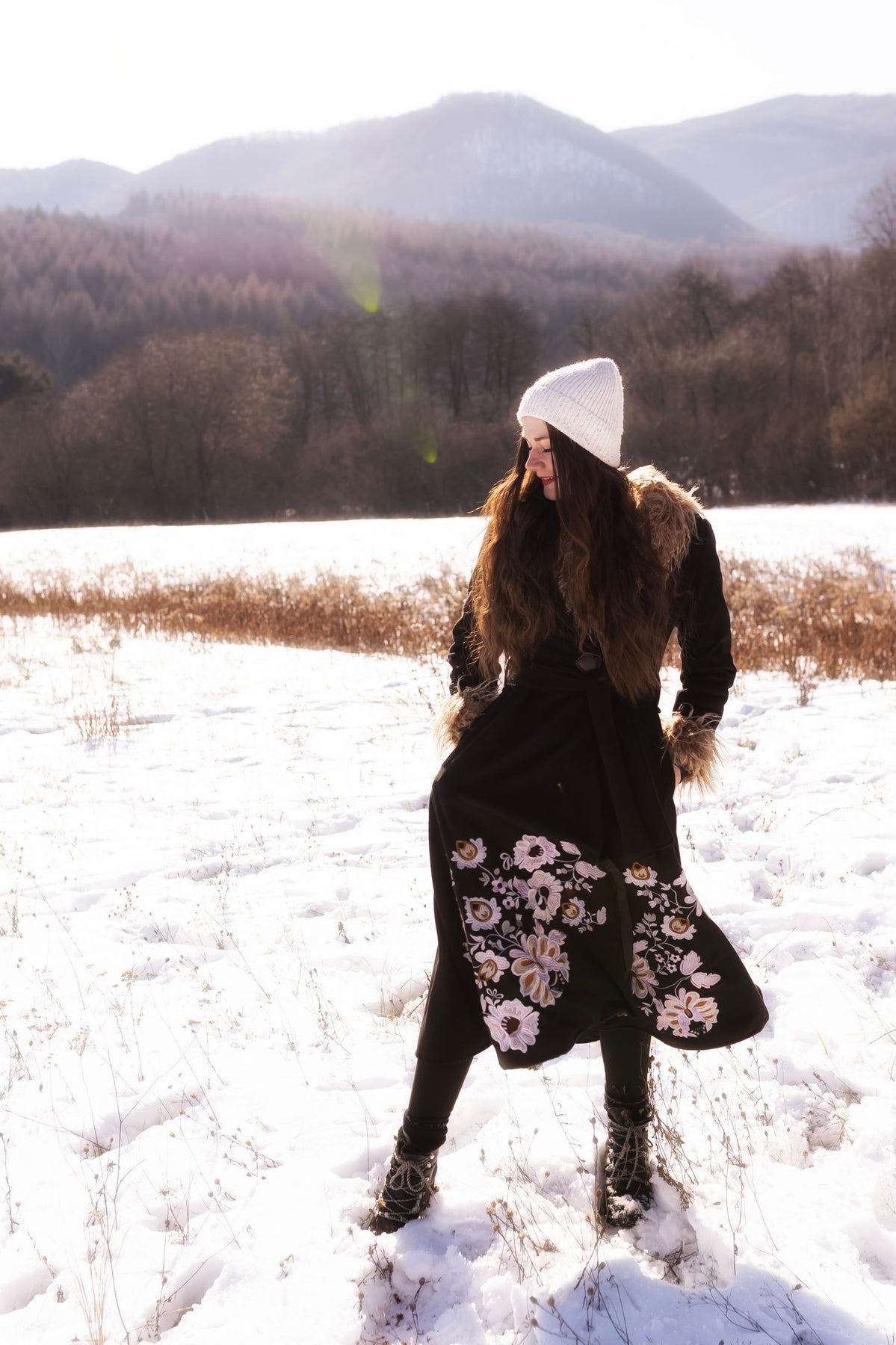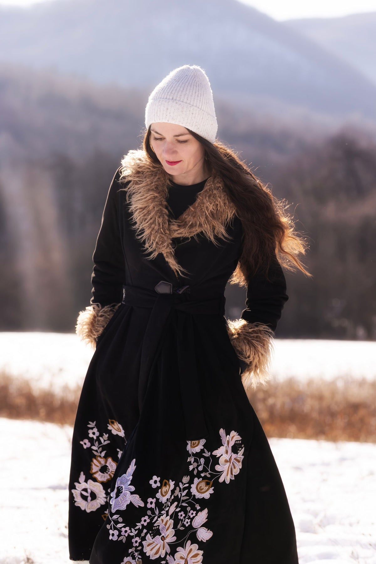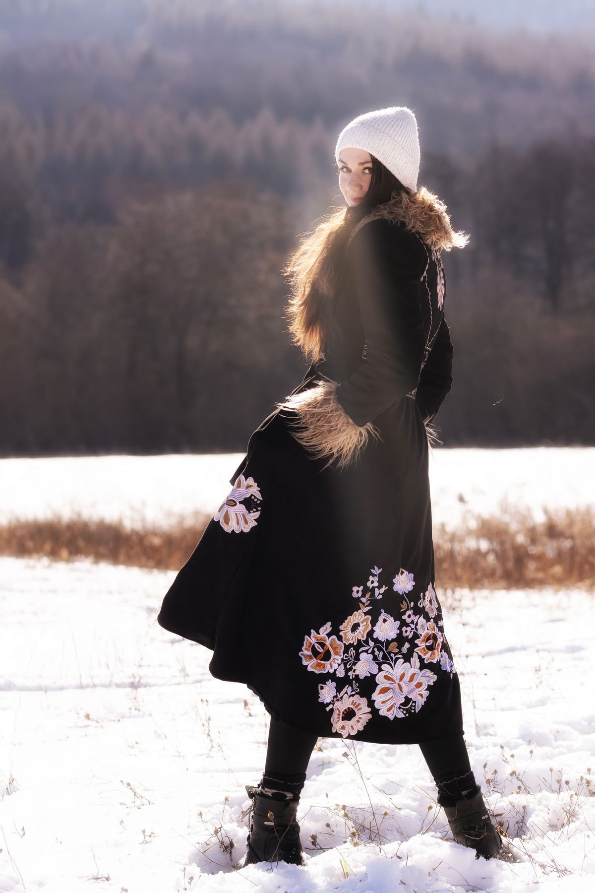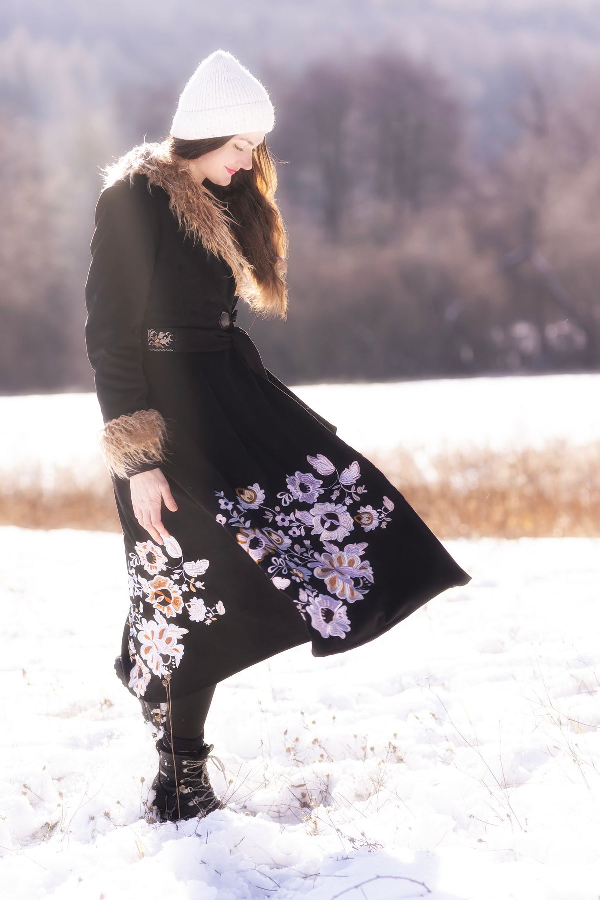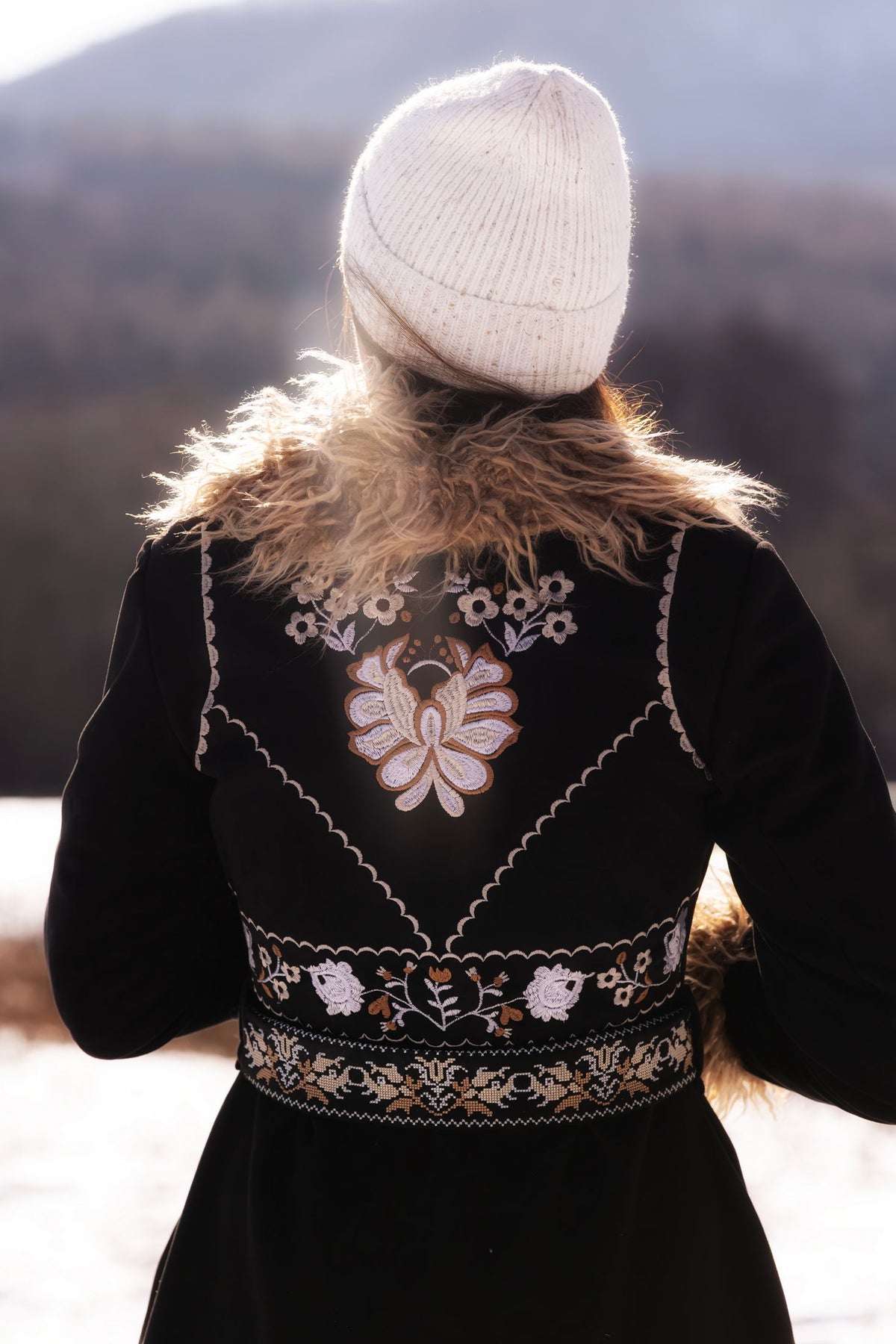 Kabát sa zapína ozdobným gombíkom a očkom, podšitý teplým barančekom. Strojovo vyšívaný autorským návrhom inšpirovaným v slovenskej ľudovej výšivke. Kožušinka nie je odopínateľná.