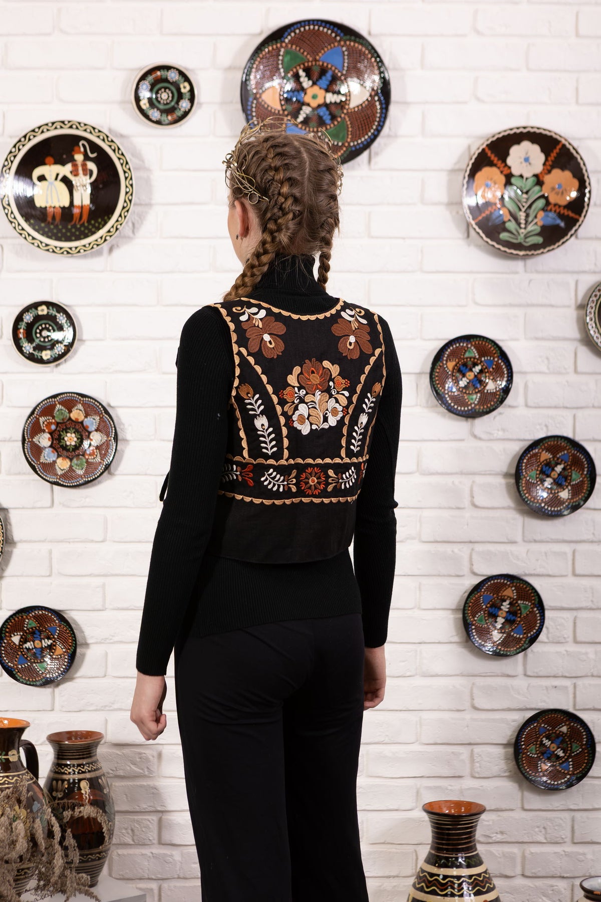 Strojom vyšívaná vesta, viaže sa šnúrkami, podšitá.
