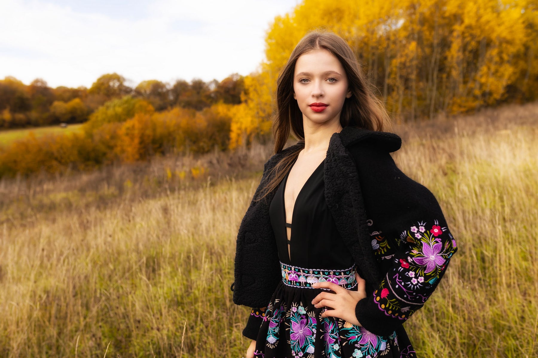 Hrejivý, strojom vyšívaný kabátik so širokým golierom, zapínanie drevenými gombíkmi. Podšitý barančekom.