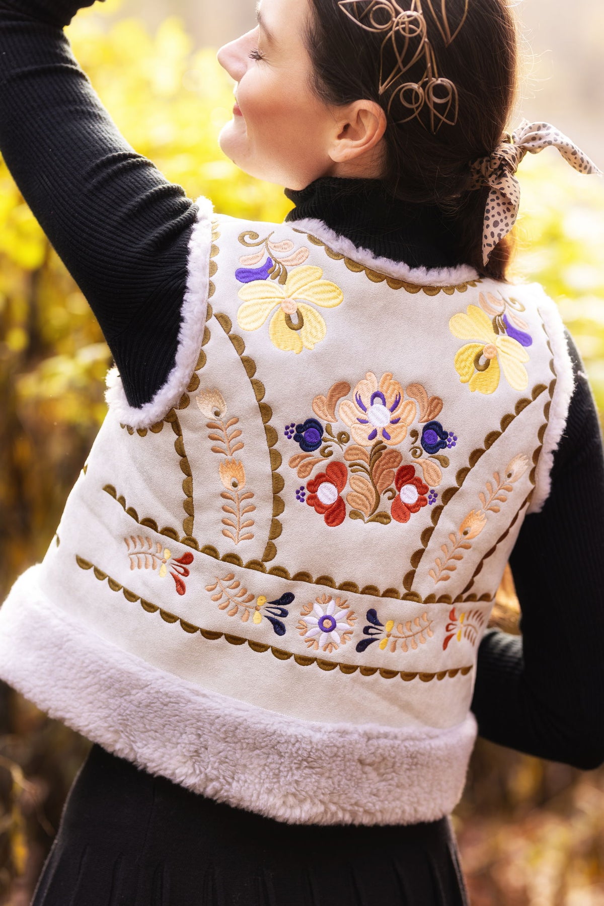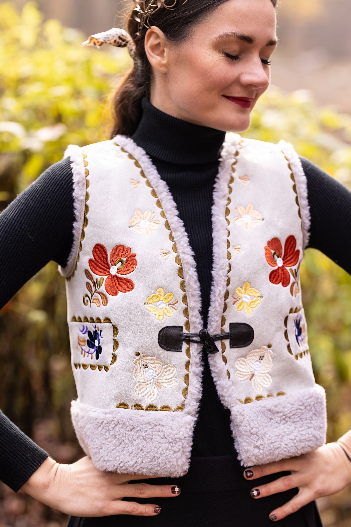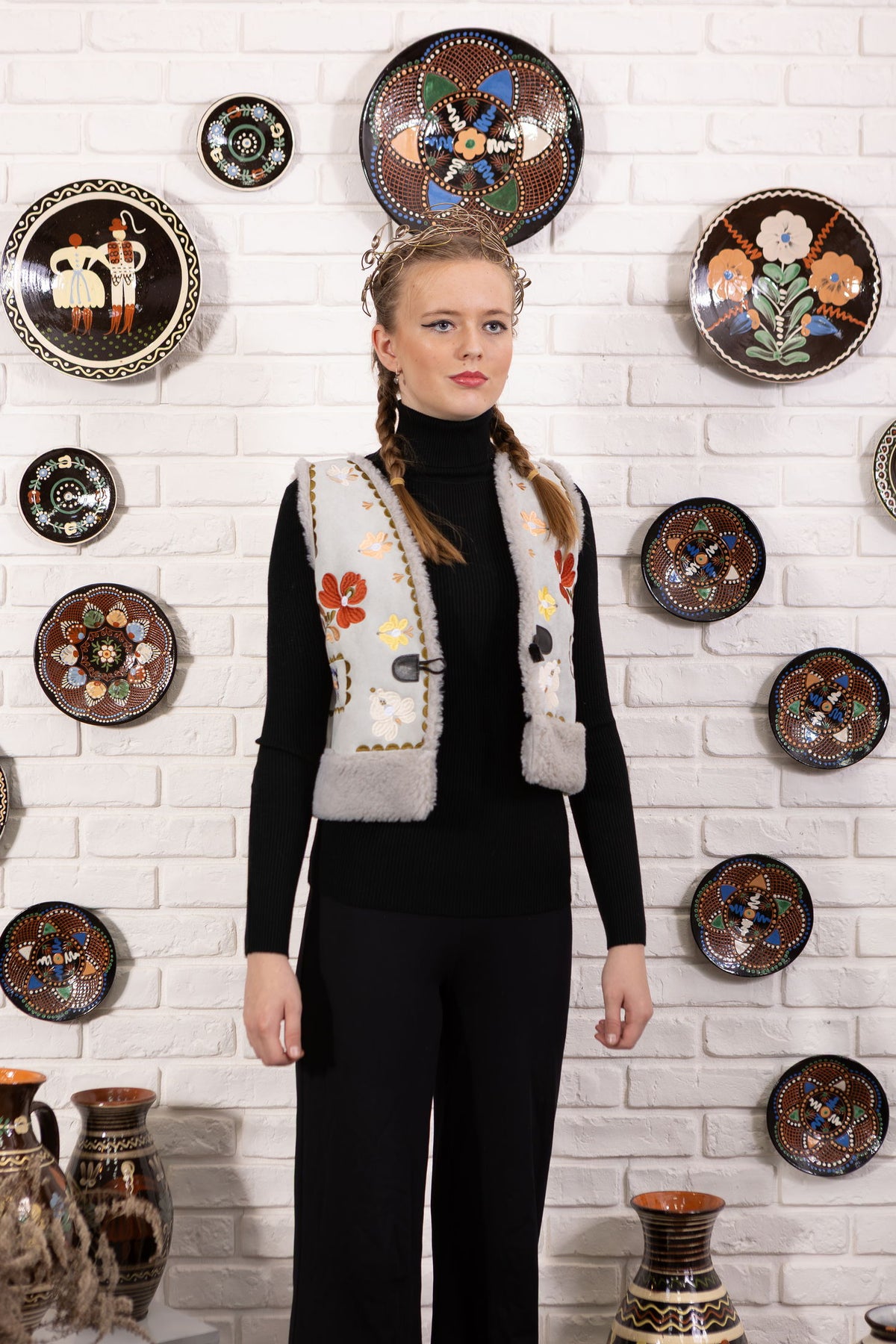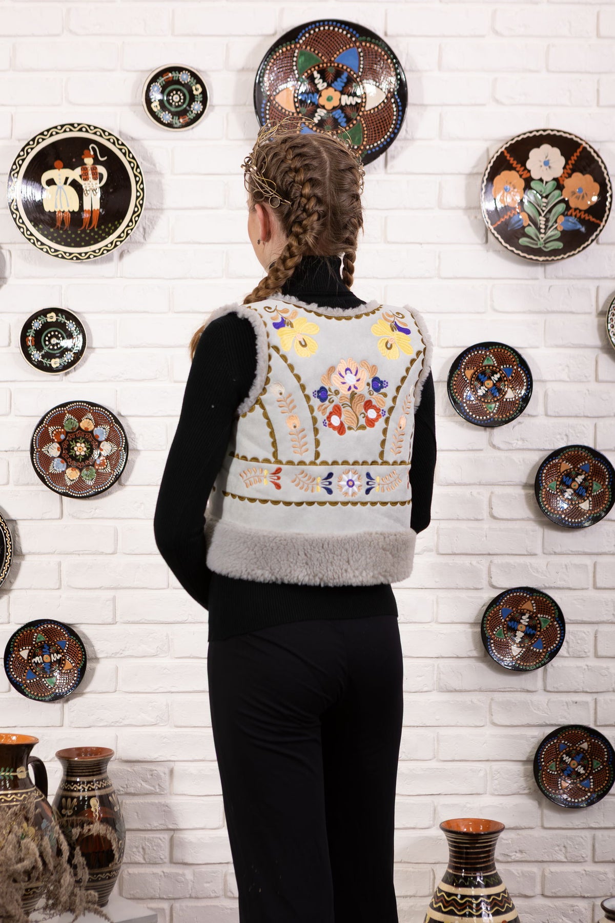 Hrejivá, strojom vyšívaná vesta, zapínanie dreveným gombíkom. Podšitá barančekom.