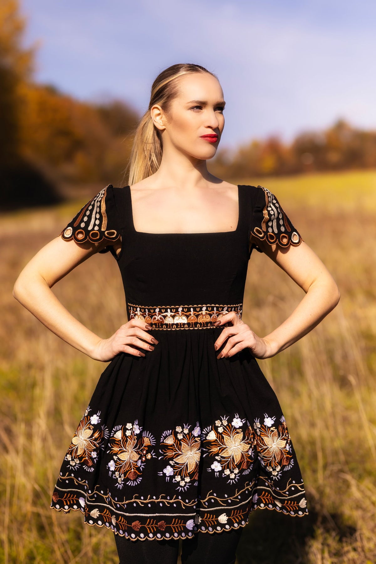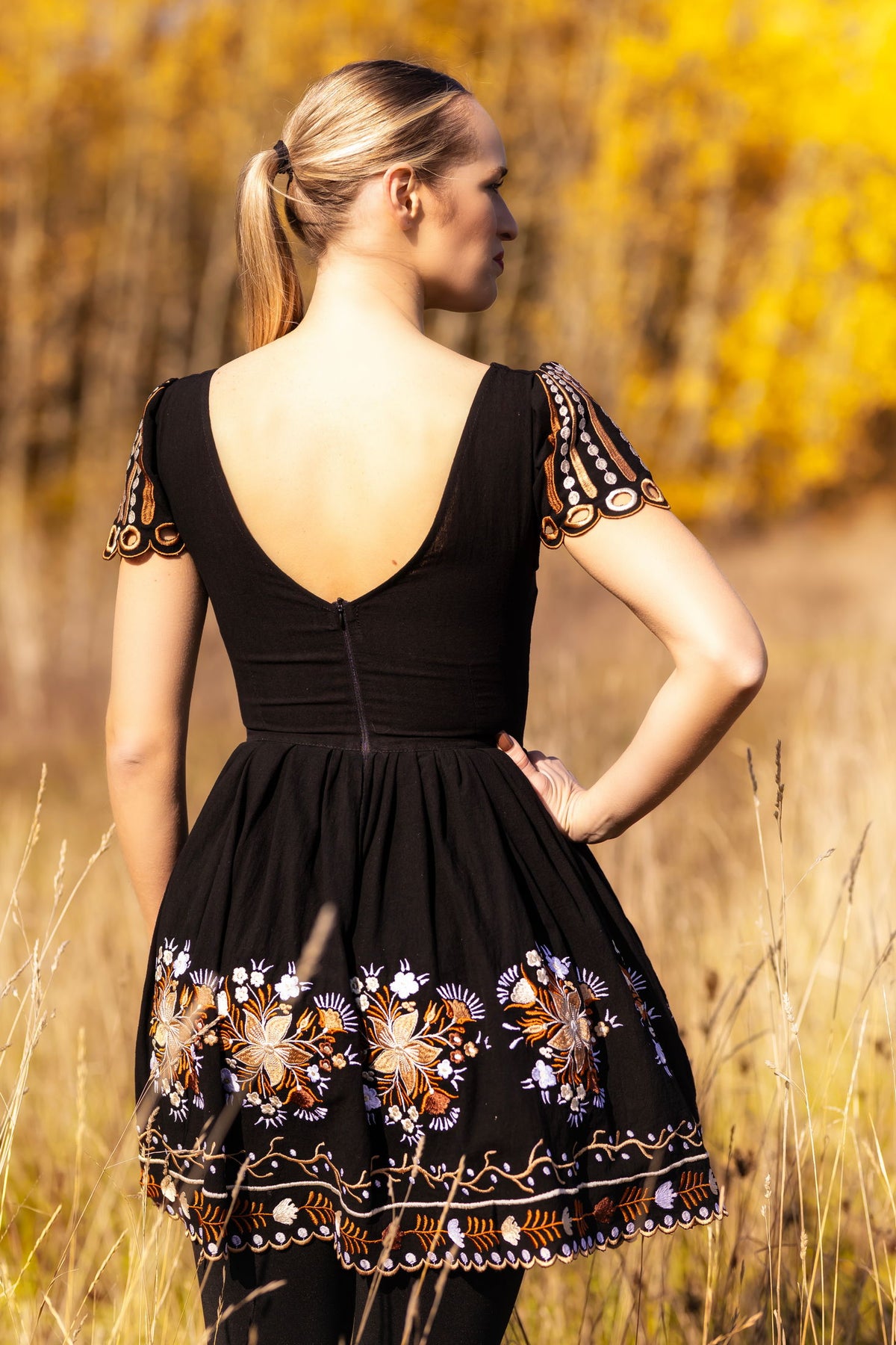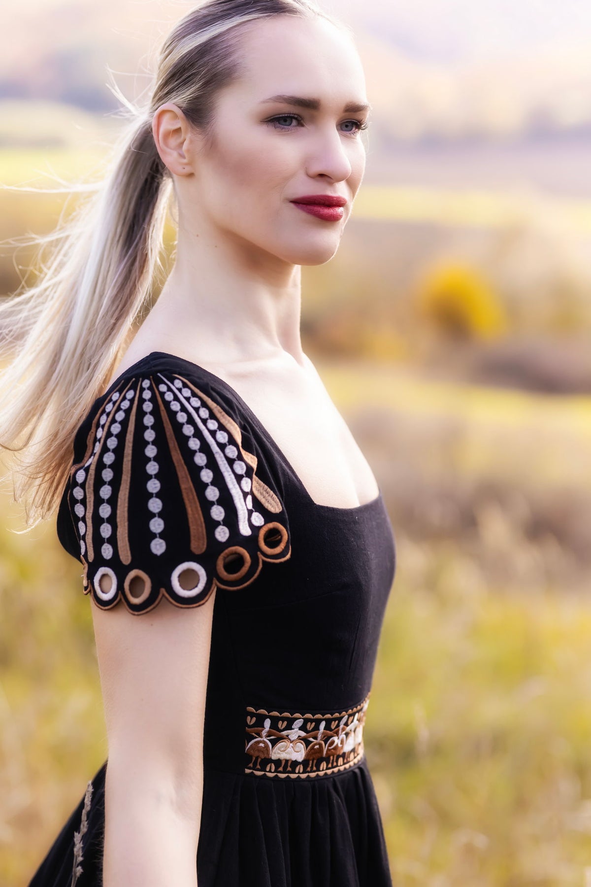 Šaty sa zapínajú vzadu na krytý zips. Sú polopodšité. Strojom vyšívané, motív inšpirovaný pozdišovskou keramikou. Ručne vystrihované rukávy.