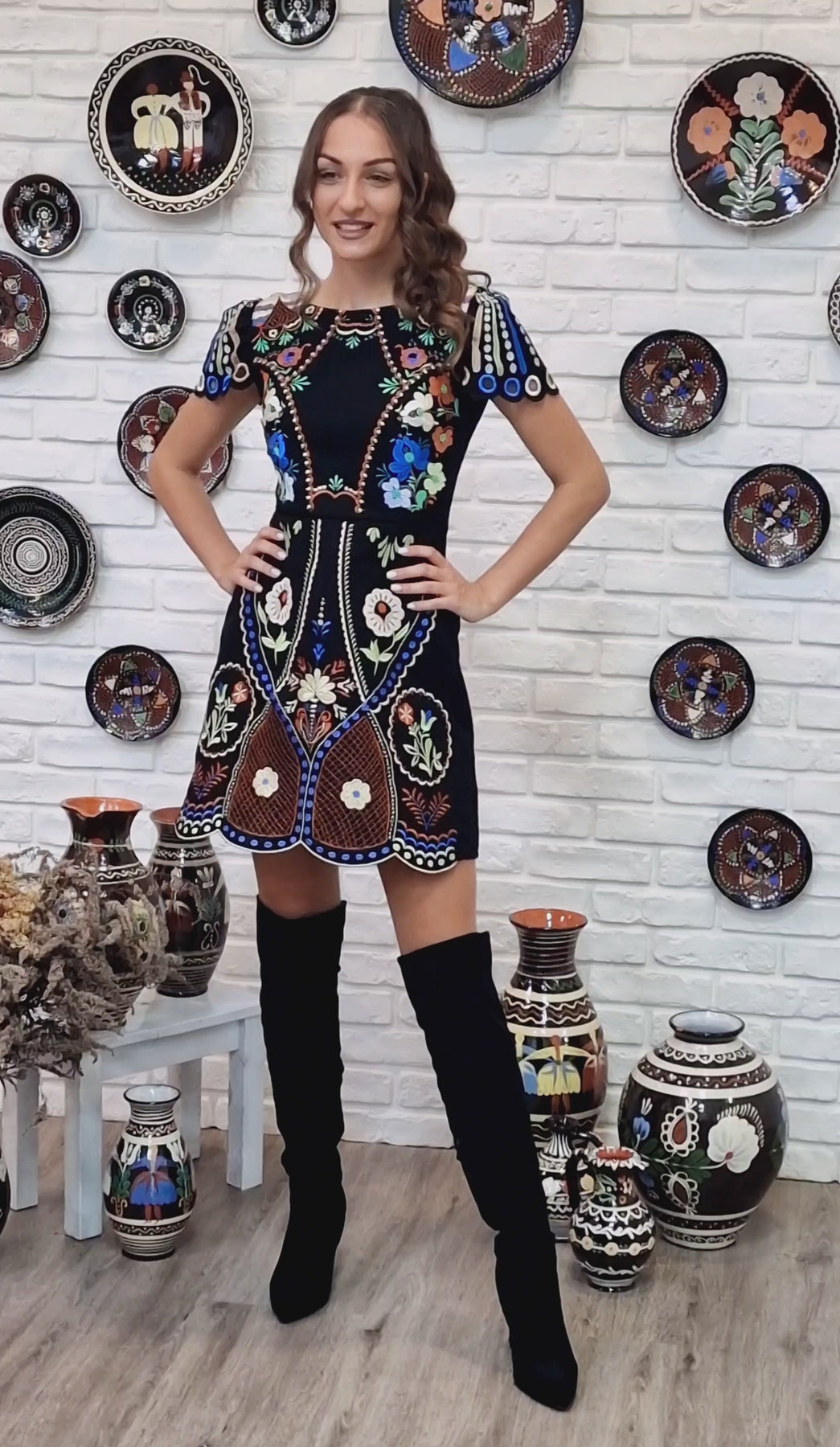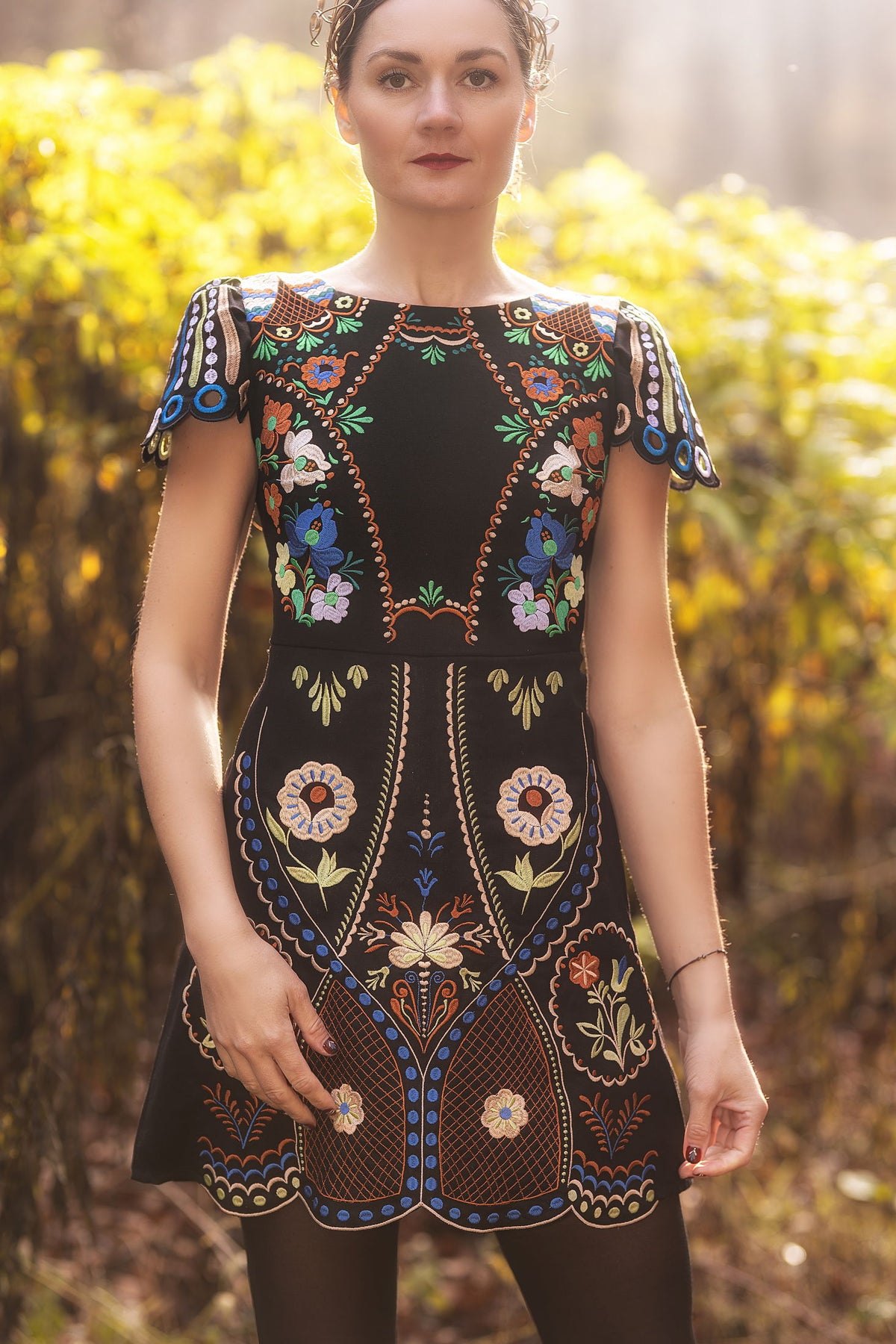 Šaty sa zapínajú vzadu na krytý zips. Sú polopodšité. Strojom vyšívané, motív inšpirovaný pozdišovskou keramikou. Ručne vystrihované rukávy.