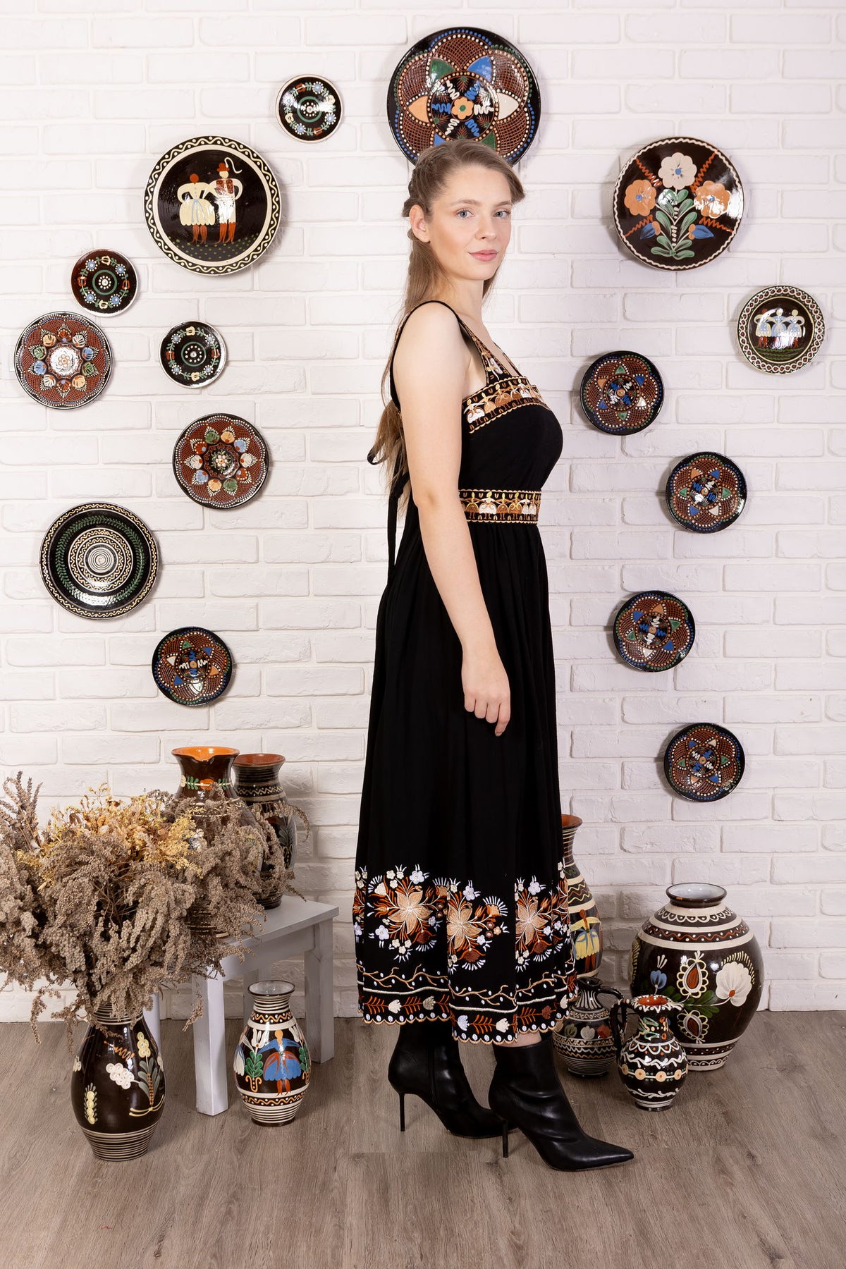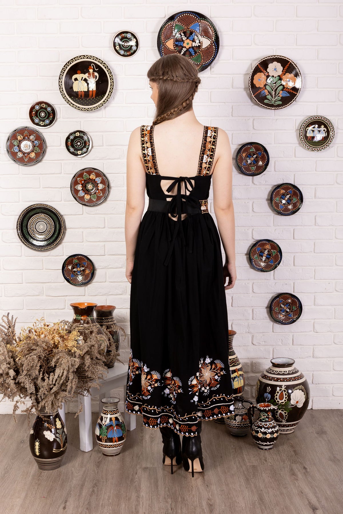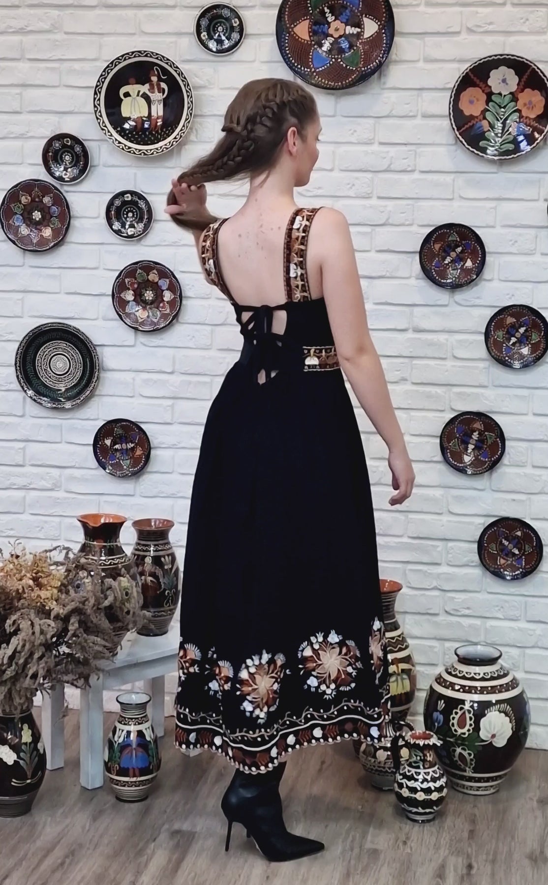 Šaty sa zapínajú vzadu na krytý zips a viazanie. Živôtik podšitý, sukňa nepodšitá. Strojom vyšívané, autorská výšivka inšpirovaná motívmi pozdišovskej keramiky.
