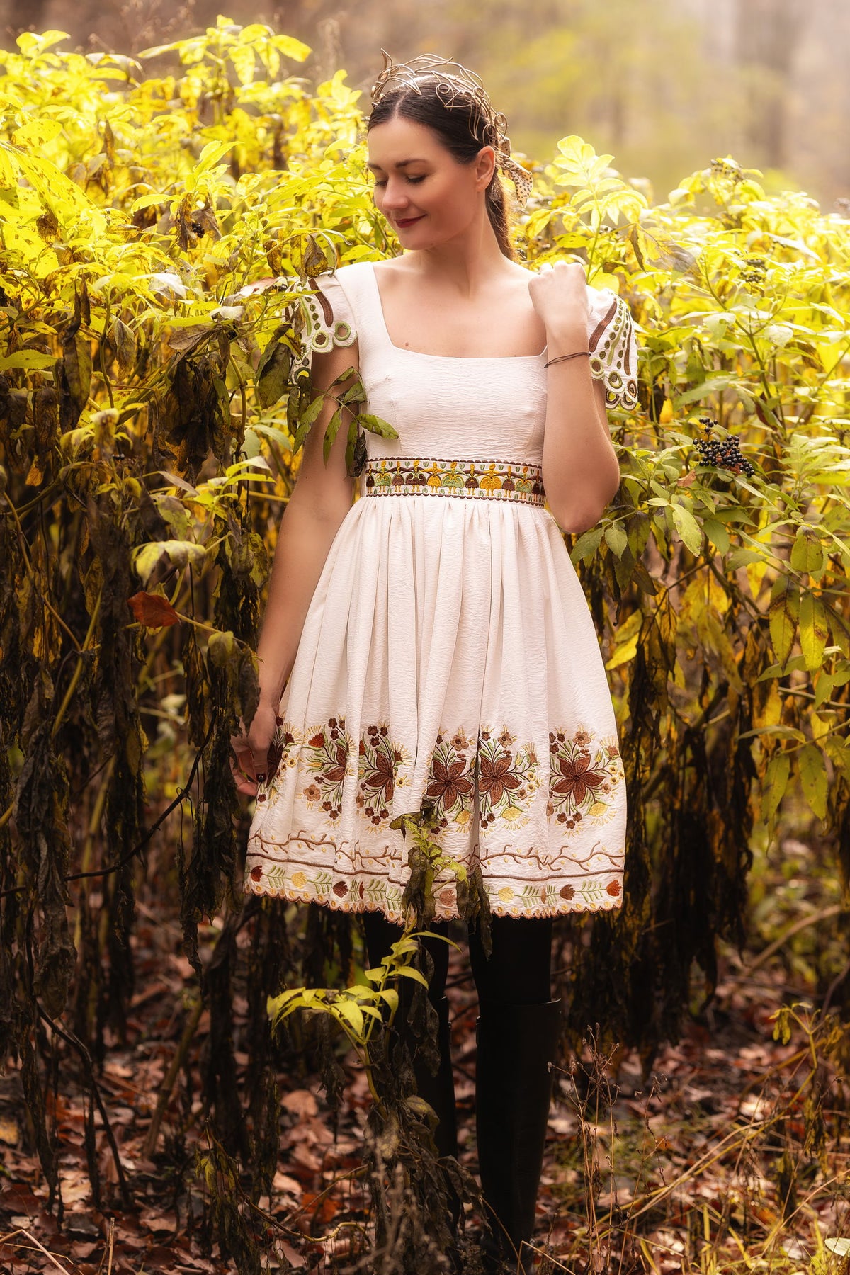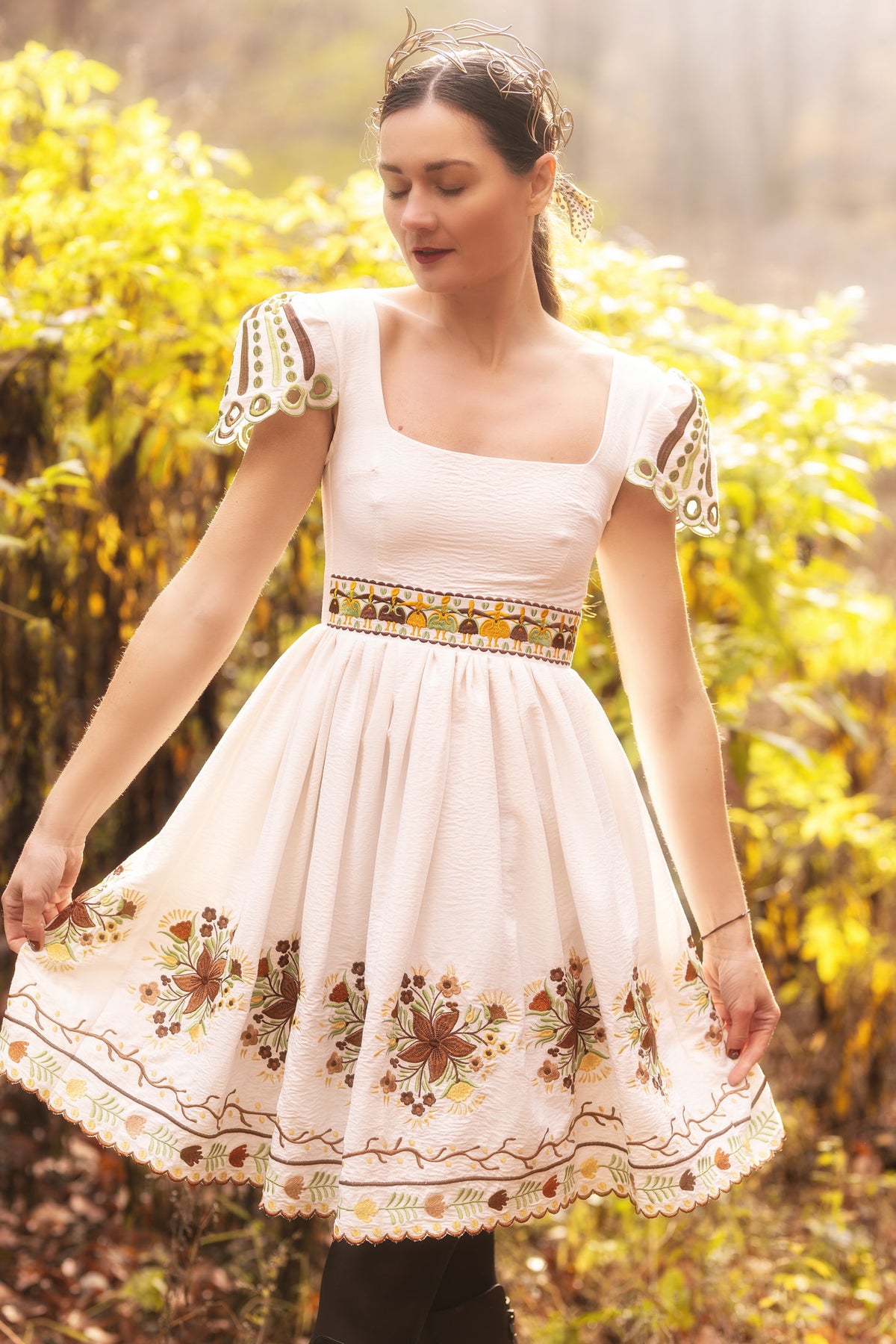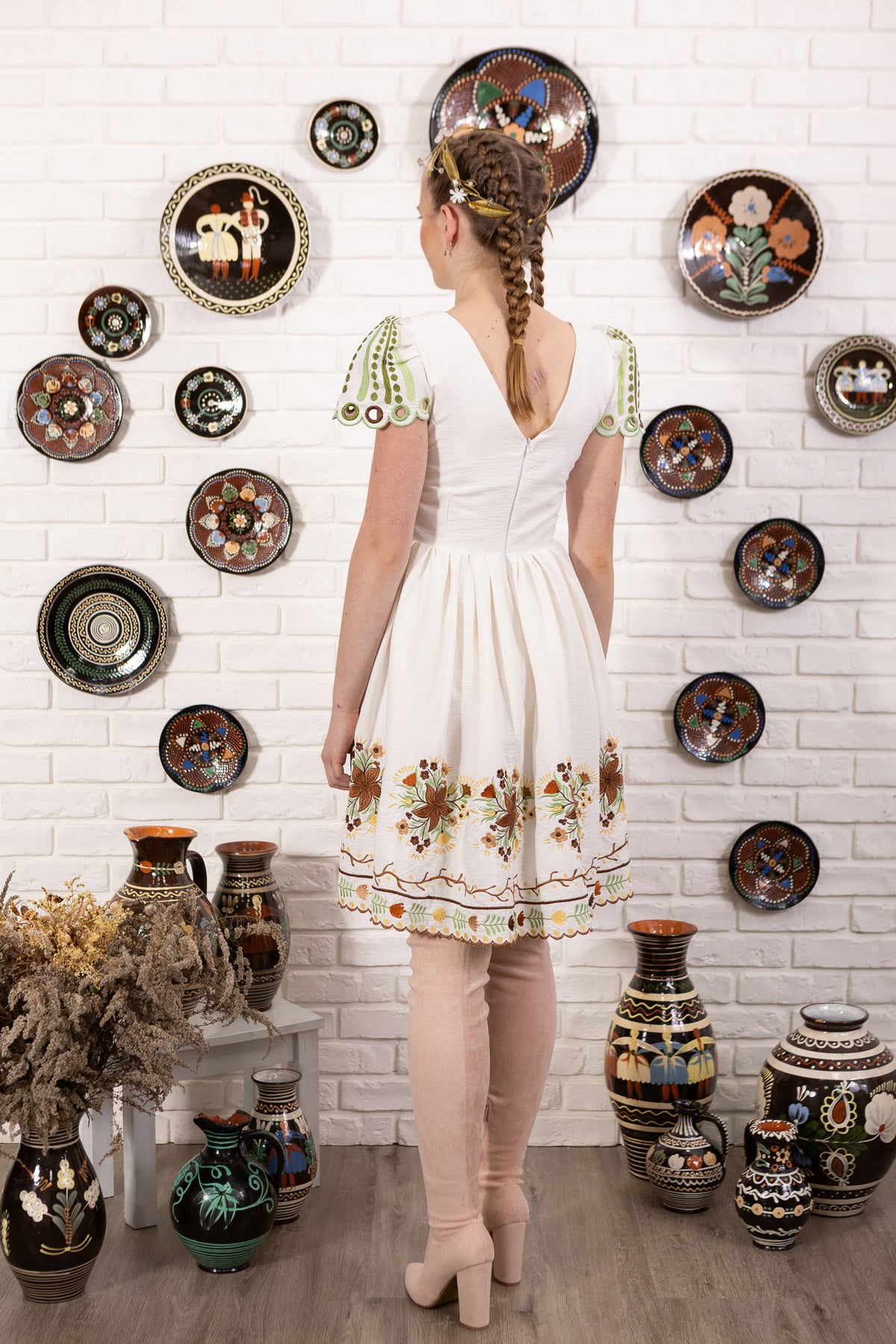 Šaty sa zapínajú vzadu na krytý zips, podšité. Strojovo vyšívané, motív inšpirovaný pozdišovskou keramikou. Rukávy ručne vystrihované.