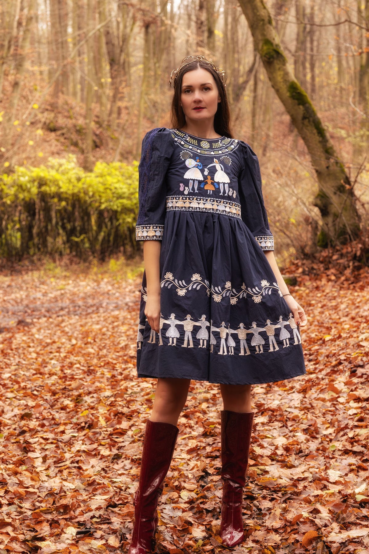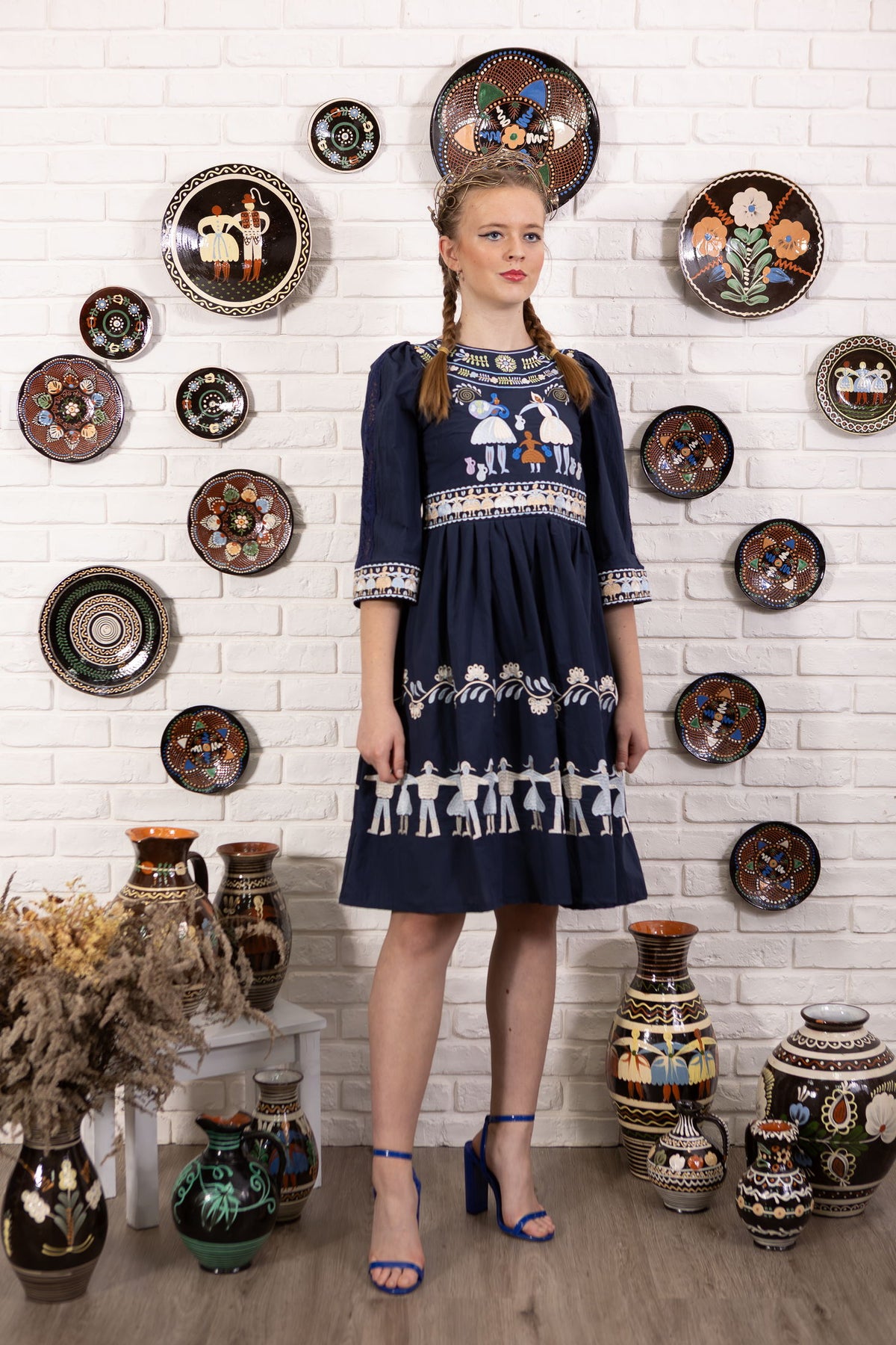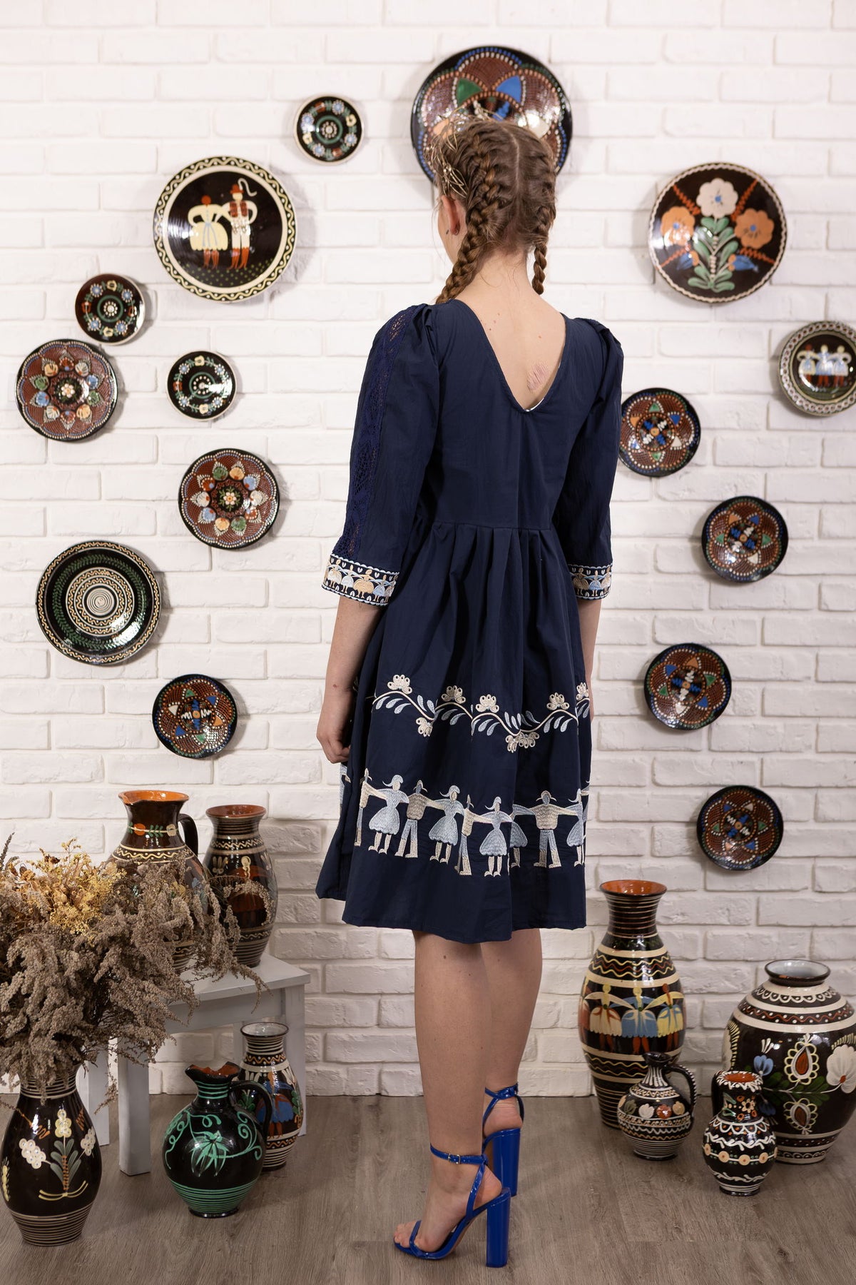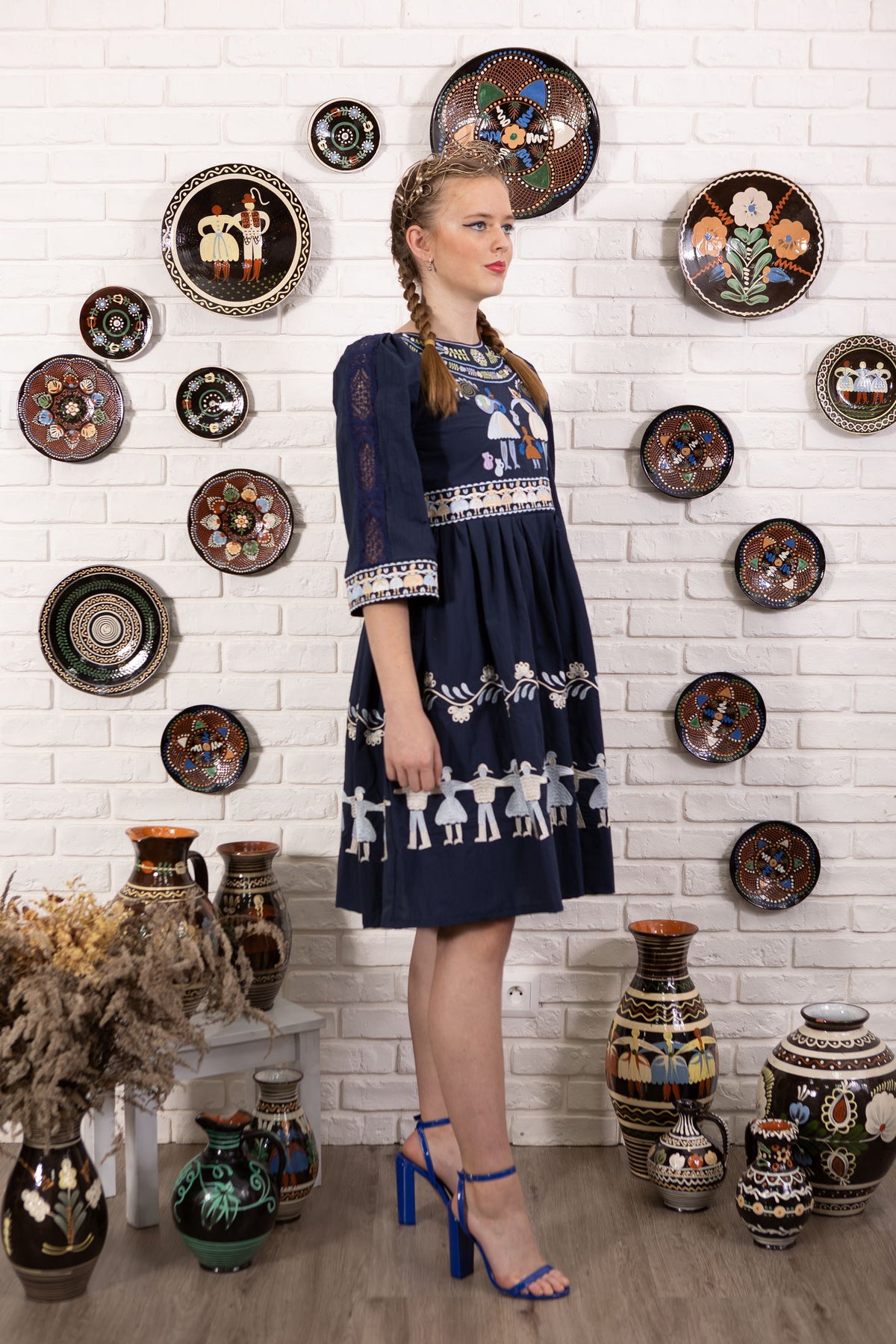 Polopodšité šaty, zapínanie zboku na zips. Strojovo vyšívané, motív výšivky inšpirovaný pozdišovskou keramikou. Voľné rukávy zdobené čipkou.