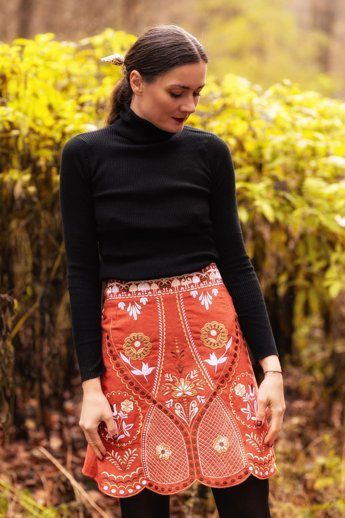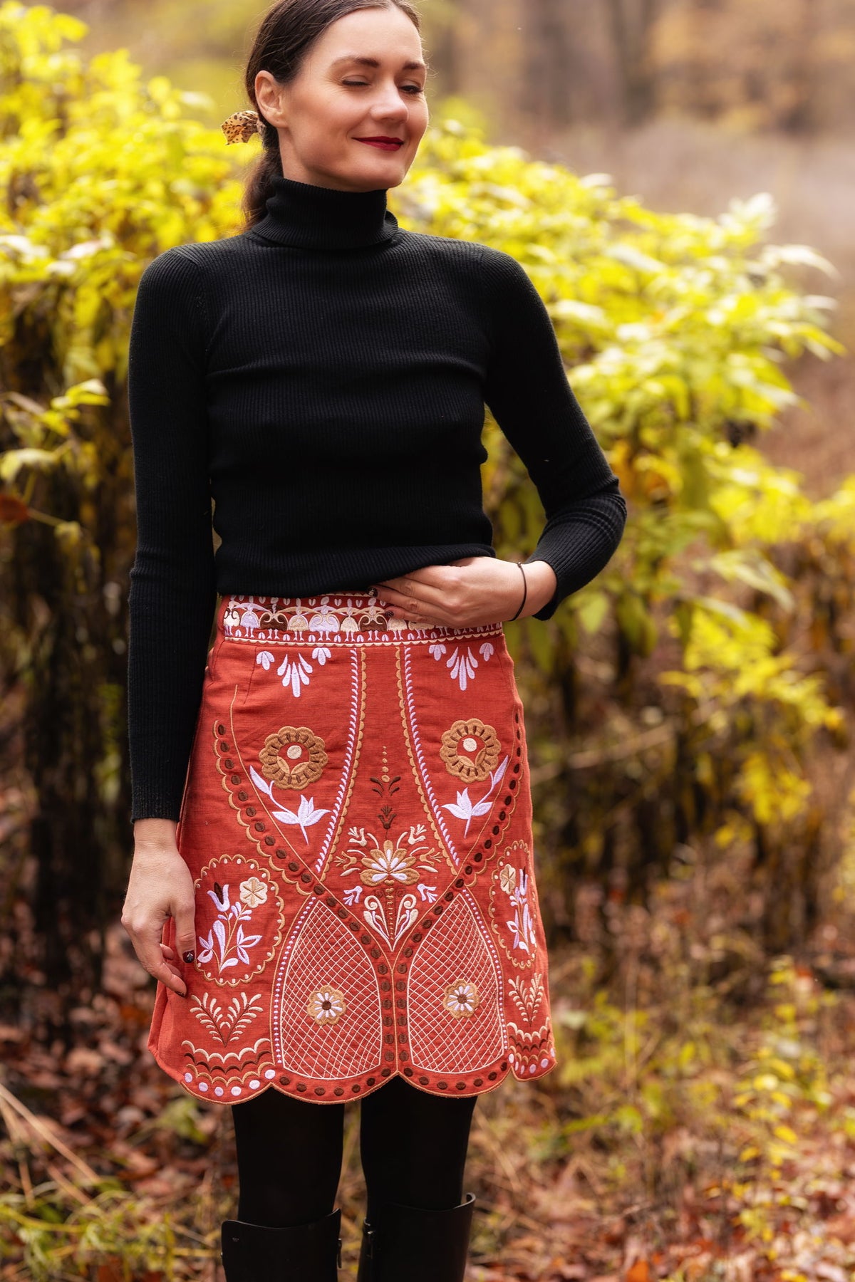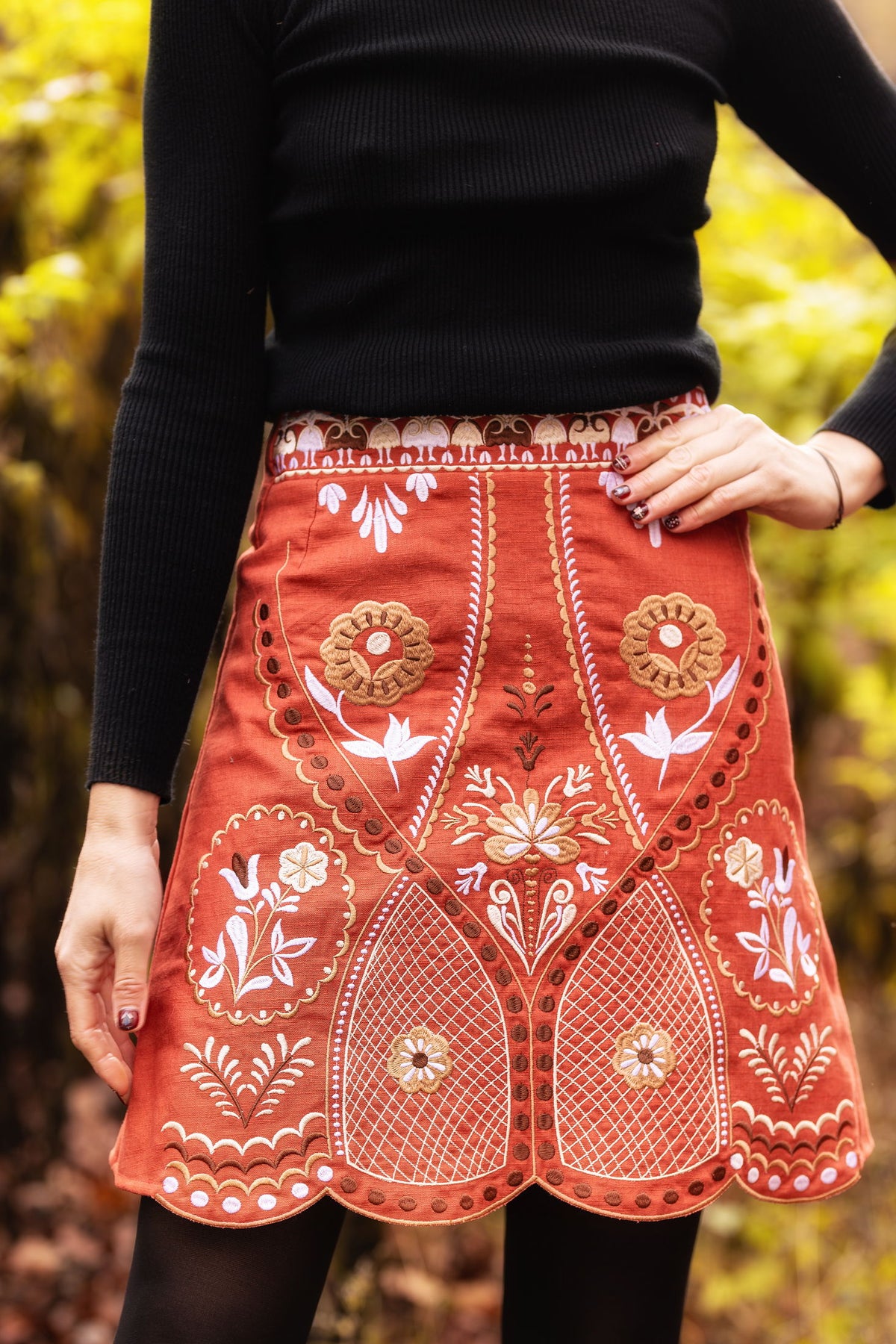 Strojovo vyšívaná sukňa, polopodšitá. Autorská výšivka inšpirovaná motívmi pozdišovskej keramiky.
