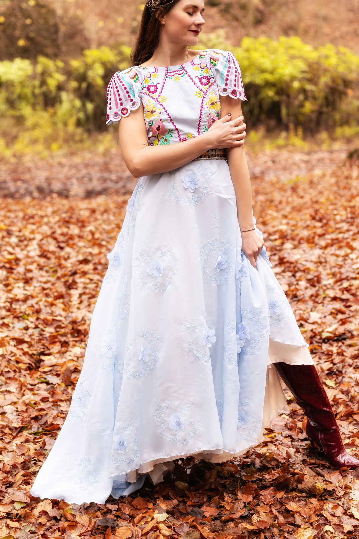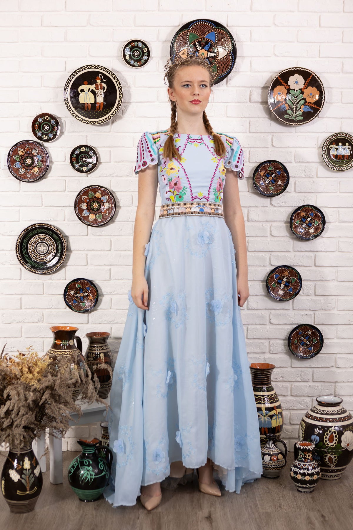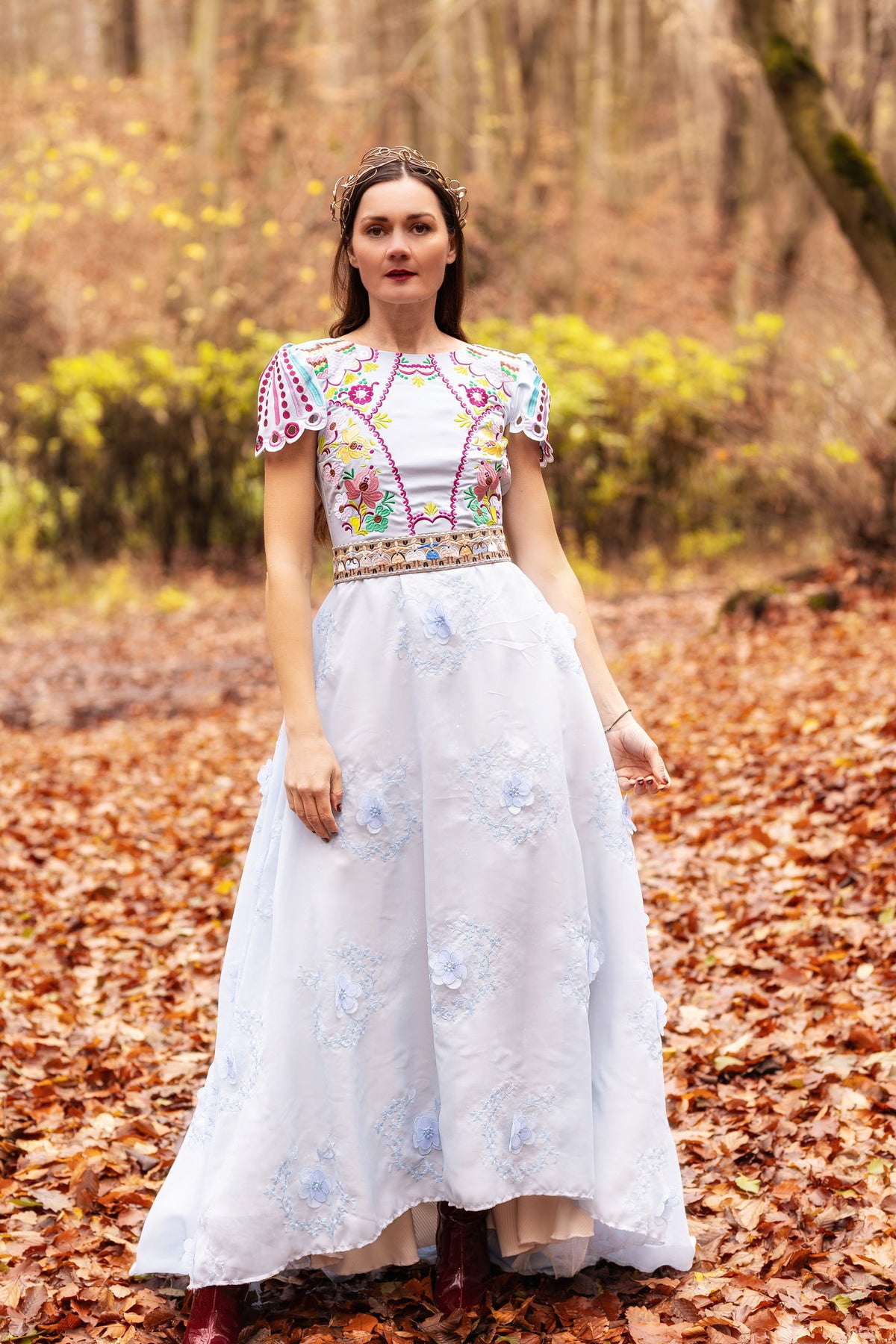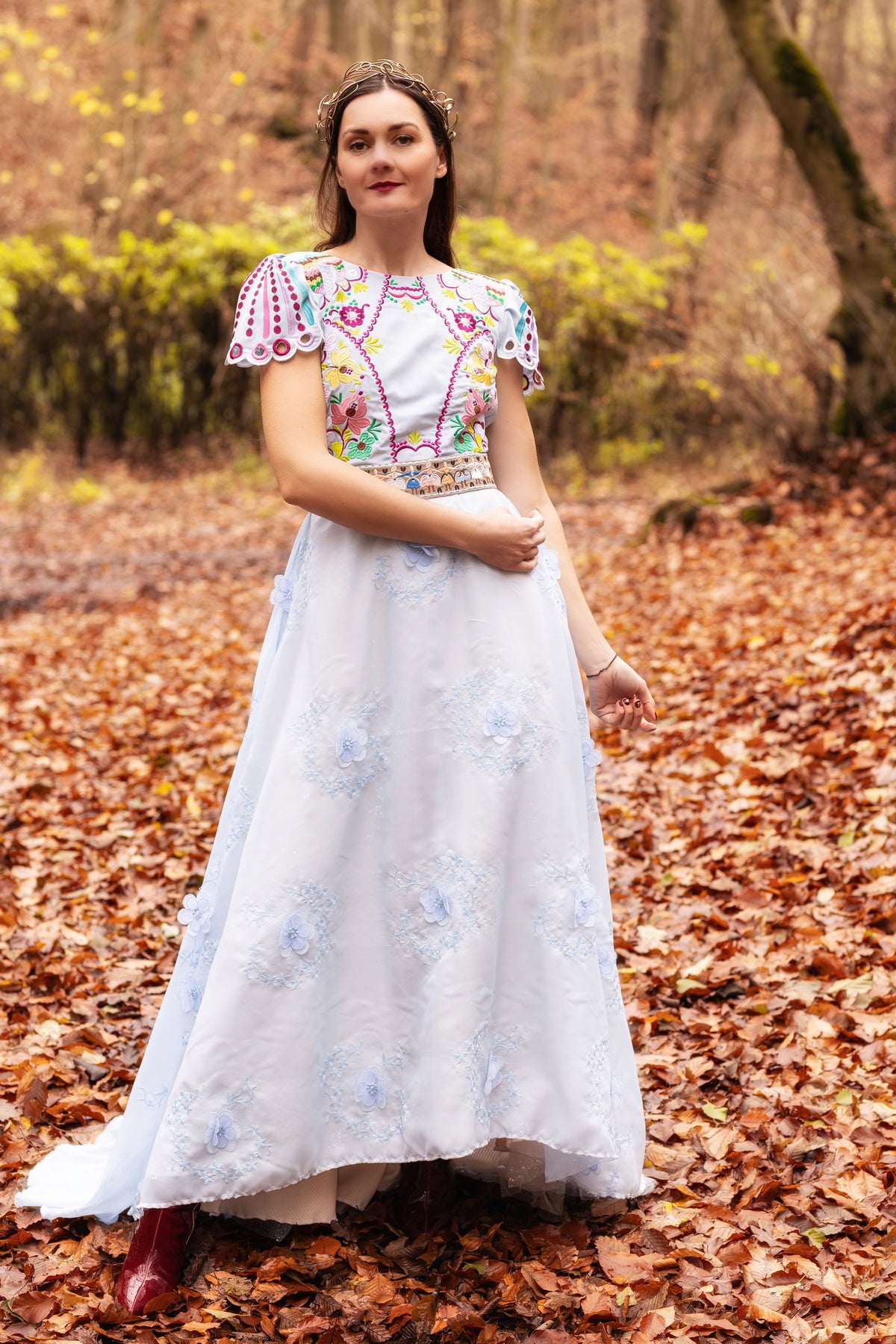 Podšité šaty, zapínajú sa vzadu na zips. Vpredu lodičkový výstrih, vzadu hlboký výstrih do písmena V. Strojovo vyšívané, motív výšivky inšpirovaný pozdišovskou keramikou. Rukávy ručne vystrihované. Sukňa viacvrstvová, vlečková.