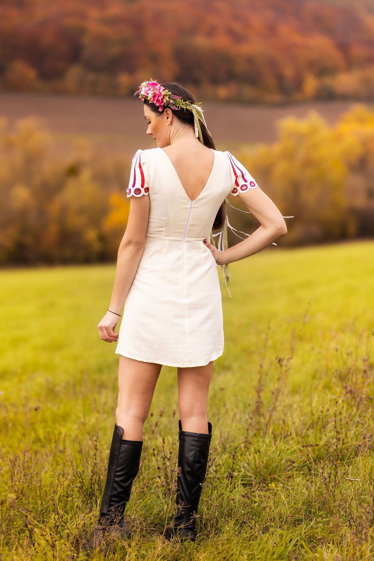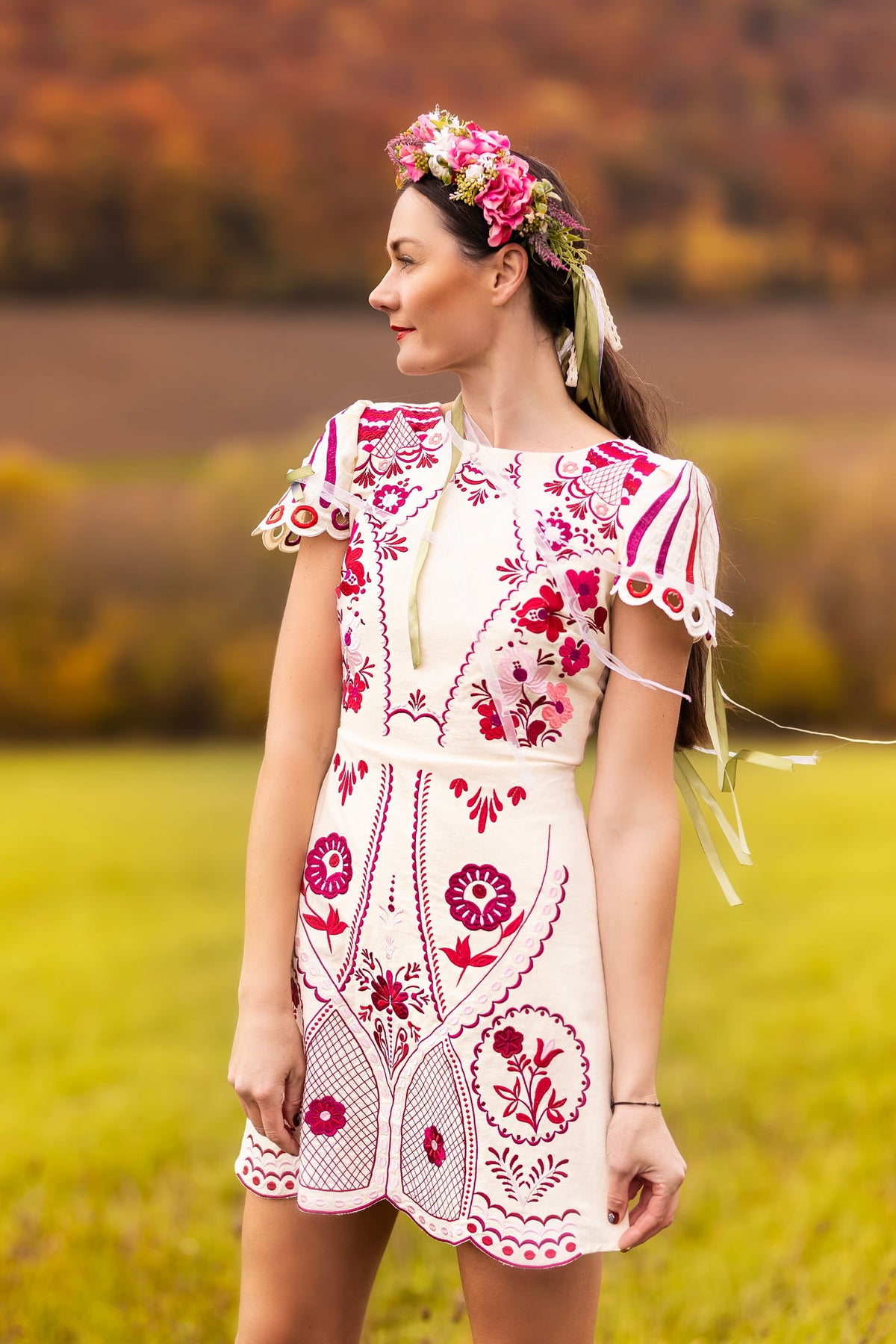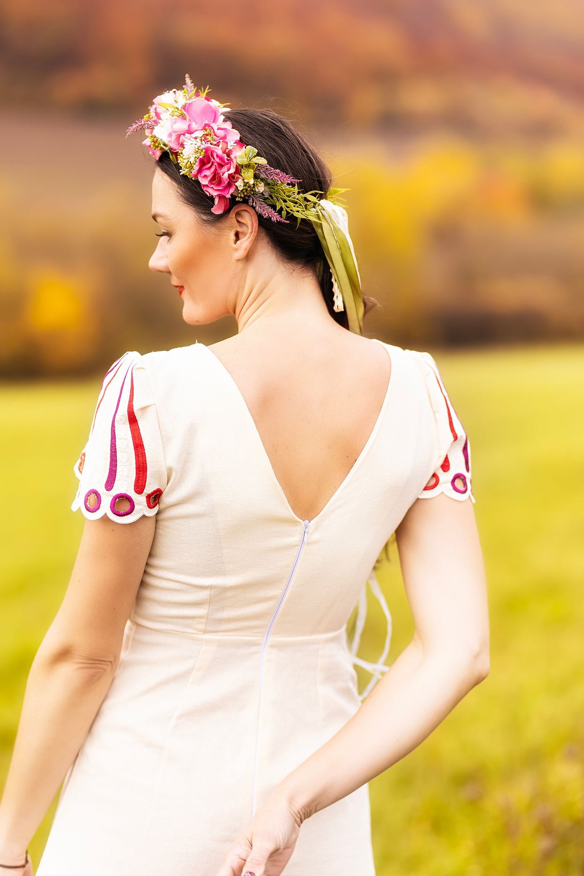 Šaty sa zapínajú sa vzadu na krytý zips a viazanie, podšité. Strojom vyšívané, motív výšivky inšpirovaný pozdišovskou keramikou. Ručne vystrihované madeirové rukávy.