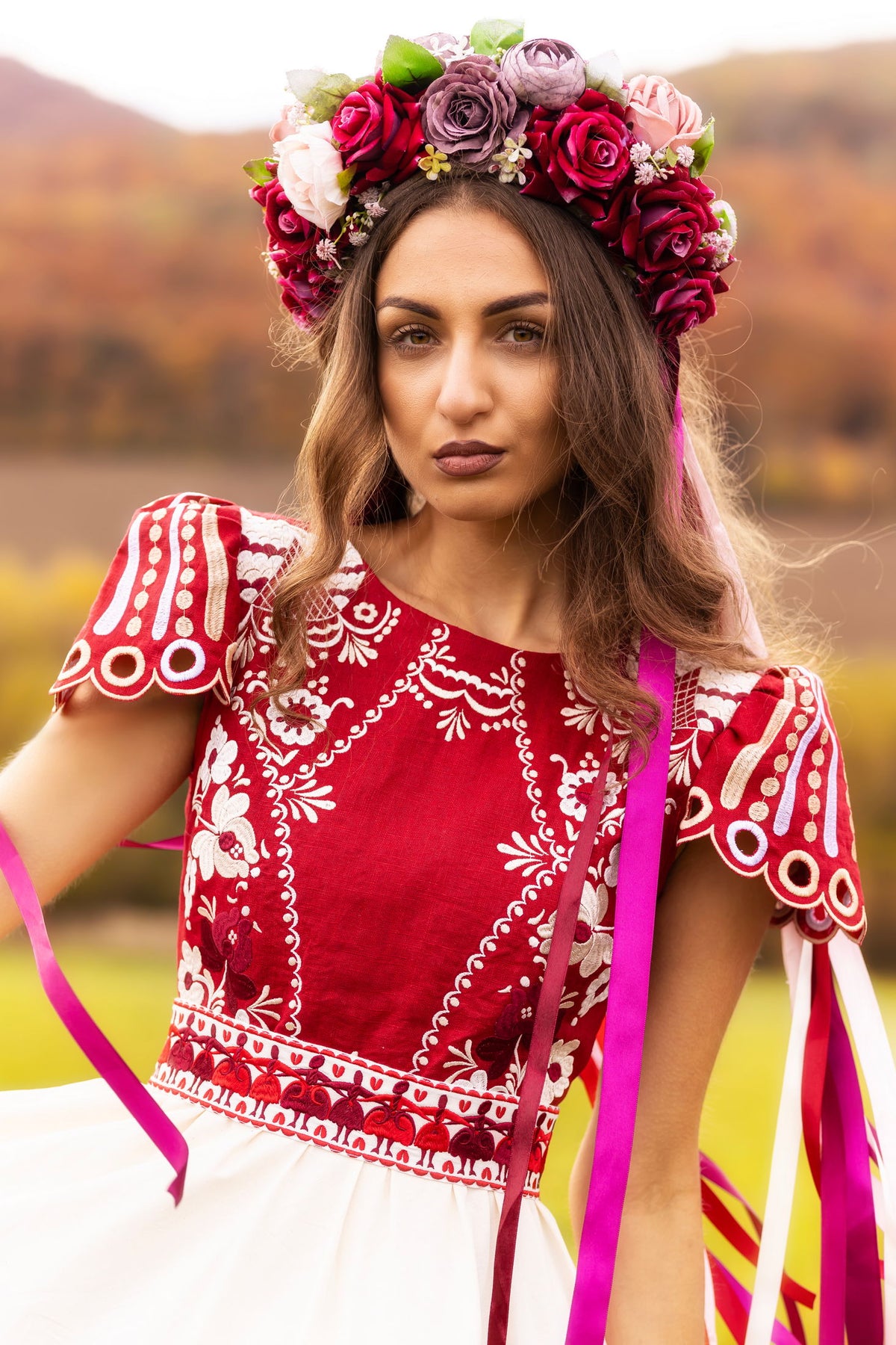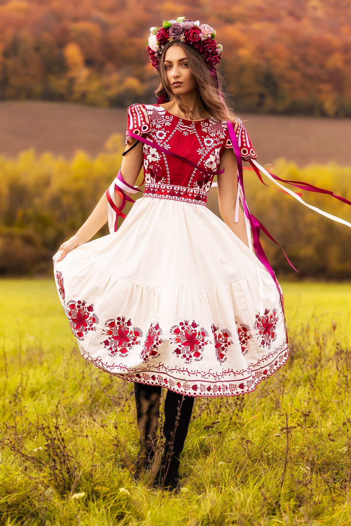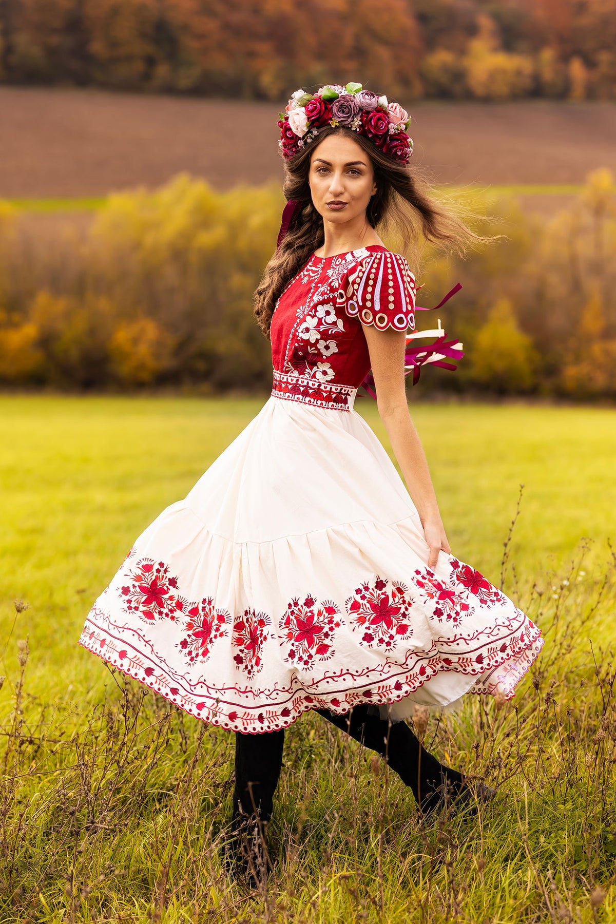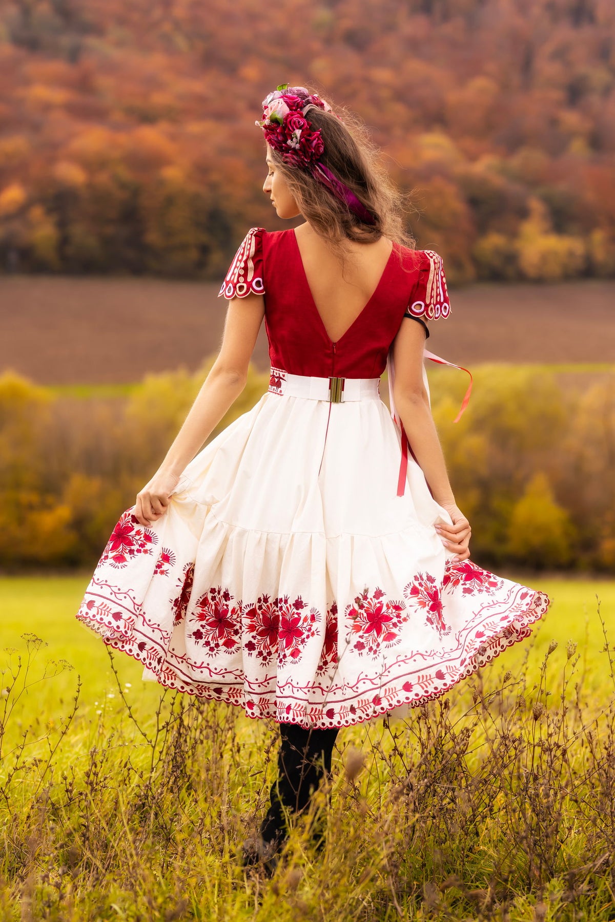 Šaty sa zapínajú sa vzadu na krytý zips, podšité. Strojom vyšívané, motív výšivky inšpirovaný pozdišovskou keramikou. Ručne vystrihované rukávy, sukňa nadvihnutá tylom.