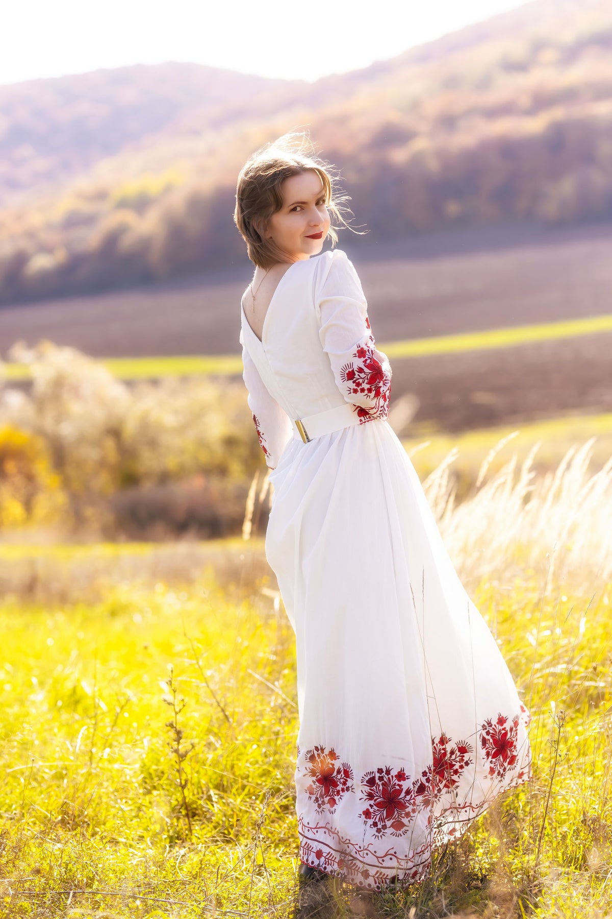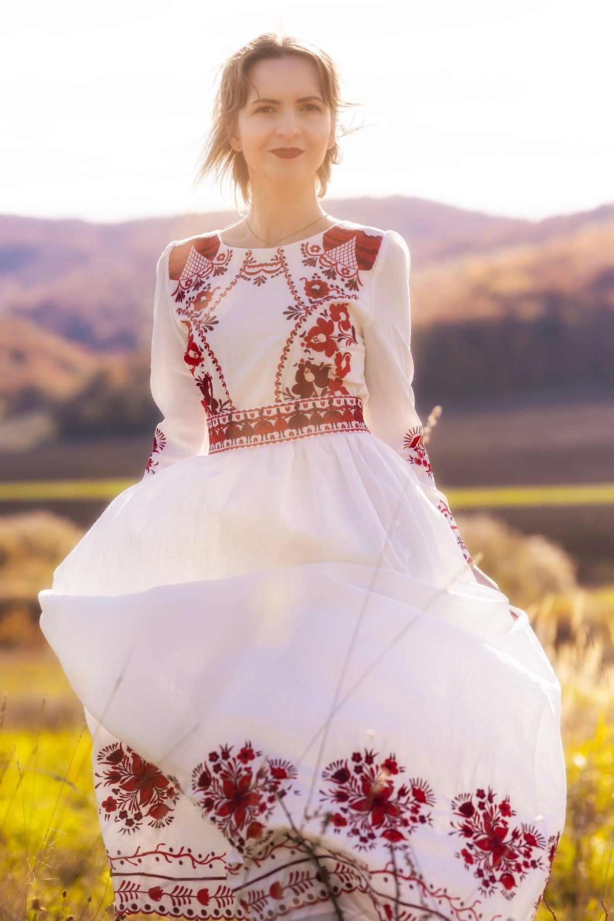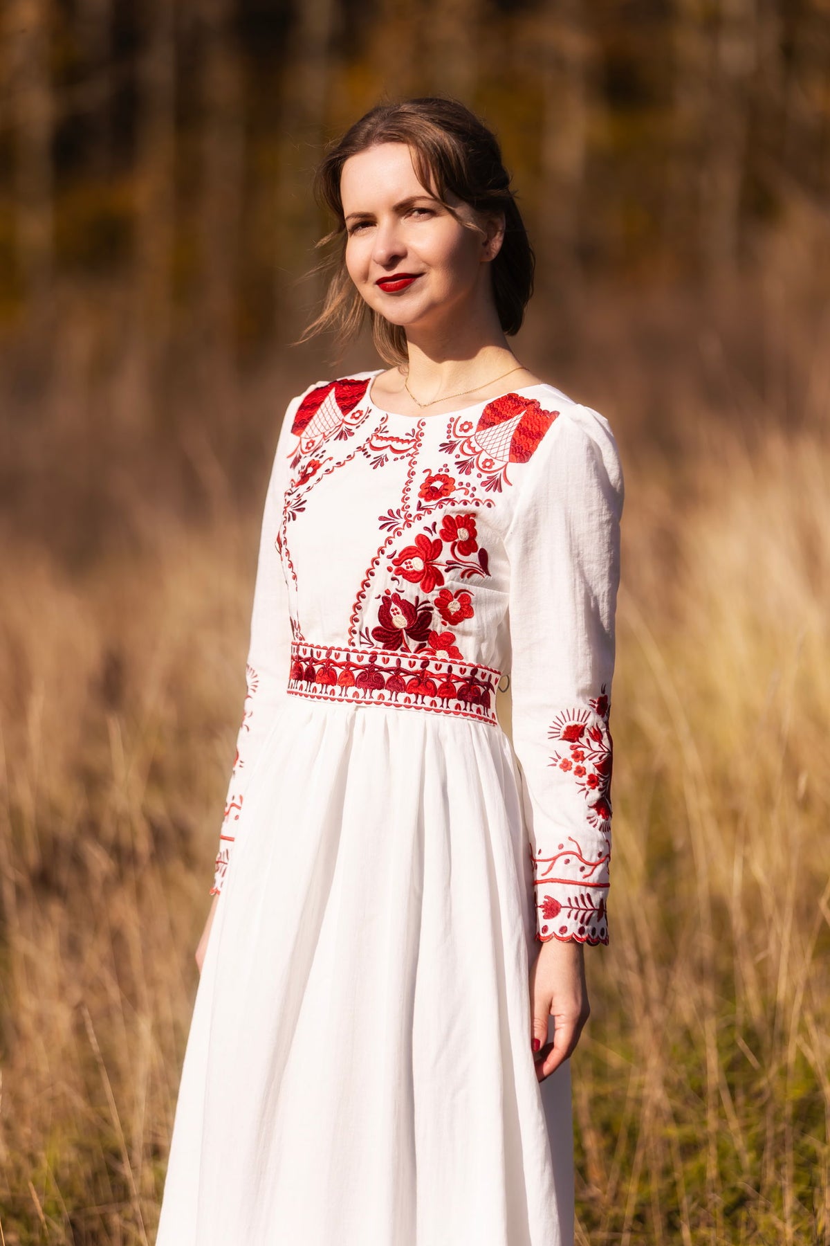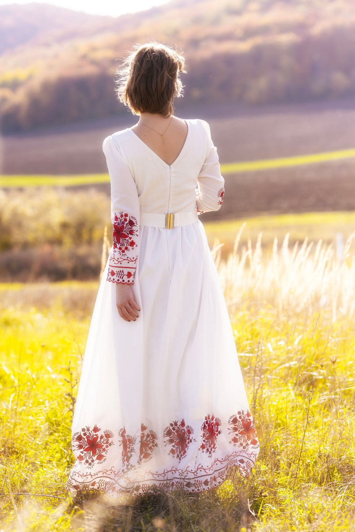 Šaty sa zapínajú na krytý zips, podšité. Strojom vyšívané, motív výšivky inšpirovaný pozdišovskou keramikou.