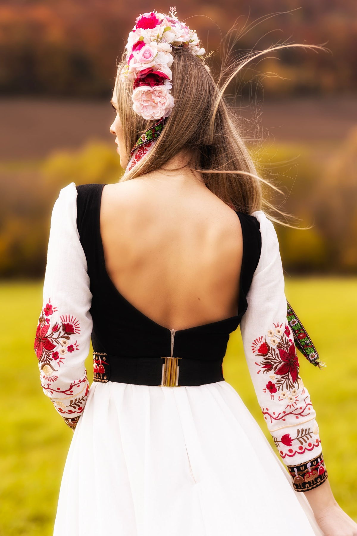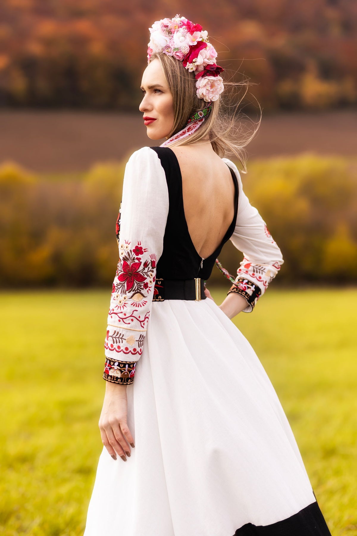 Šaty sa zapínajú na krytý zips, podšité. Strojom vyšívané, motív výšivky inšpirovaný pozdišovskou keramikou. Rukávy zakončené manžetou. Sukňa jemne nadvihnutá tylom.