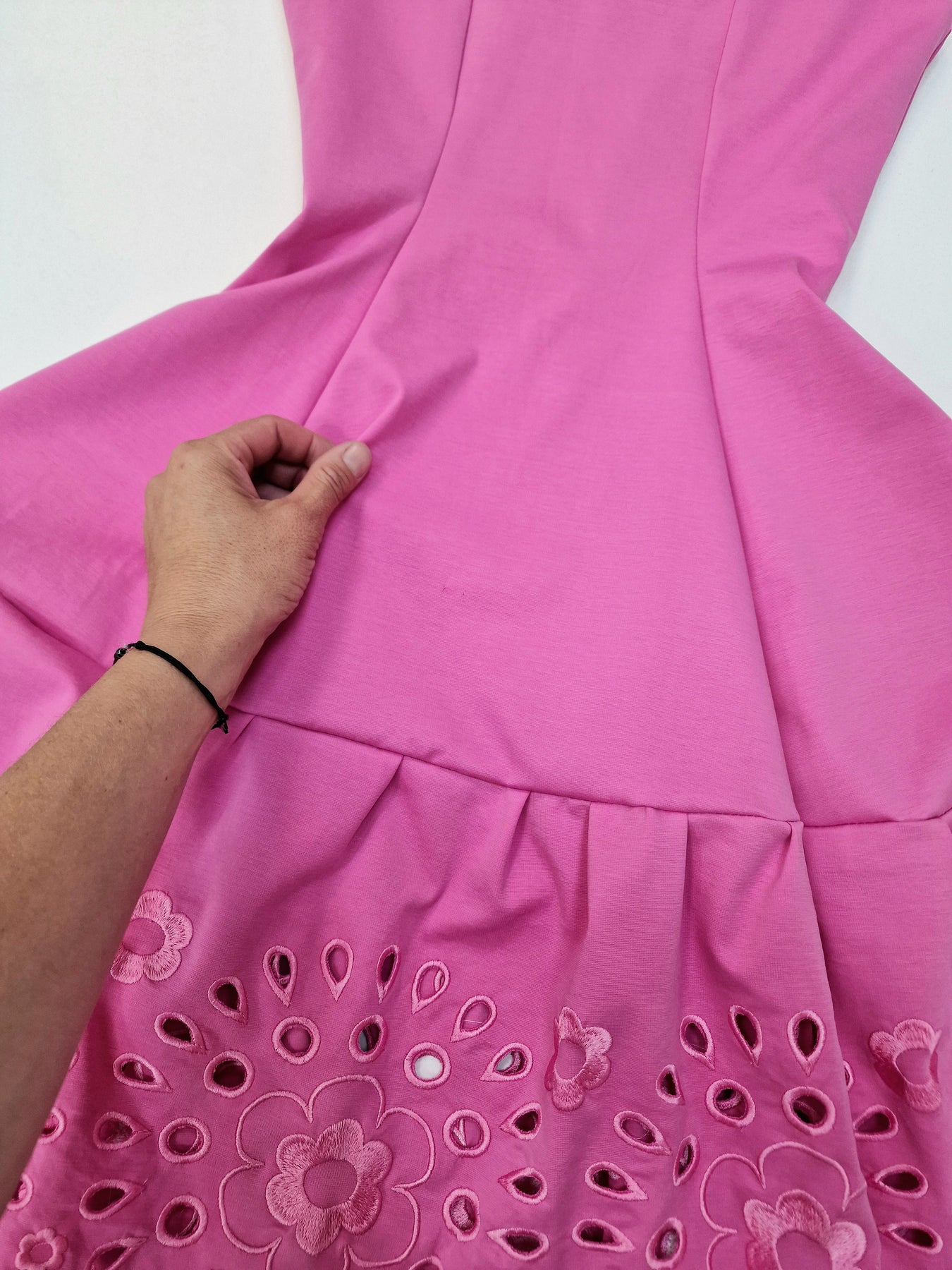 Šaty sa zapínajú vzadu na zips, živôtik podšitý. Sukňa ukončená autorskou madeirou, ručne vystrihovanou.