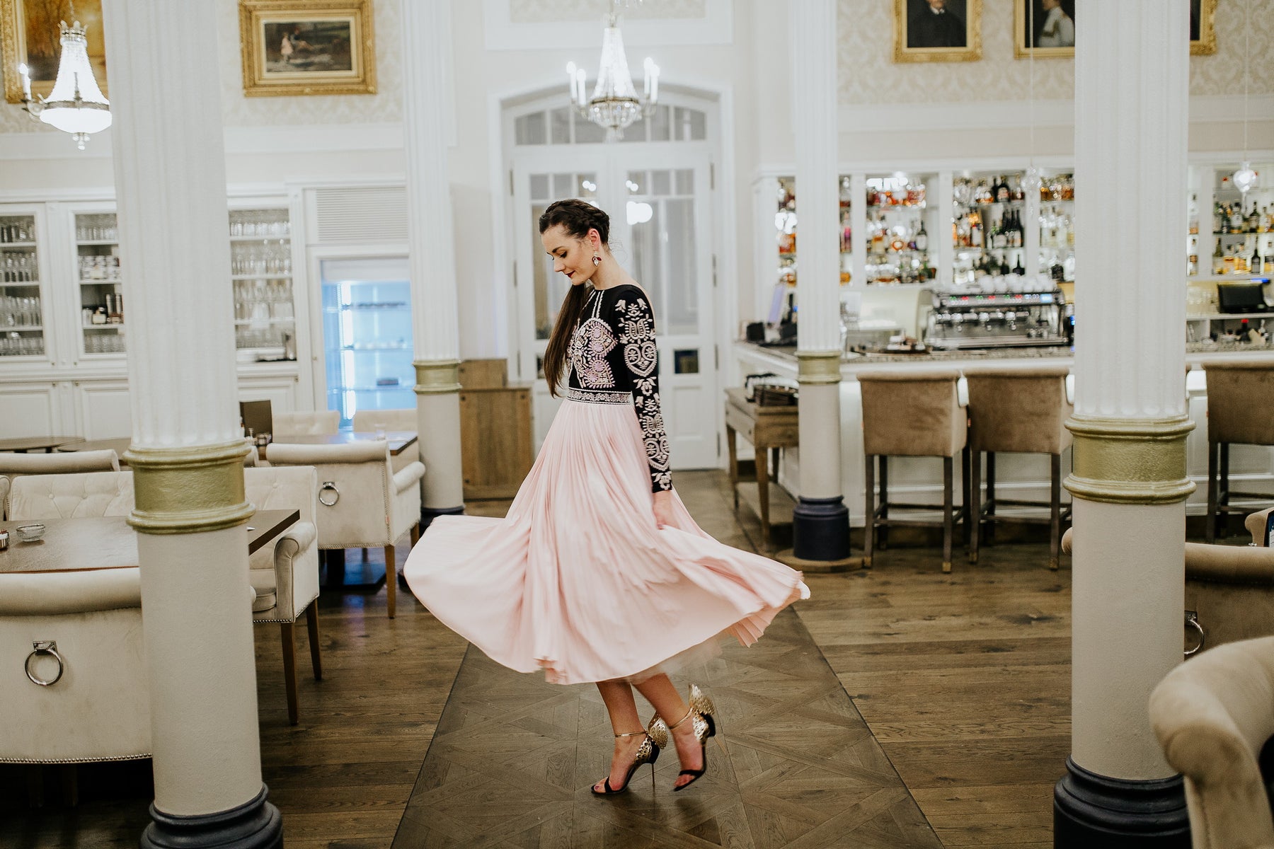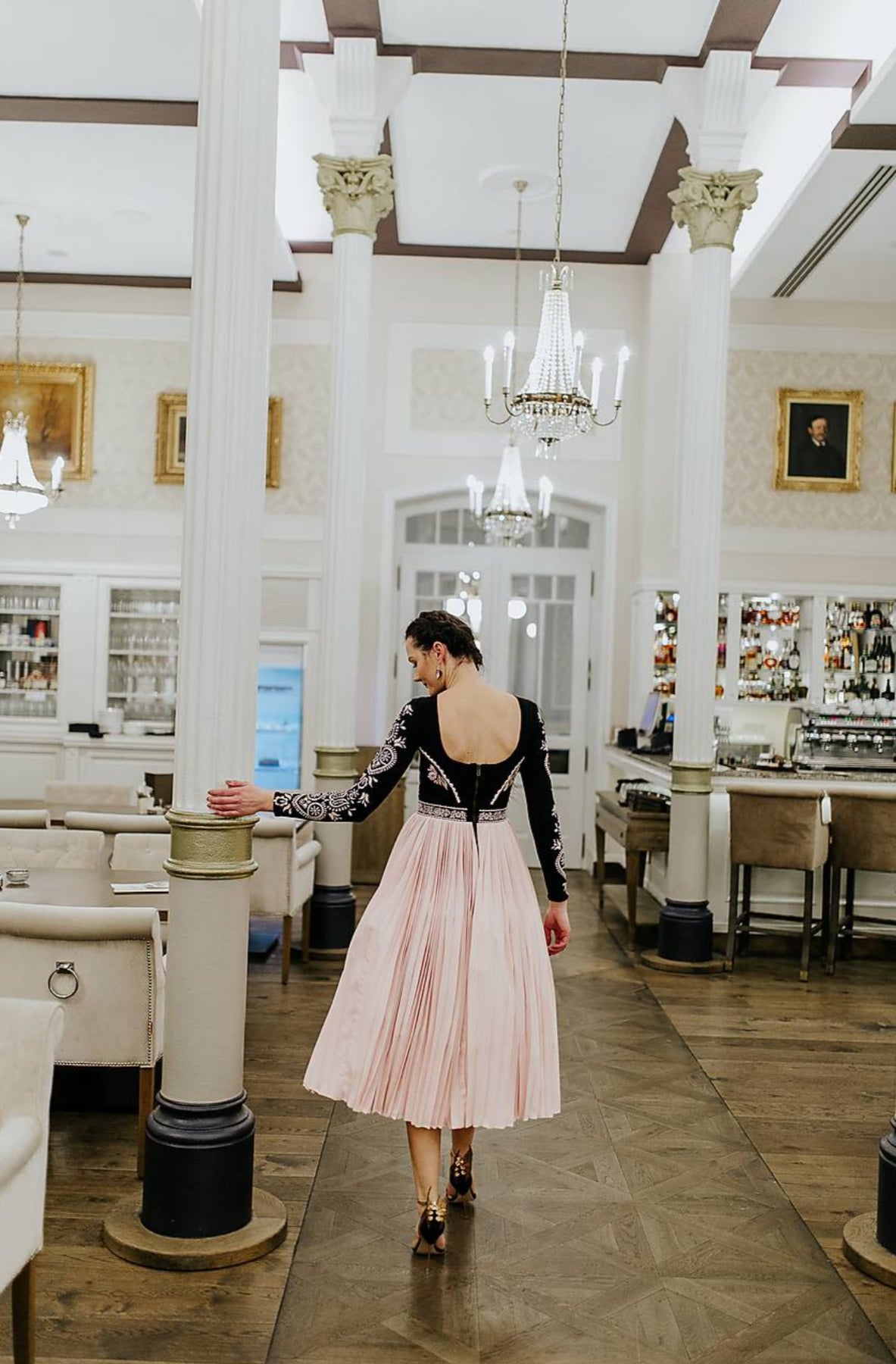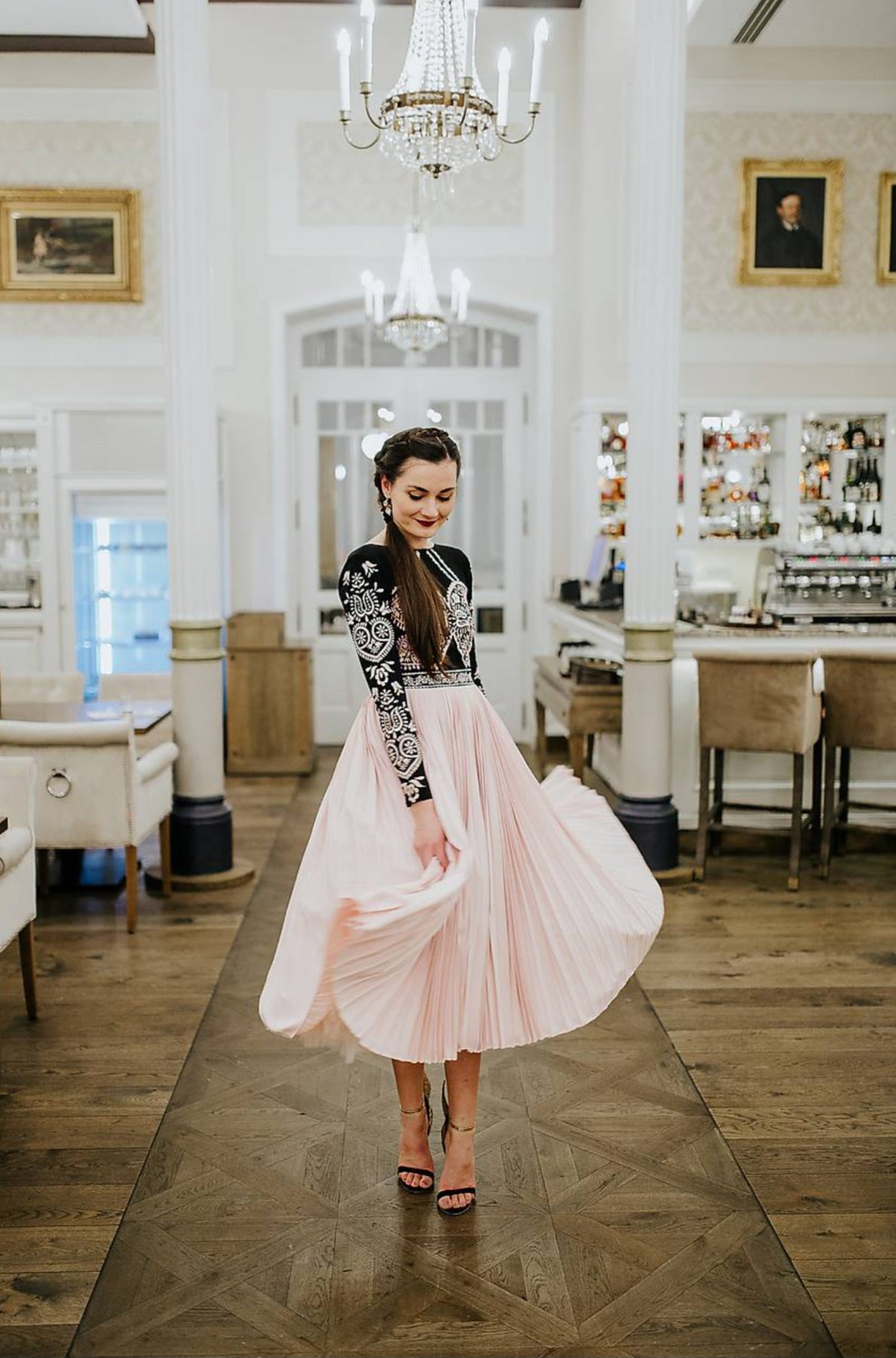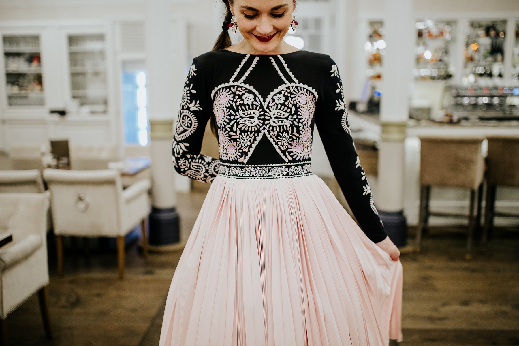 Šaty sa zapínajú vzadu skrytým zipsom, celopodšité. Živôtik ručne vyšívaný, pružný, pásec a rukávy vyšívané strojom. Plisovaná sukňa jemne nadvihnutá tylom.