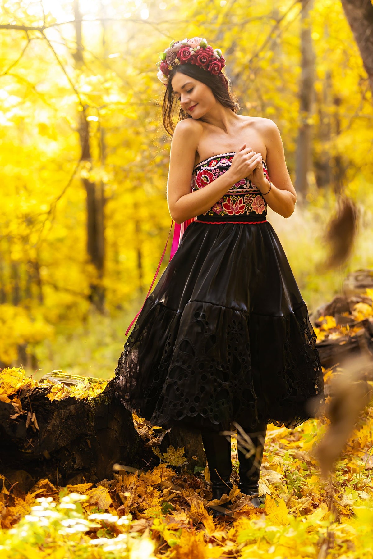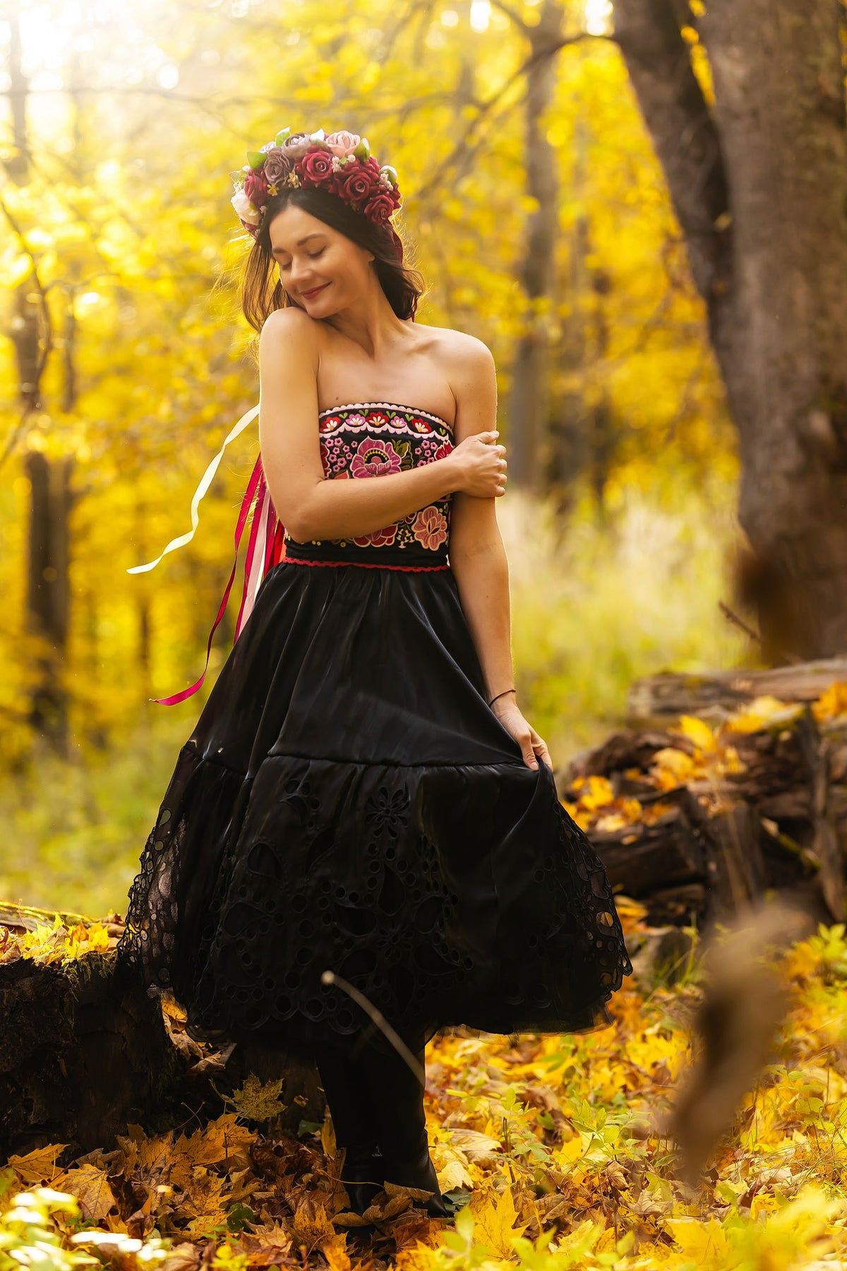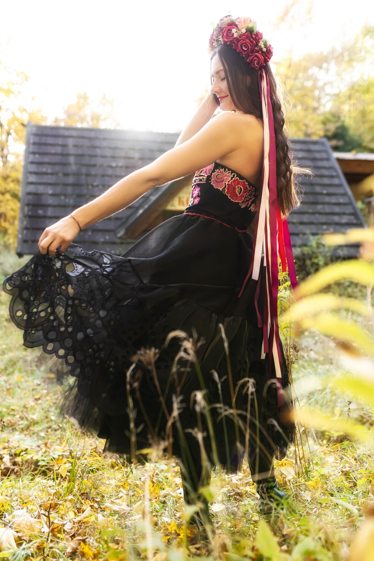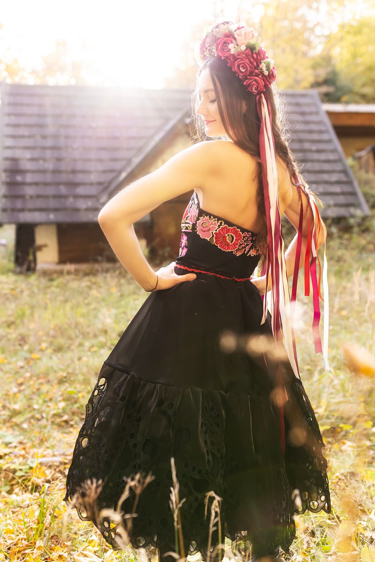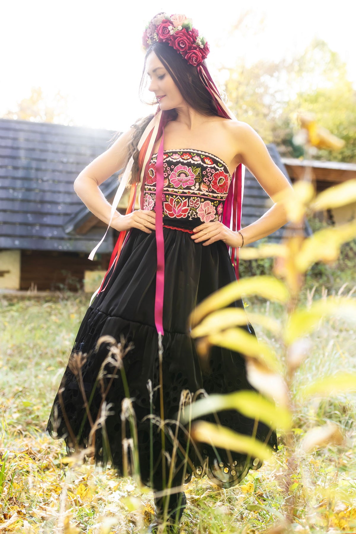 Sukňa je vyšívaná strojovo autorskou madeirou, ručne vystrihovaná, zapínanie vzadu na zips, pásec pružný. Viacvrstvová, nadvihnutá tylom.