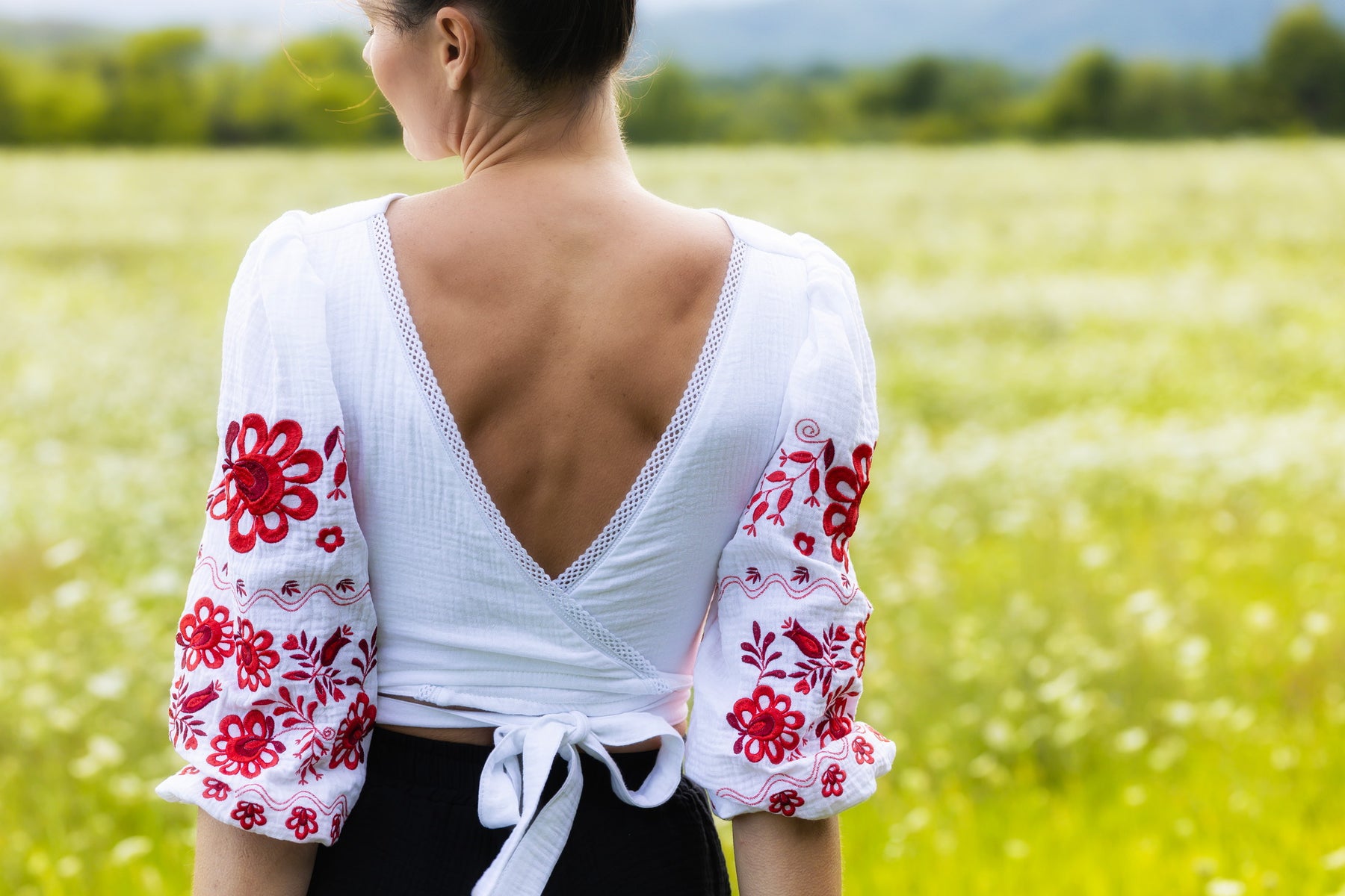 Podšitý zavinovací crop top. Spodok zdobený paličkovanou čipkou. Nepodšité rukávy sú strojom vyšívané, stiahnuté gumkou.