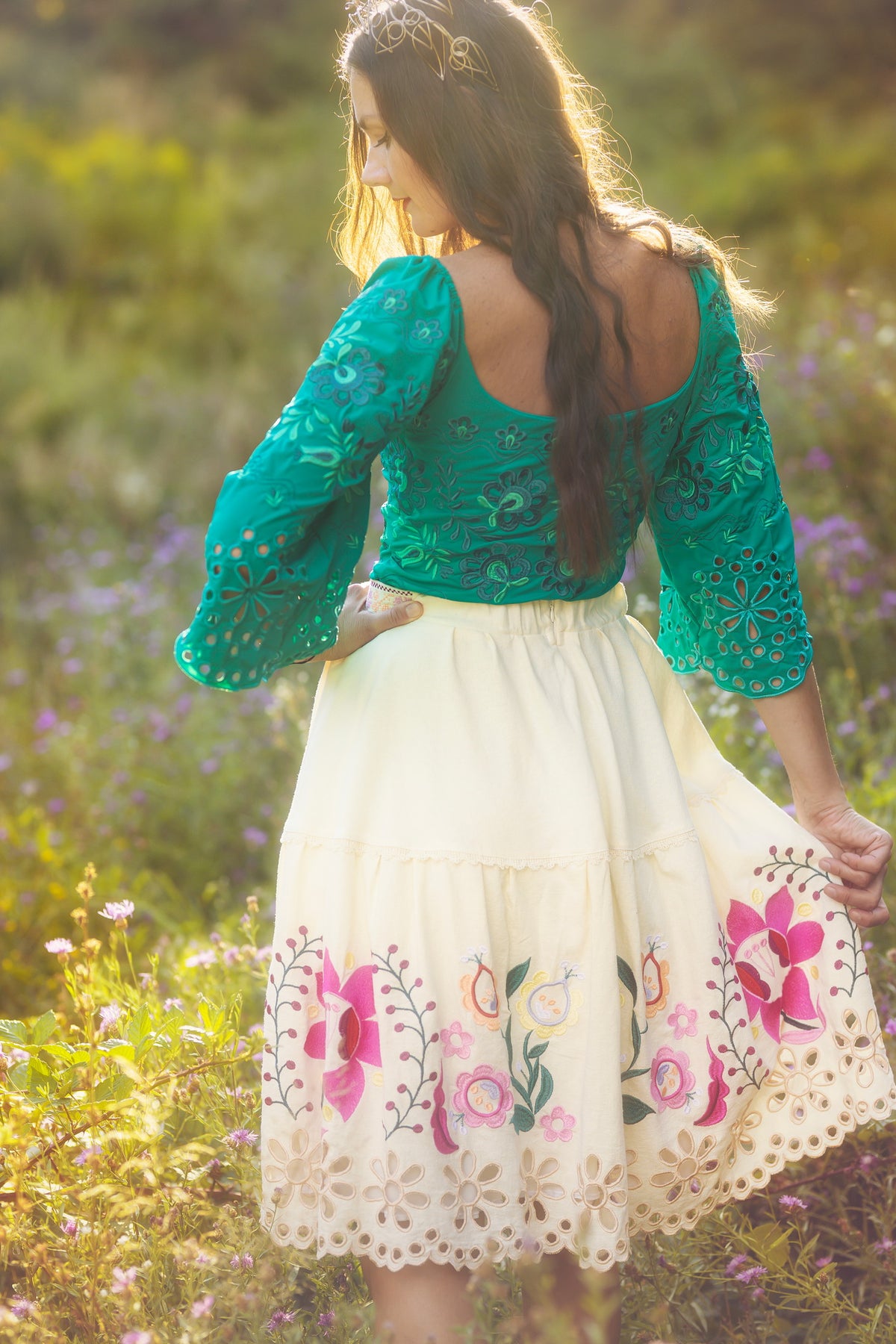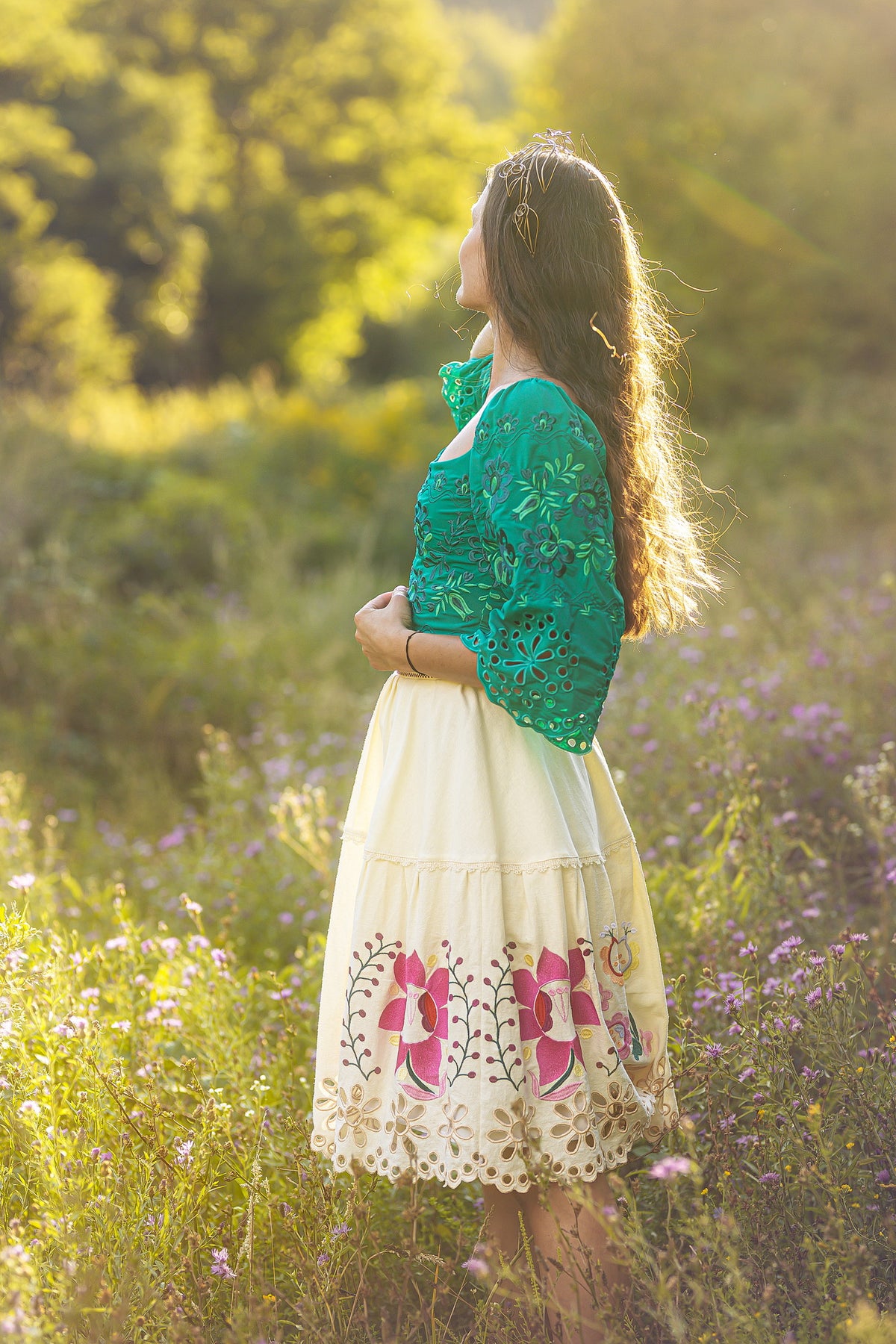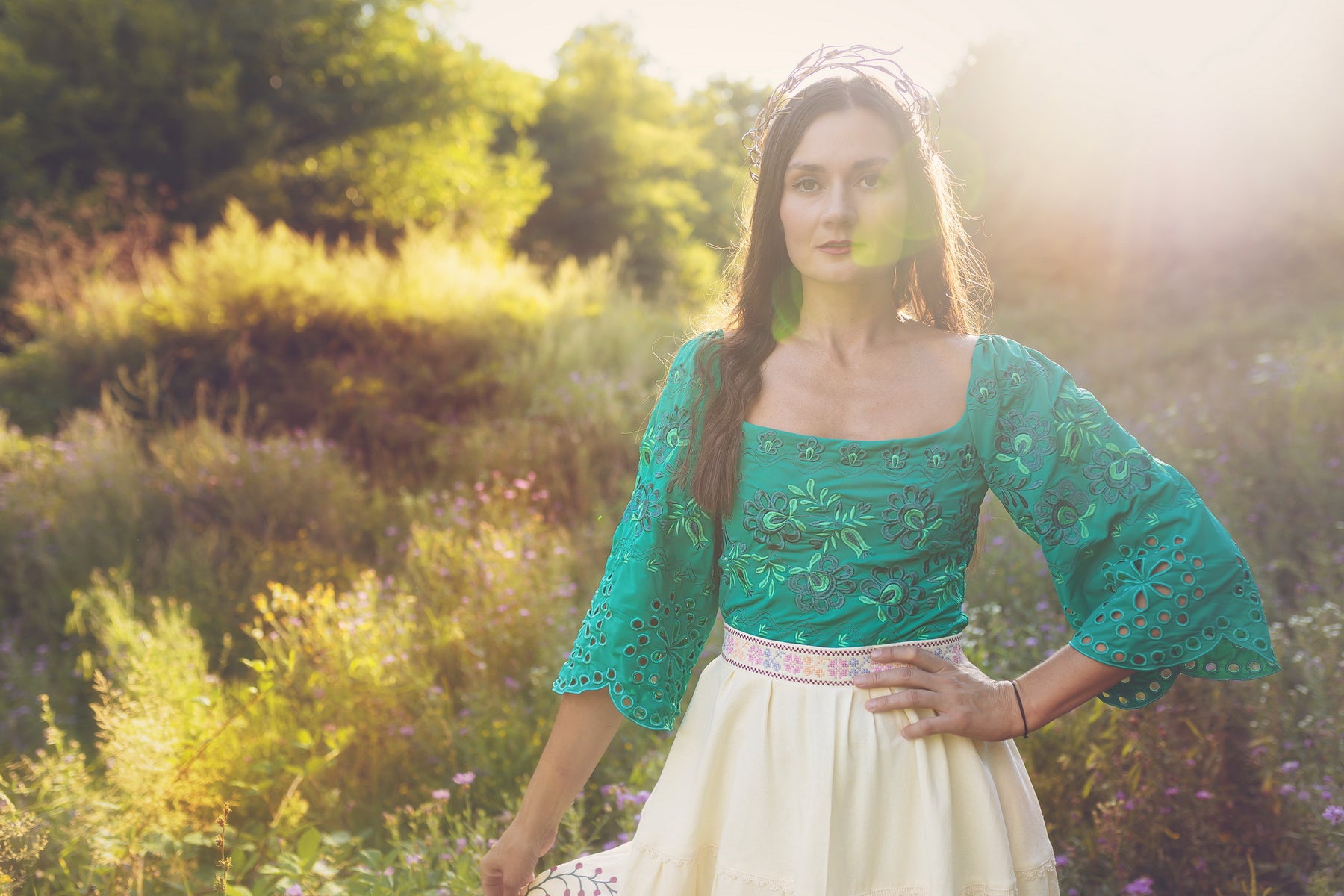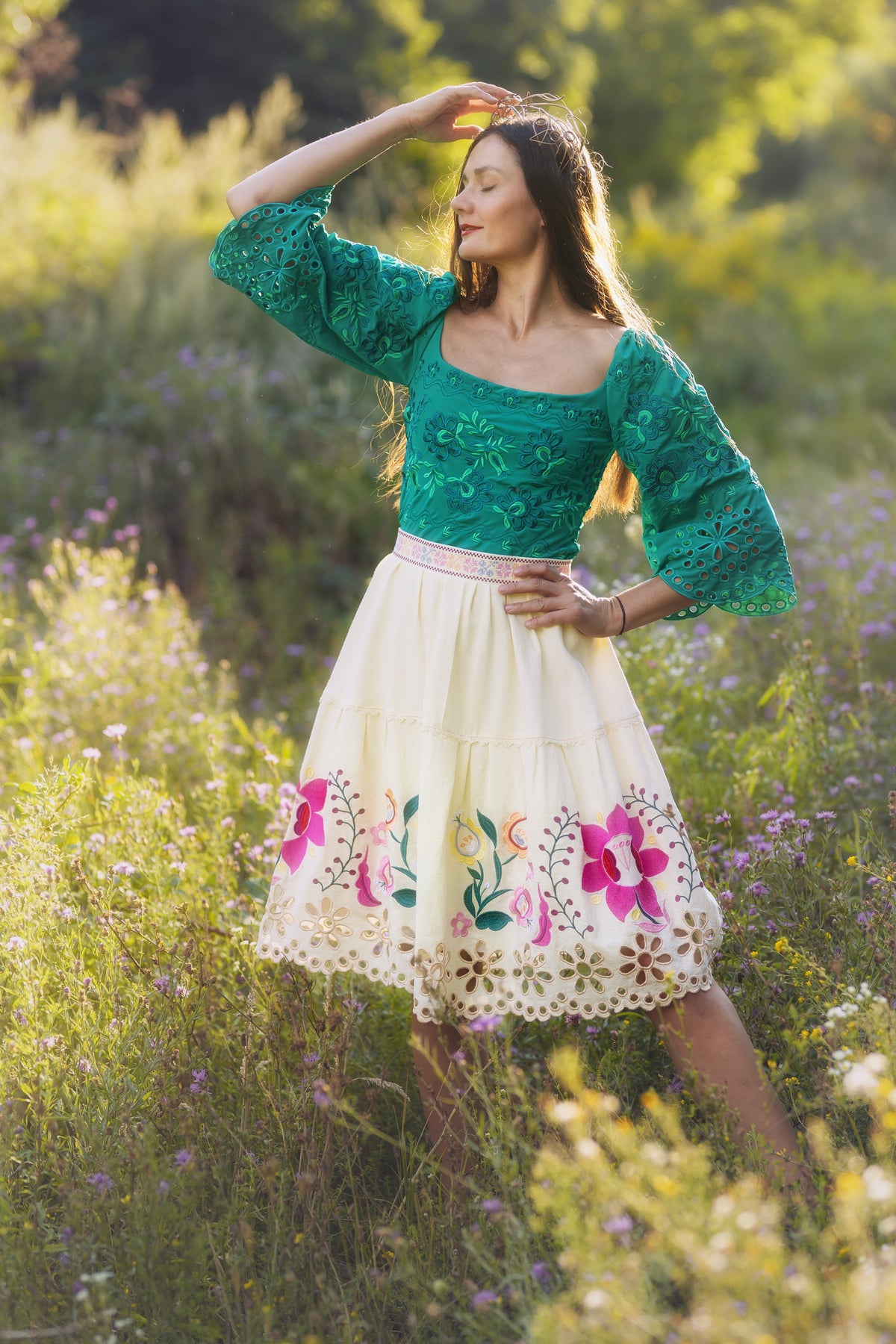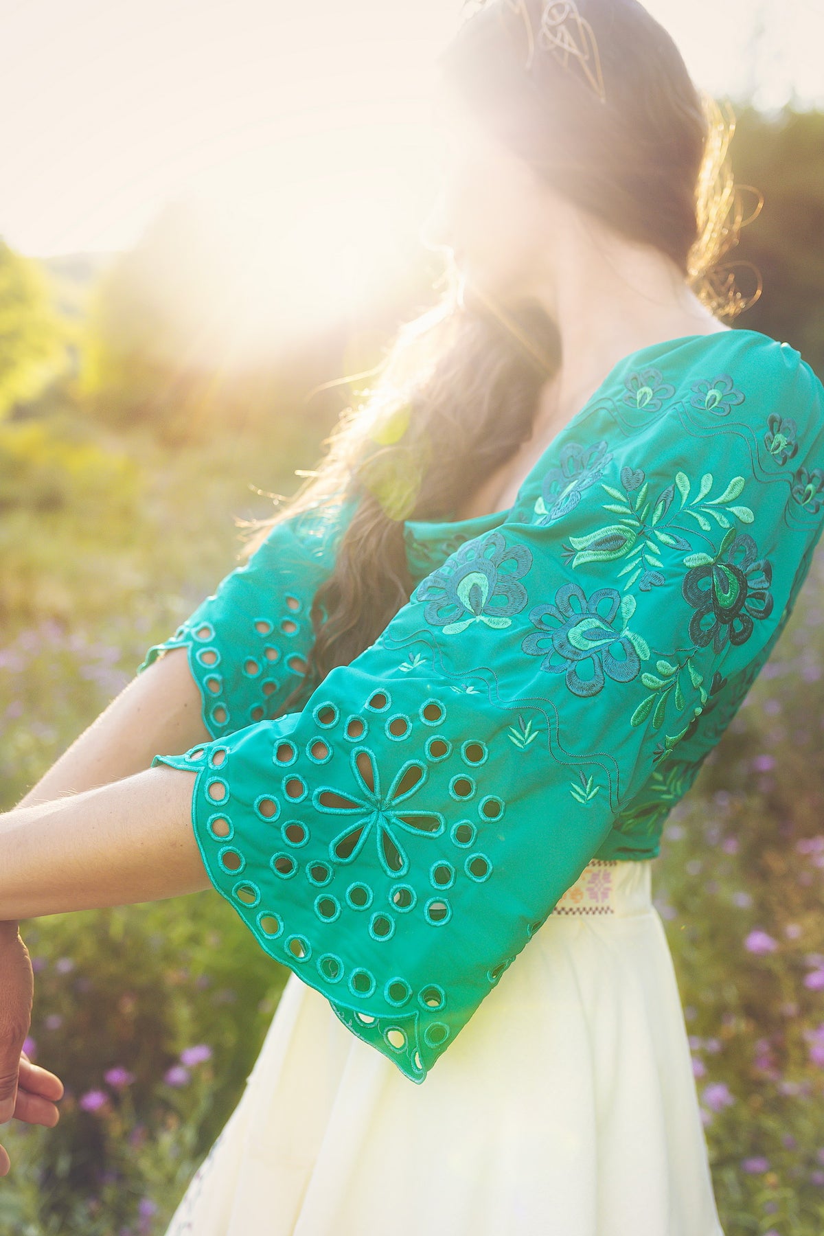 Strojom vyšívaný crop top, podšitý, zapína sa zboku na zips. Rukávy v hornej časti stiahnuté gumkou. Na rukávoch ručne vystrihovaná autorská madeira.
