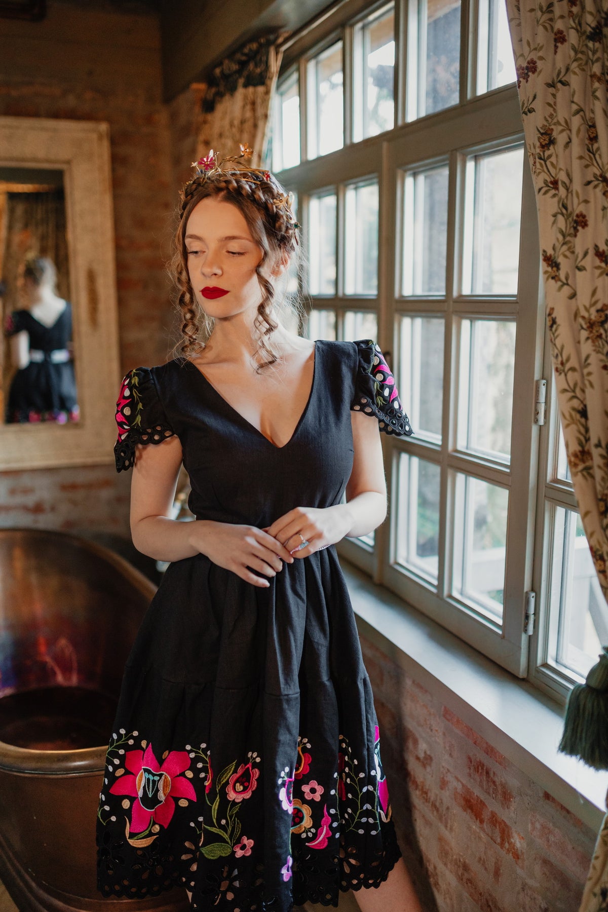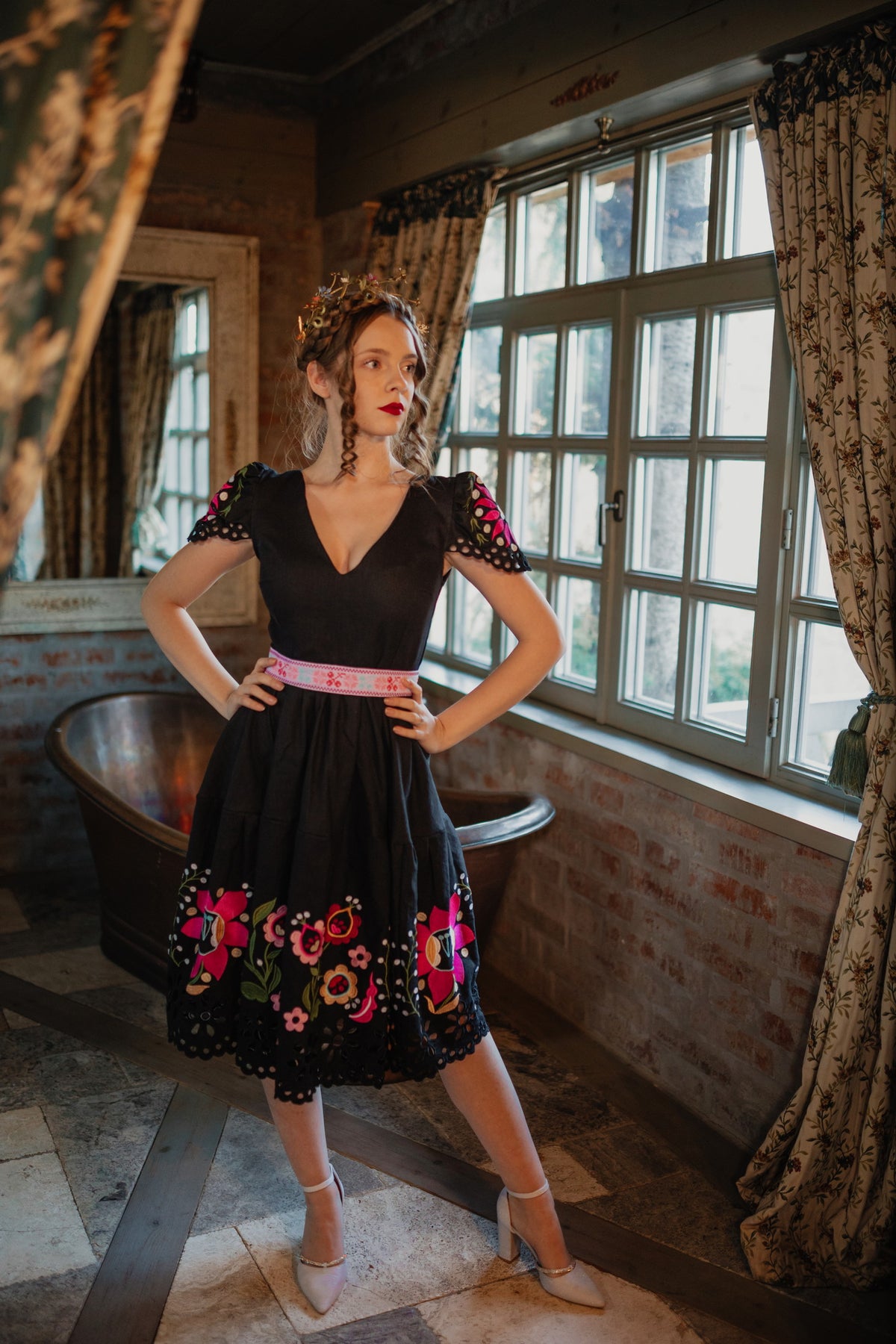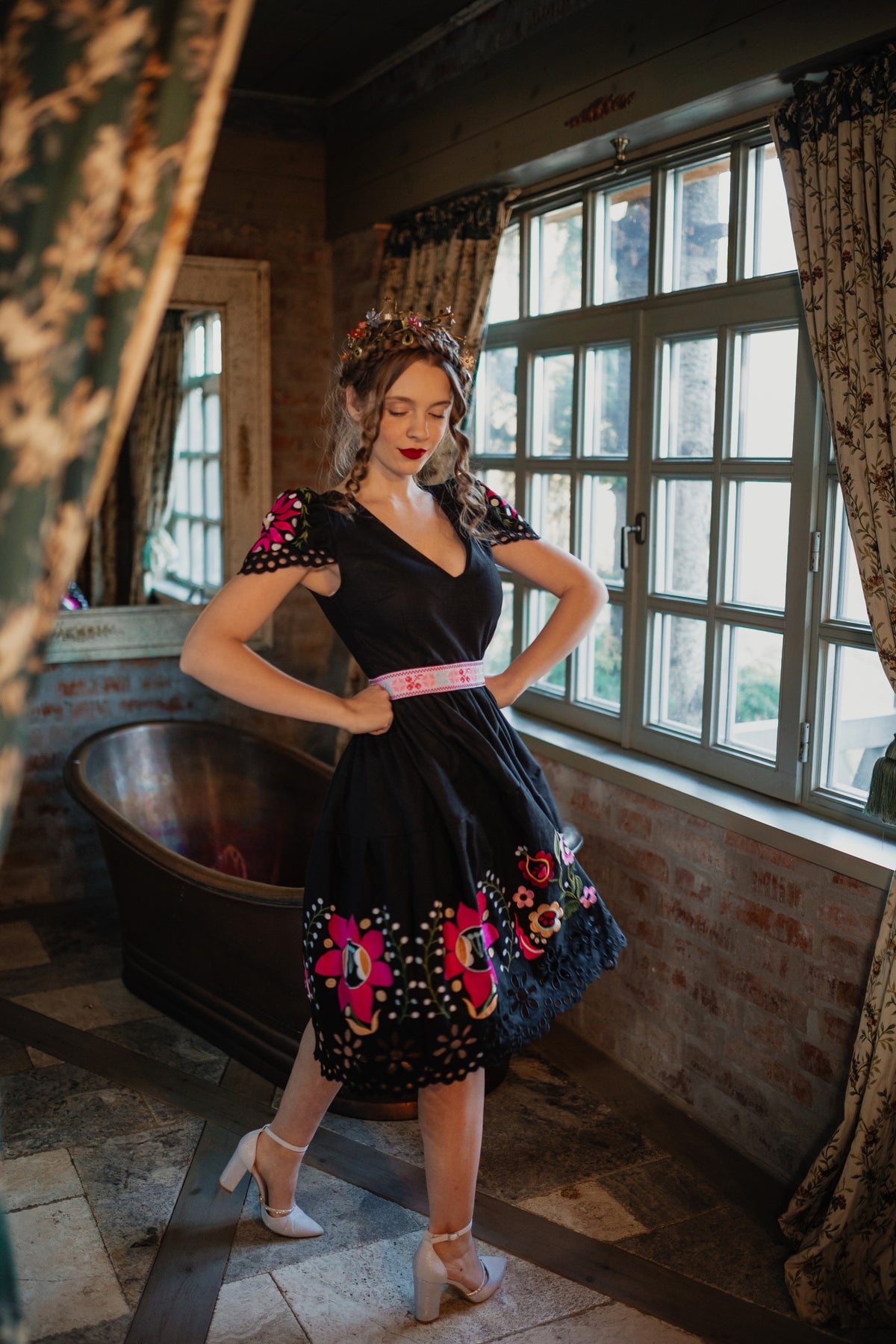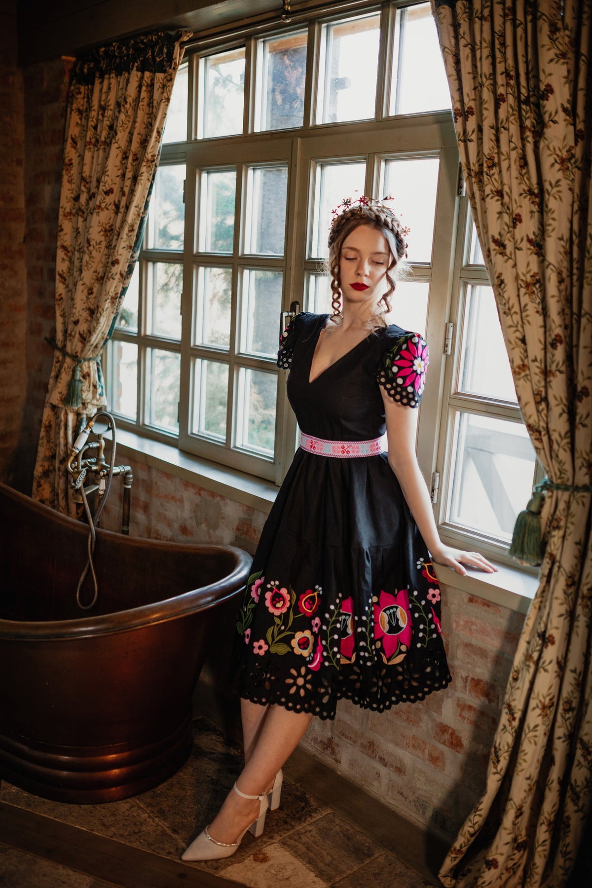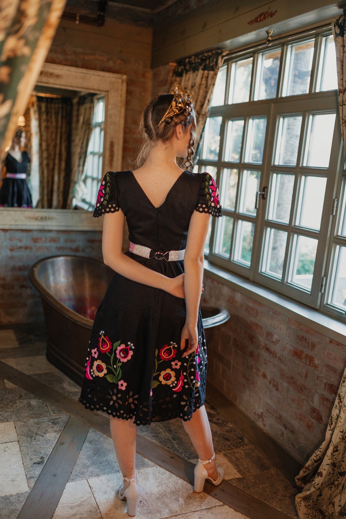 Šaty sa zapínajú vzadu na zips. Predný diel živôtika zapravený podsádkou, výstrih do písmena V. Madeirové rukávy. Sukňa nepodšitá, ukončená ručne vystrihovanou autorskou madeirou.
