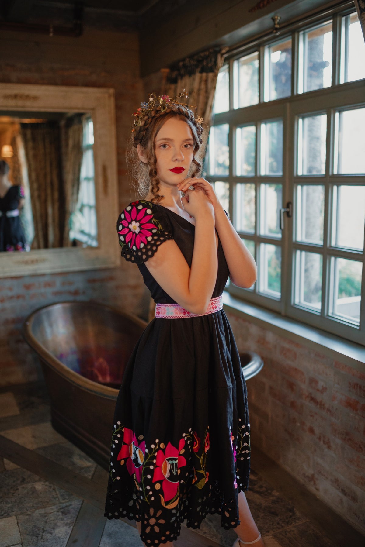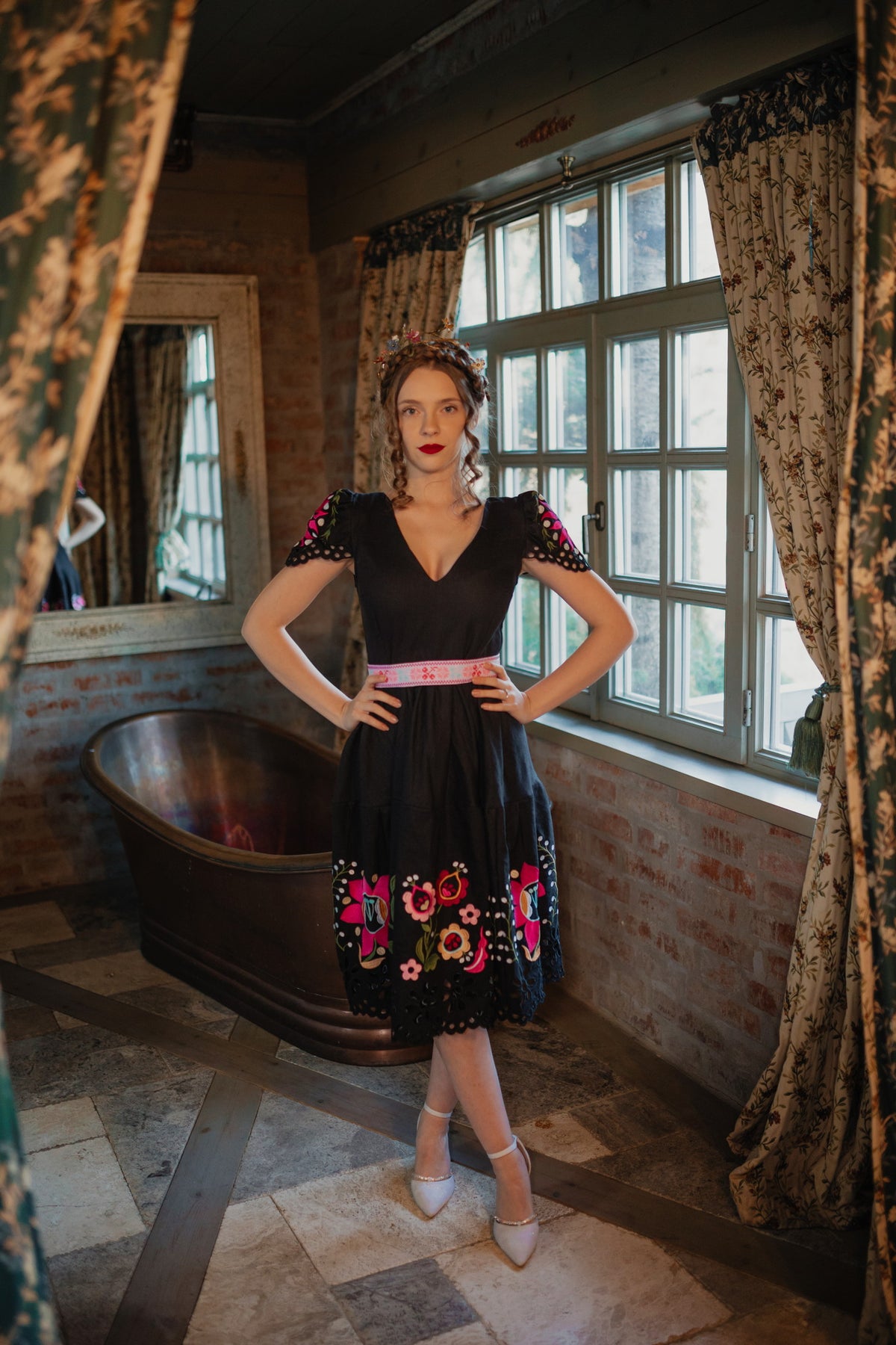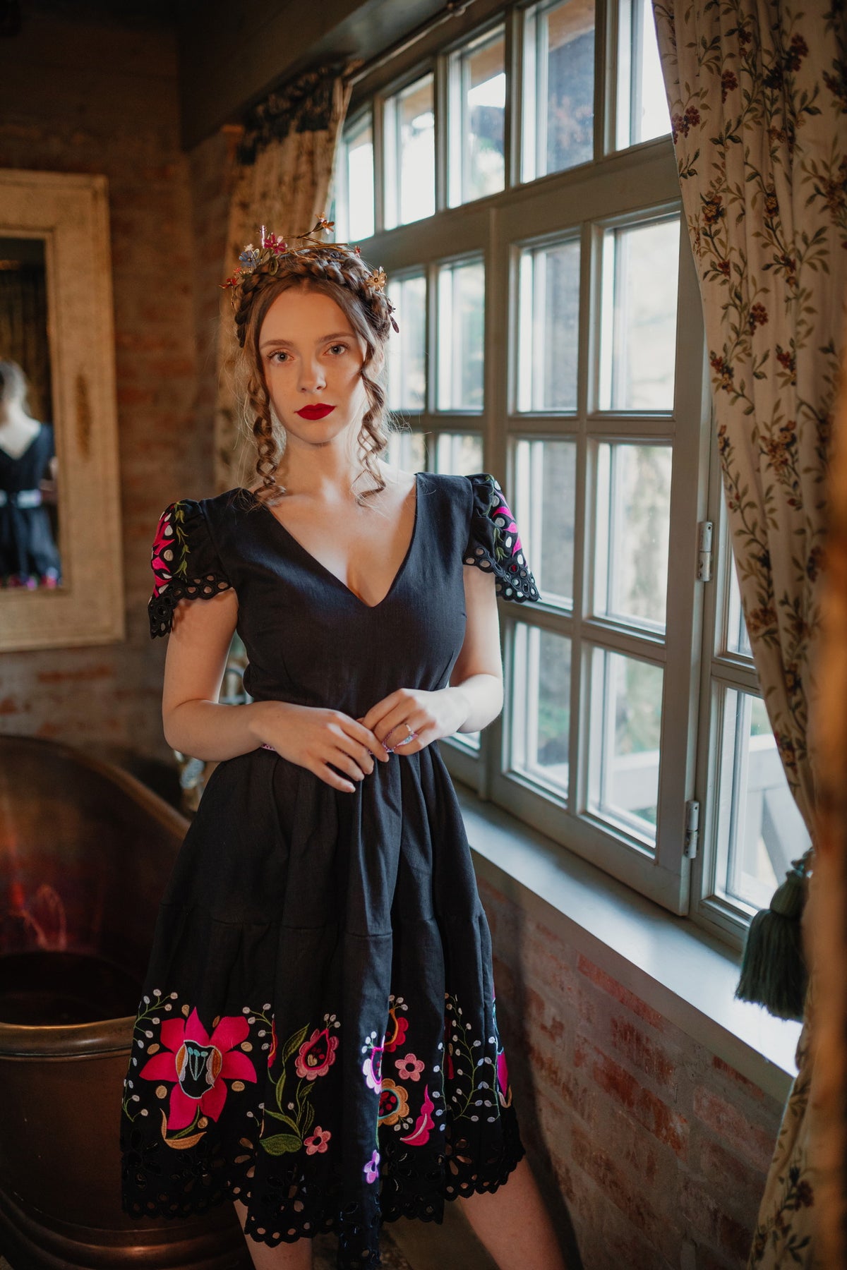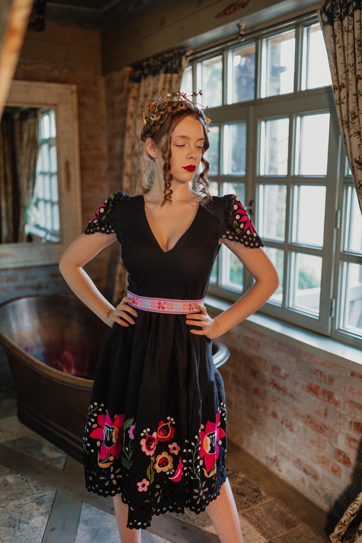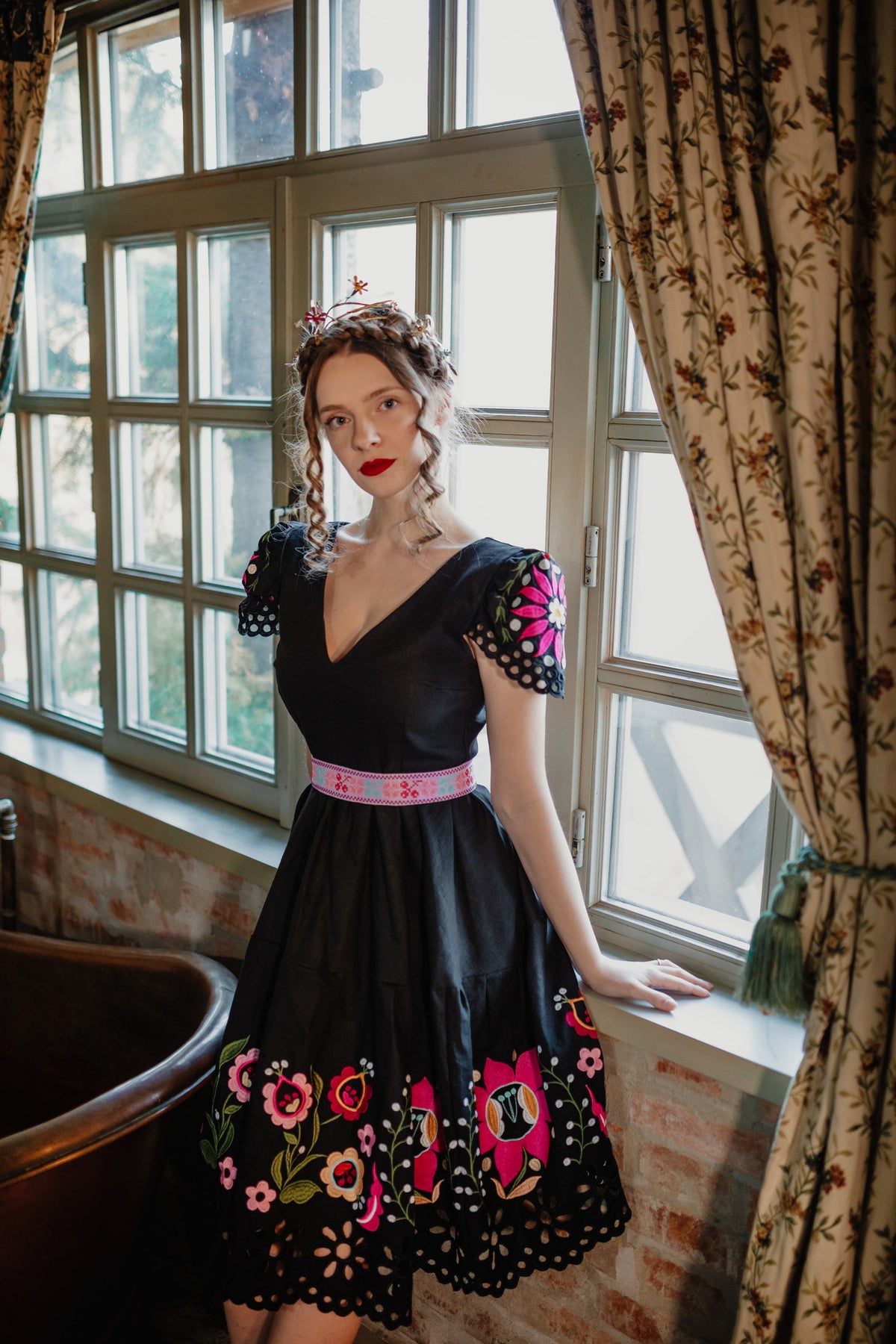 Šaty sa zapínajú vzadu na zips. Predný diel živôtika zapravený podsádkou, výstrih do písmena V. Madeirové rukávy. Sukňa nepodšitá, ukončená ručne vystrihovanou autorskou madeirou.