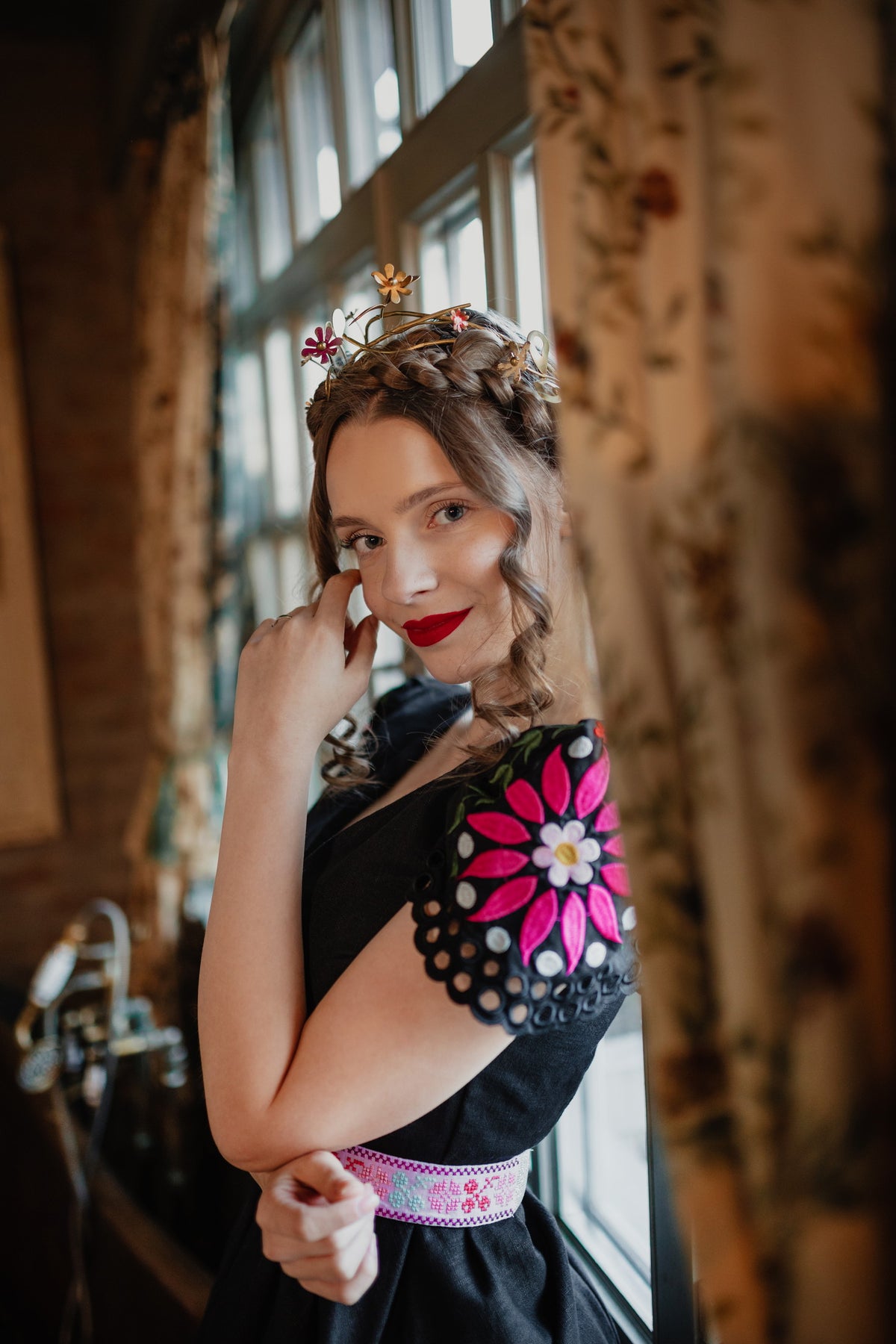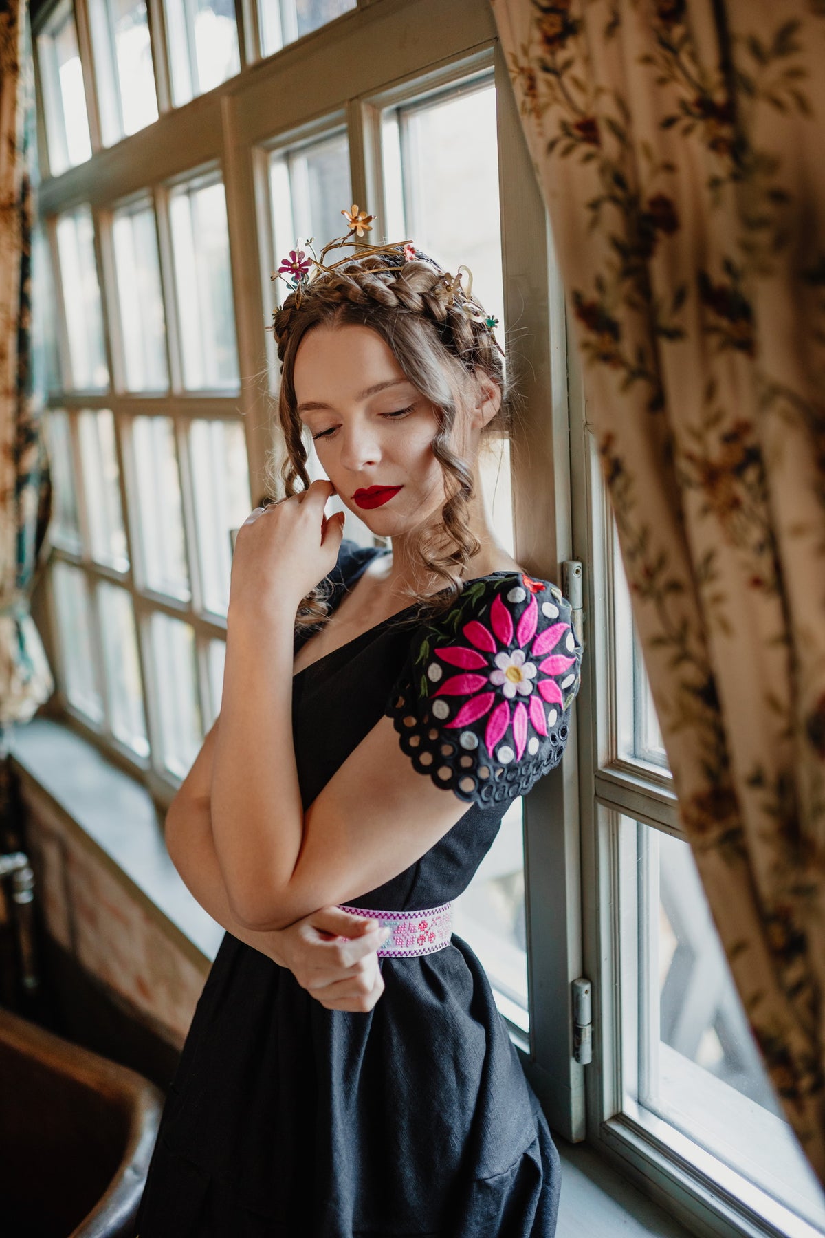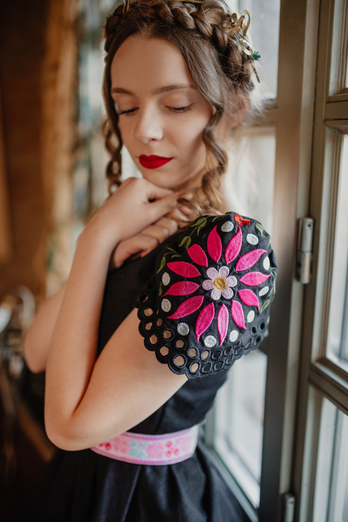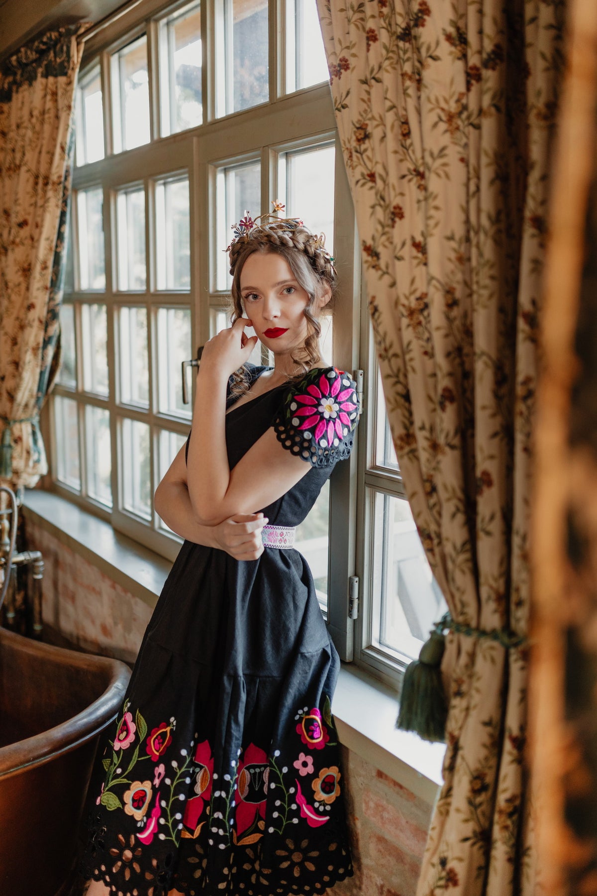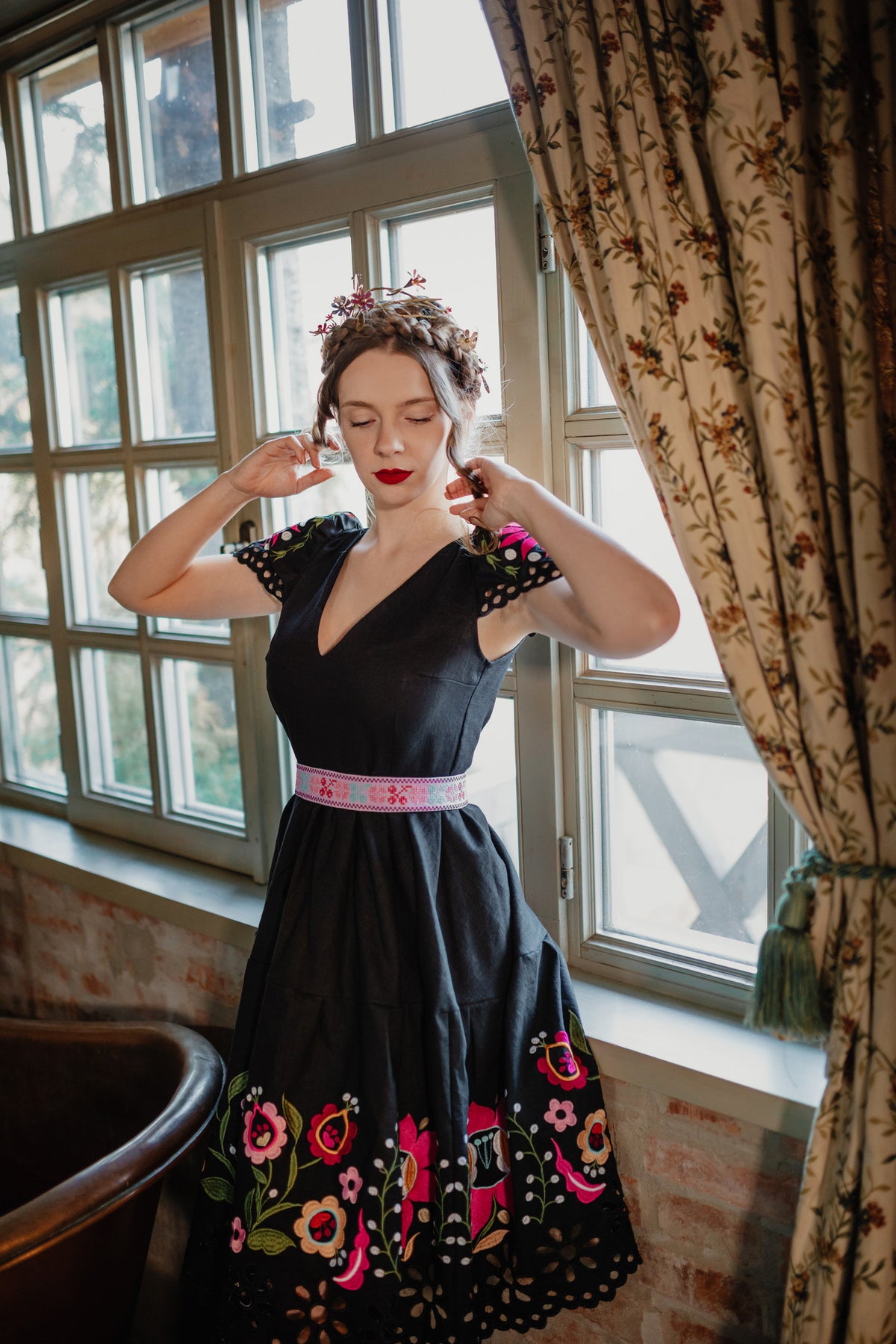 Šaty sa zapínajú vzadu na zips. Predný diel živôtika zapravený podsádkou, výstrih do písmena V. Madeirové rukávy. Sukňa nepodšitá, ukončená ručne vystrihovanou autorskou madeirou.