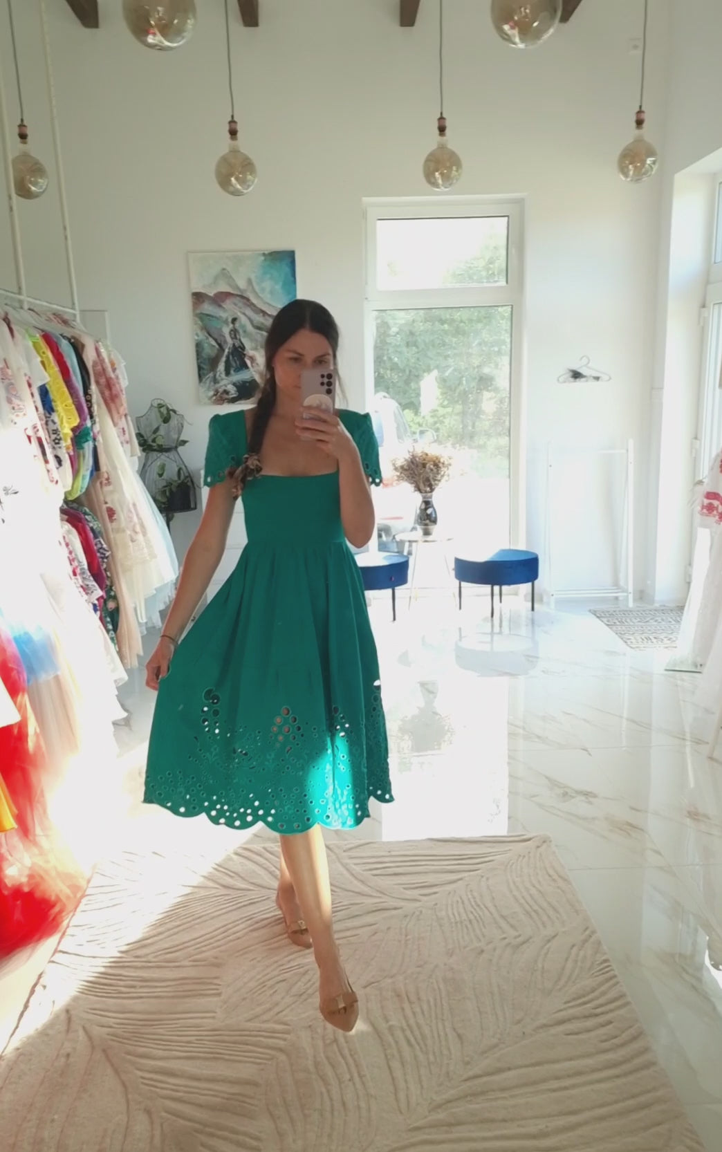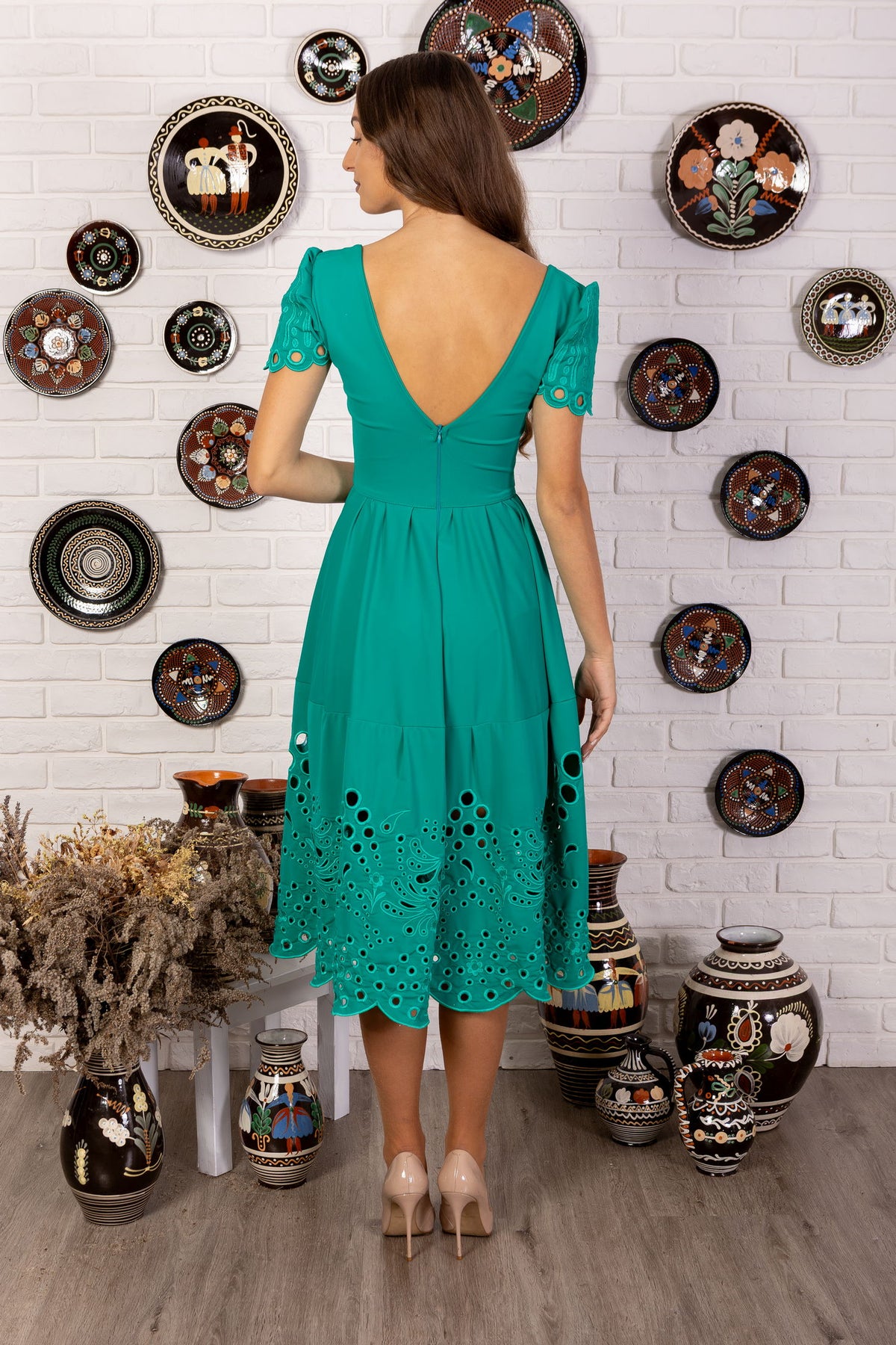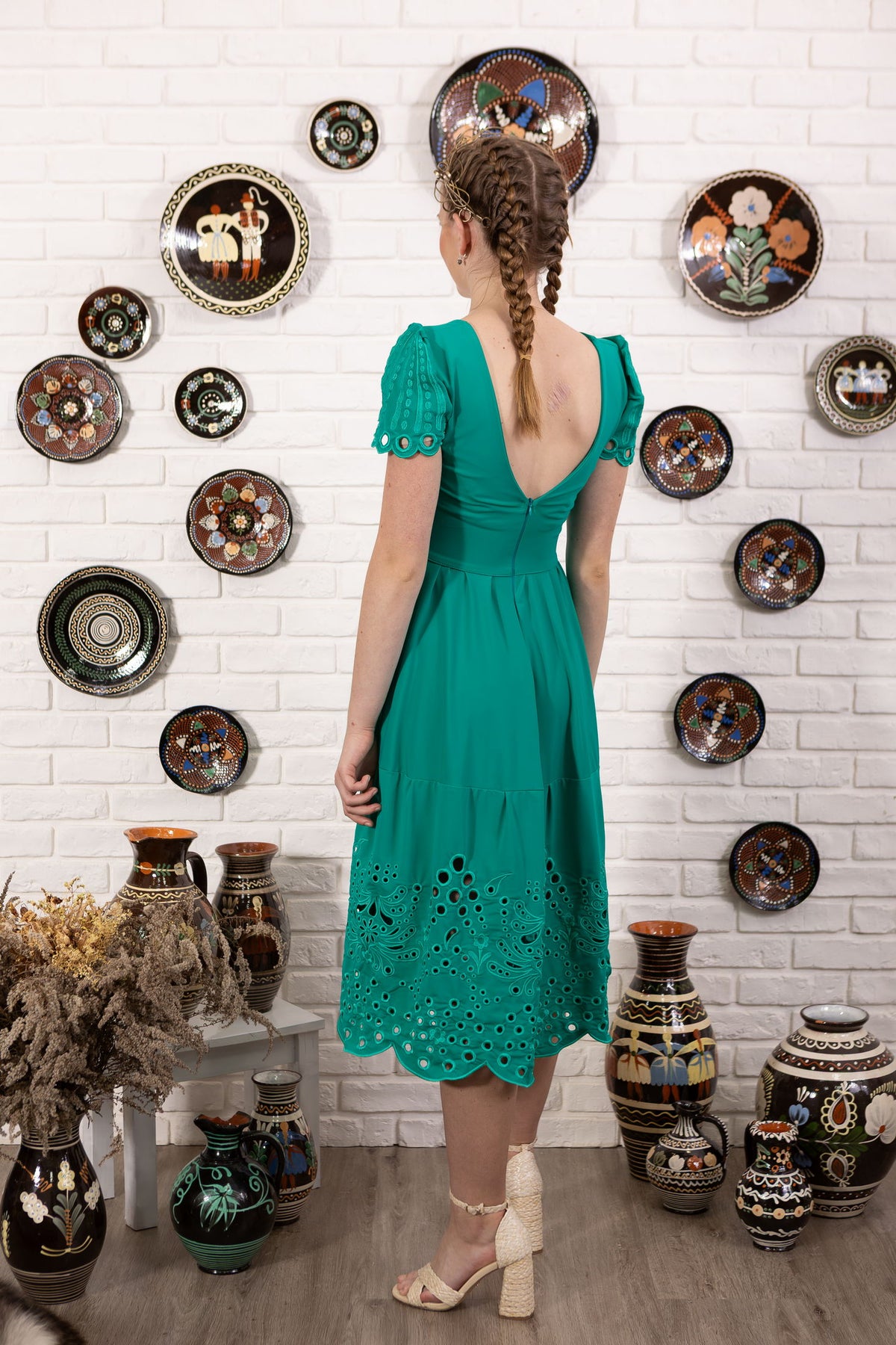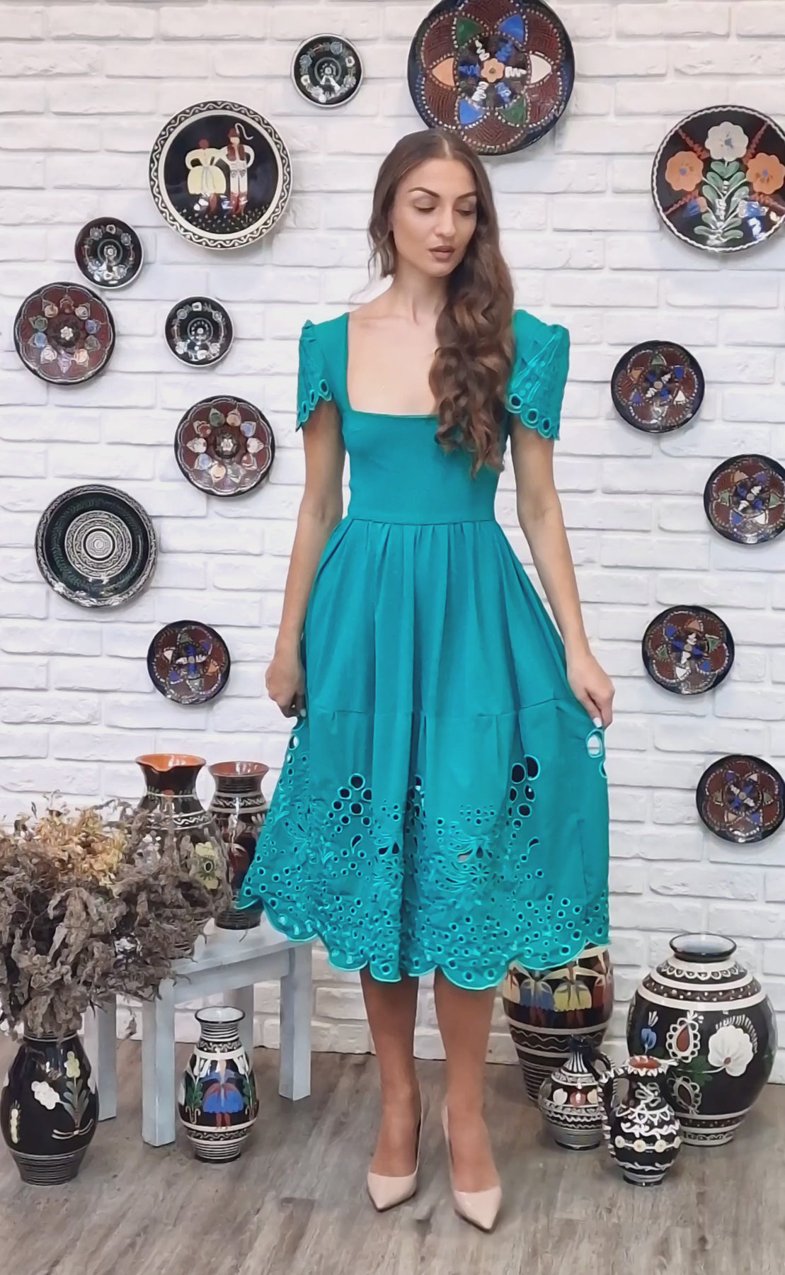 Šaty sa zapínajú vzadu na krytý zips. Živôtik podšitý, sukňa nepodšitá. Rukávy a sukňa strojovo vyšívané, ručne vystrihované. Motív výšivky inšpirovaný pozdišovskou keramikou.