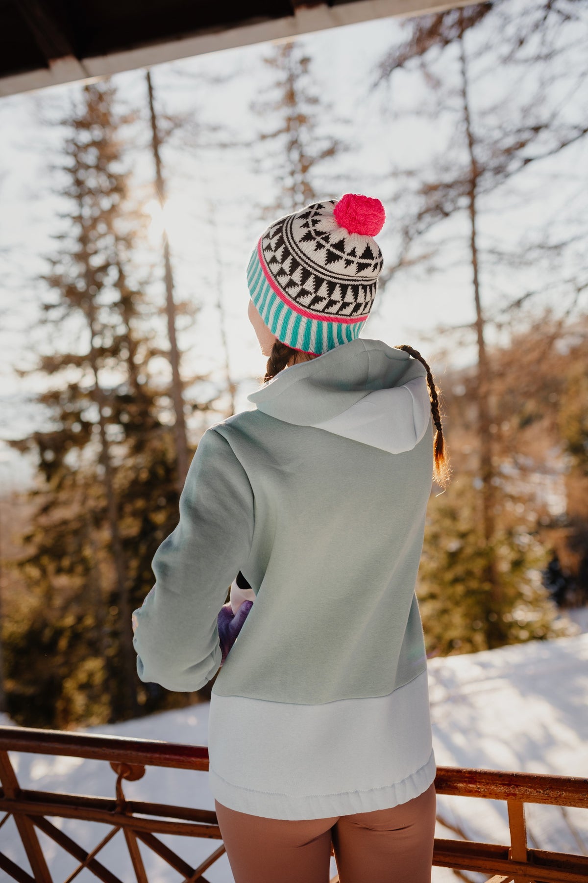 Bavlnená mikina s kapucňou a klokaním vreckom. Bez podšitia. V hornej časti všitý kovový zips. Rukávy strojom vyšívané, zakončené patentom. Dolný kraj zakončený gumou.