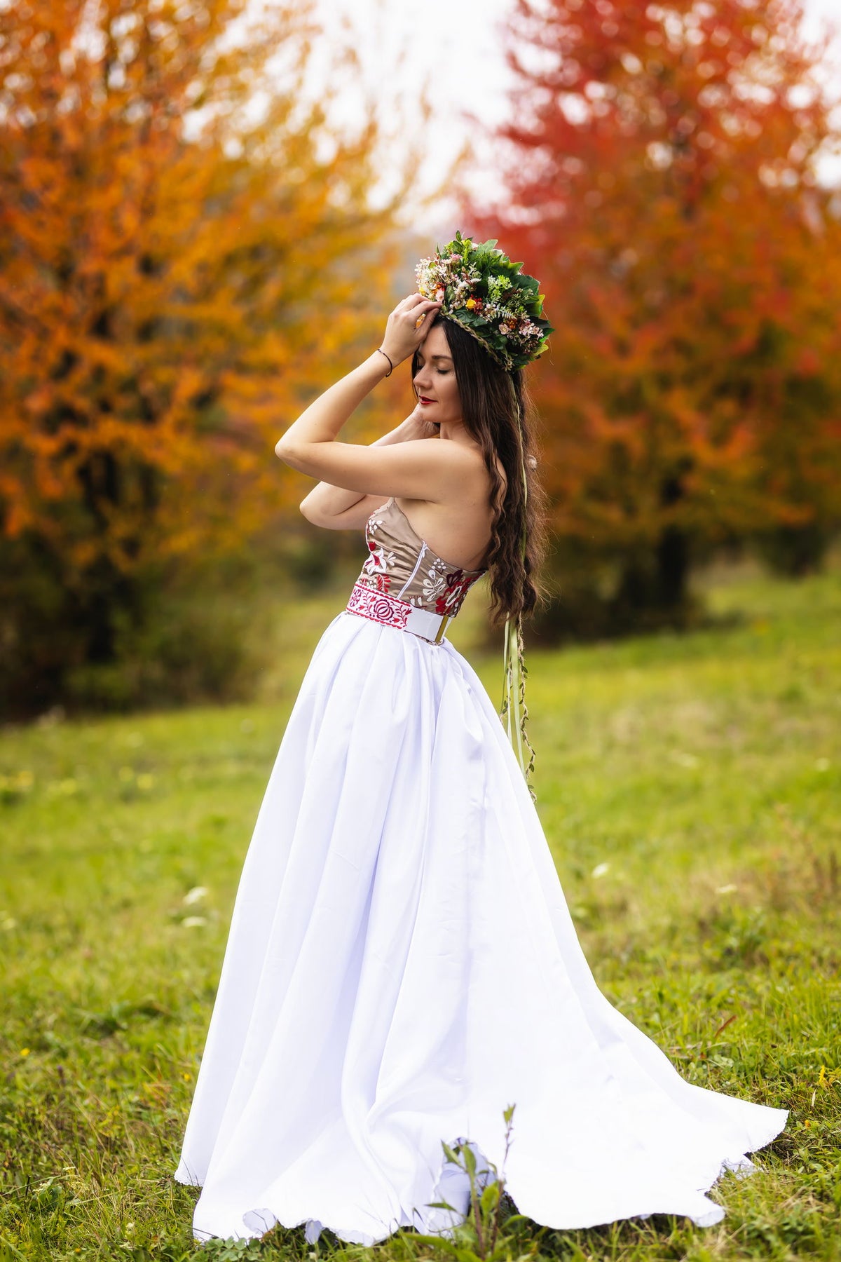 Šaty sa zapínajú zboku na zips, sú podšité. Ručne vyšívaný živôtik autorskou výšivkou, plným stehom. Viaže sa na jedno rameno. Vlečková sukňa je podšitá, jemne nadvihnutá tylom, zakončená paličkovanou čipkou.