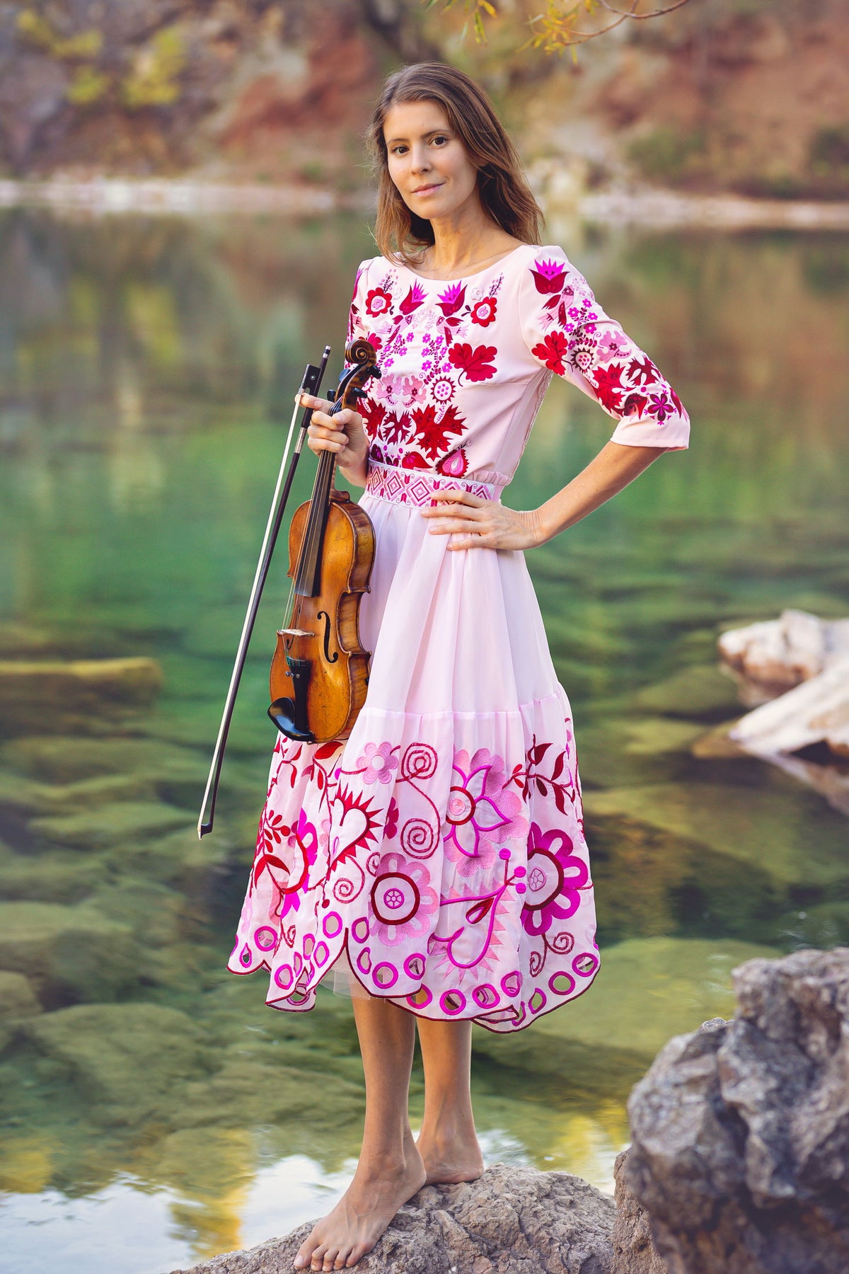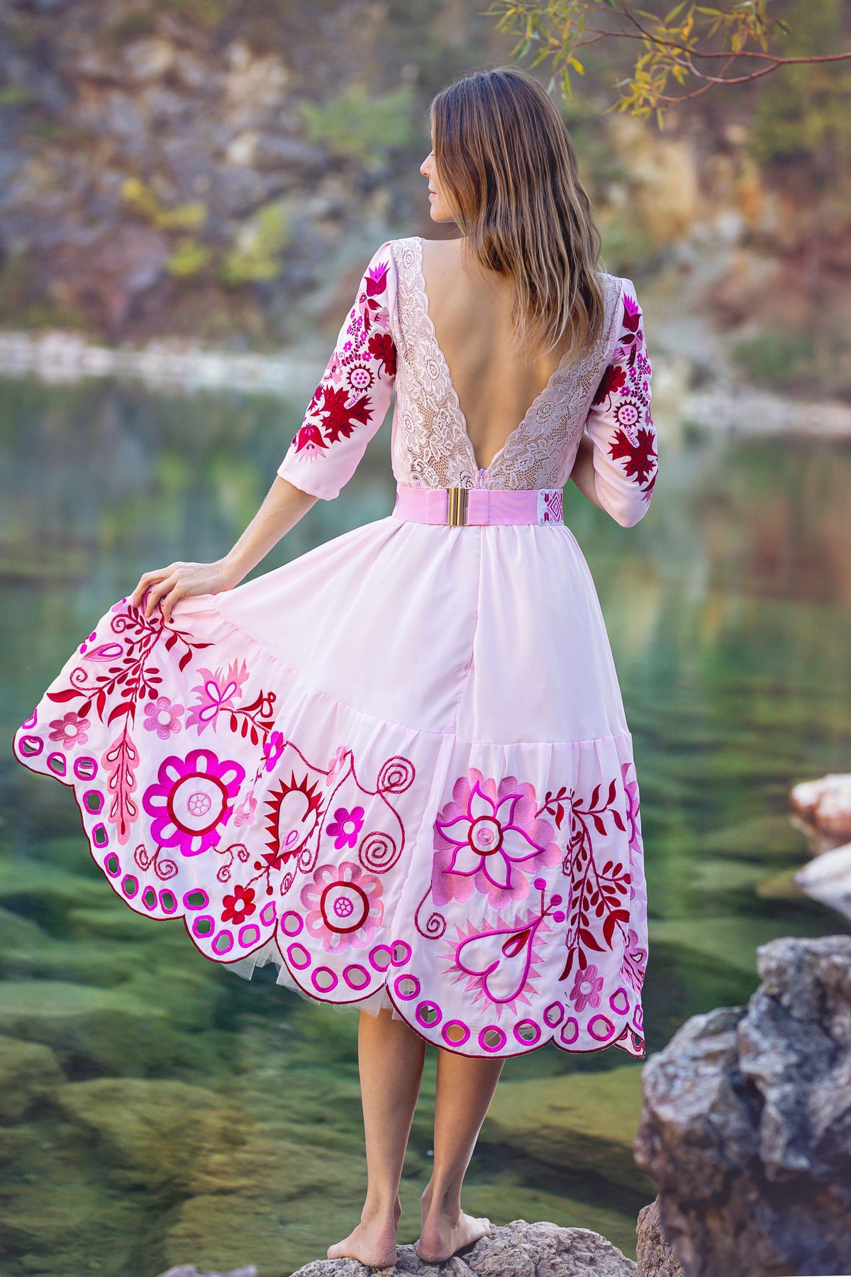 Šaty sa zapínajú vzadu na krytý zips, podšité. Na živôtiku kombinácia ručnej a strojovej výšivky. Zadný diel zdobí krajka. Rukávy strojom vyšívané. Sukňa jemne nadvihnutá tylom, zakončená strojom vyšívanou, ručne vystrihovanou madeirou.