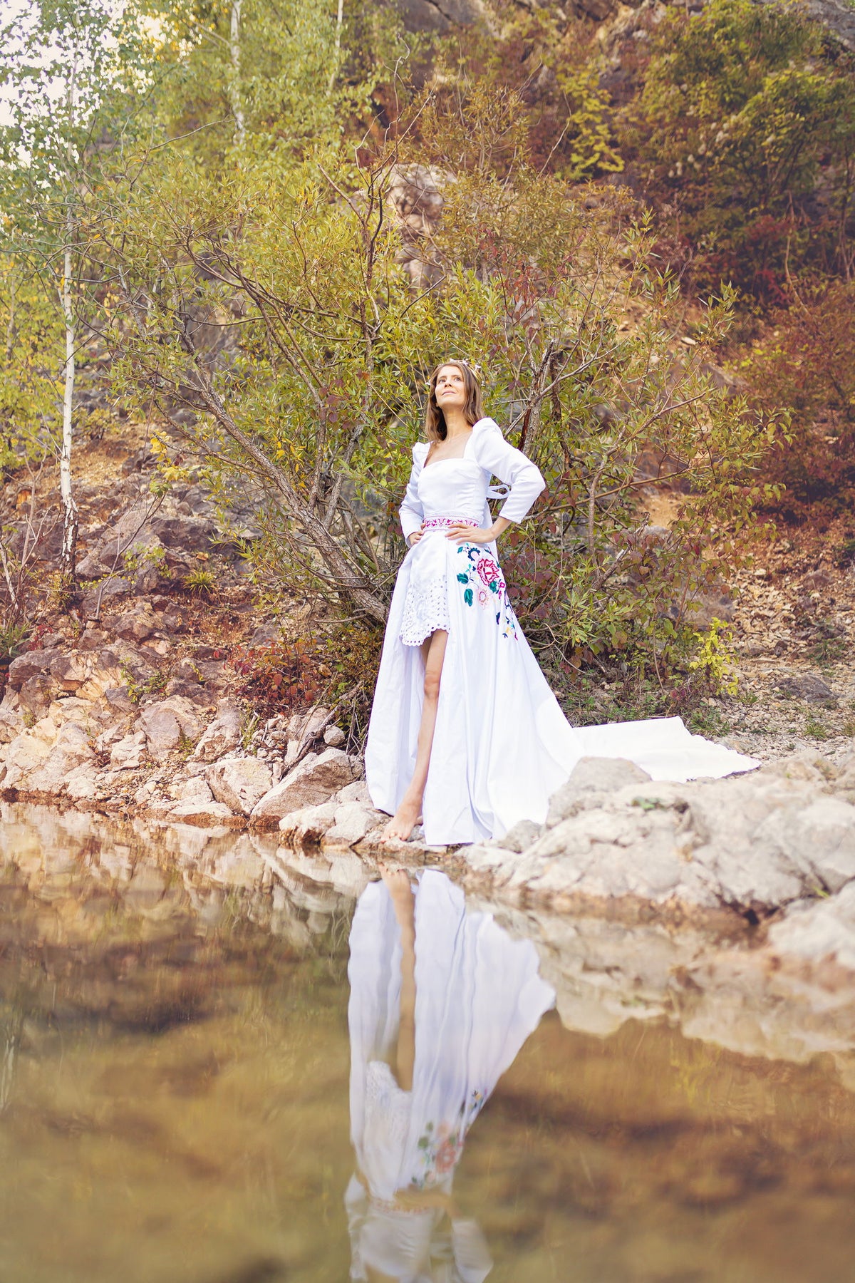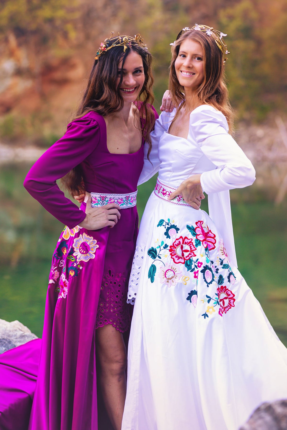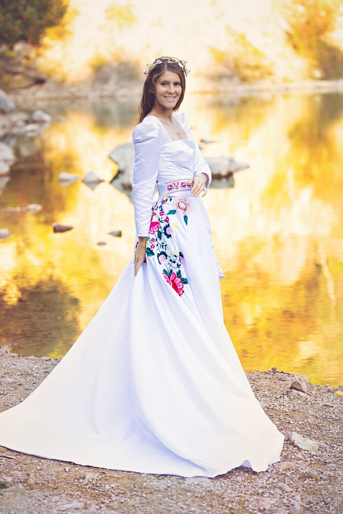Podšité, zapínanie vzadu na zips a viazanie. Sukňu zdobí strojom vyšívaná autorská madeira, ručne vystrihovaná.