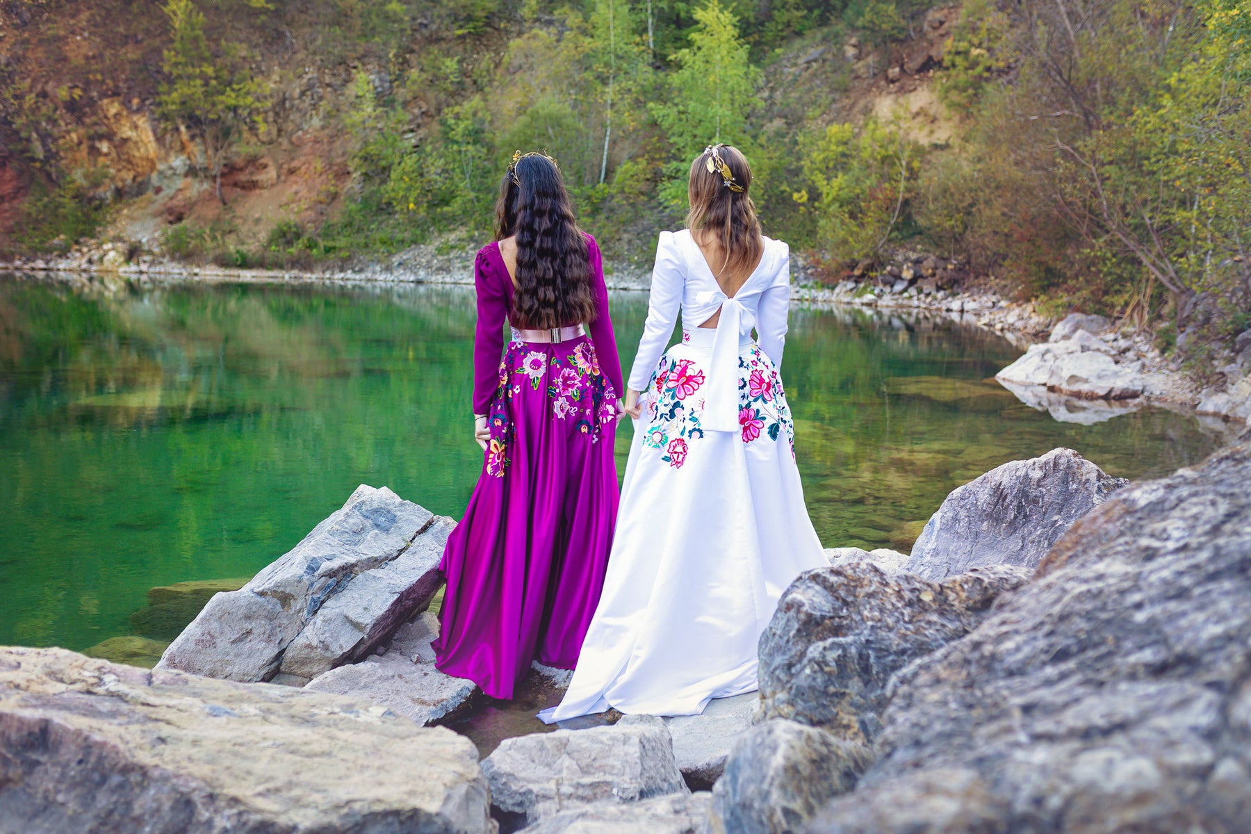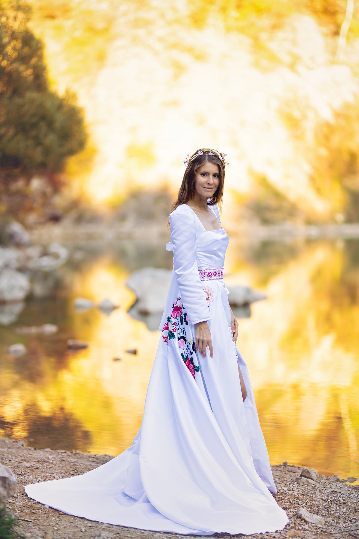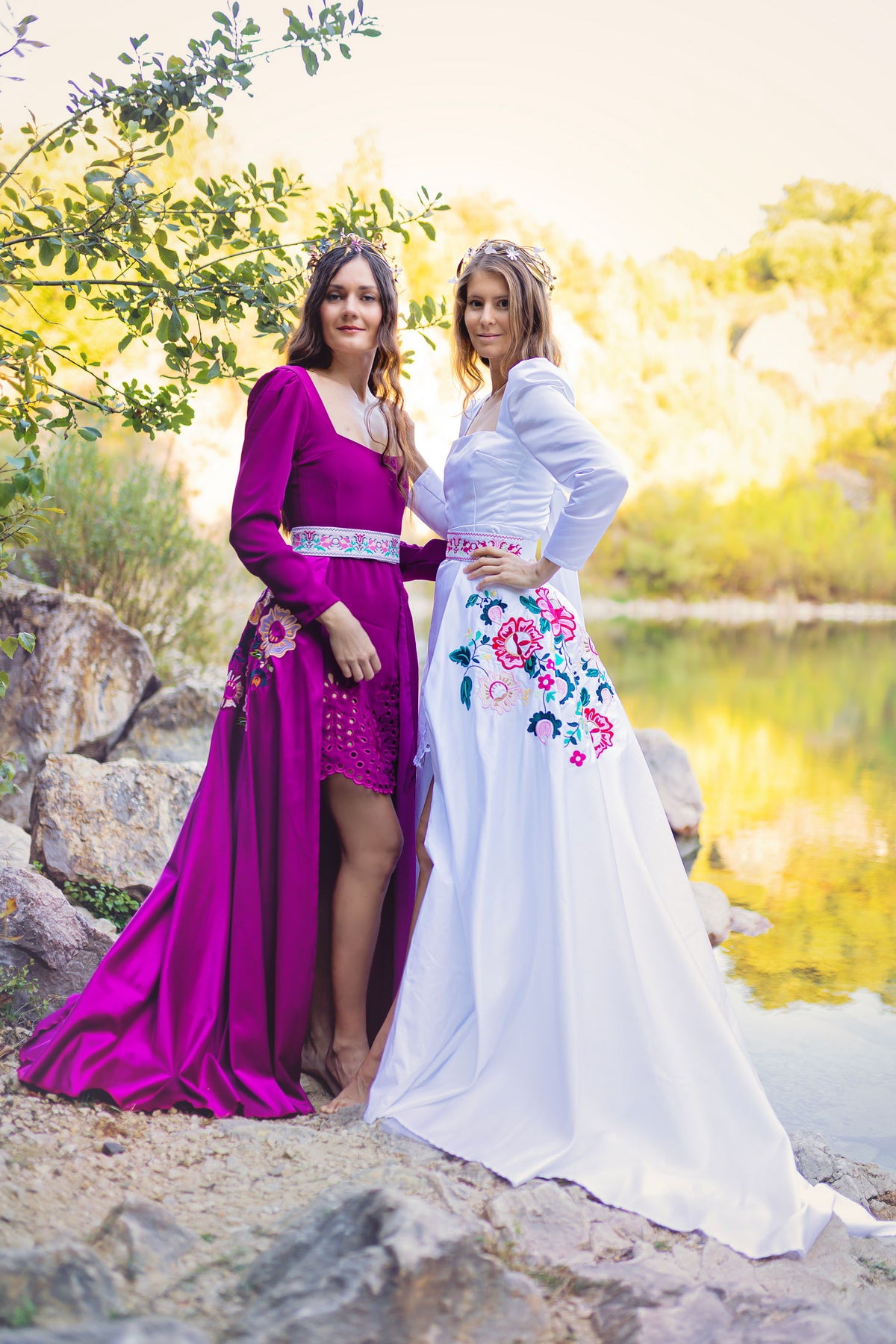 Podšité, zapínanie vzadu na zips a viazanie. Sukňu zdobí strojom vyšívaná autorská madeira, ručne vystrihovaná.