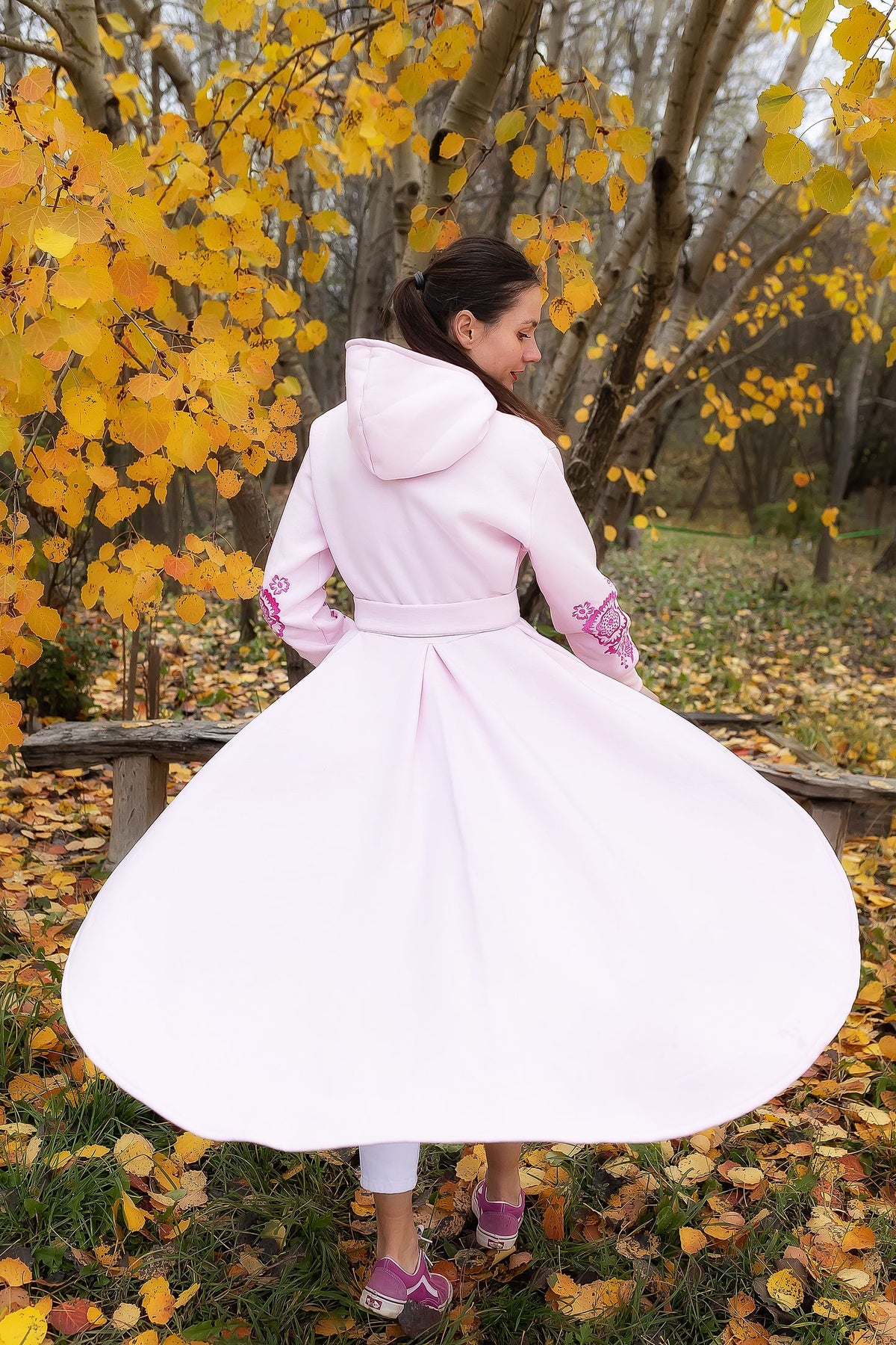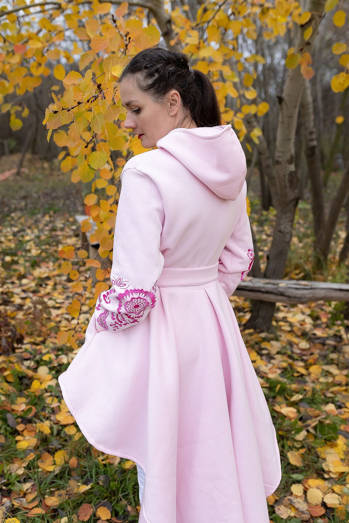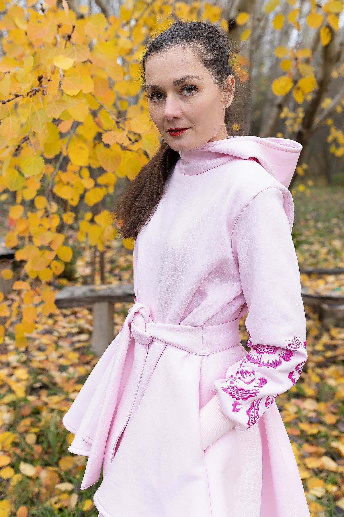 Bavlnená predlžená mikina s kapucňou a vreckami. Bez podšitia. Okrúhly výstrih. Na rukávoch autorská strojová výšivka, plný steh. Dolný okraj rukávov zapravený patentami.