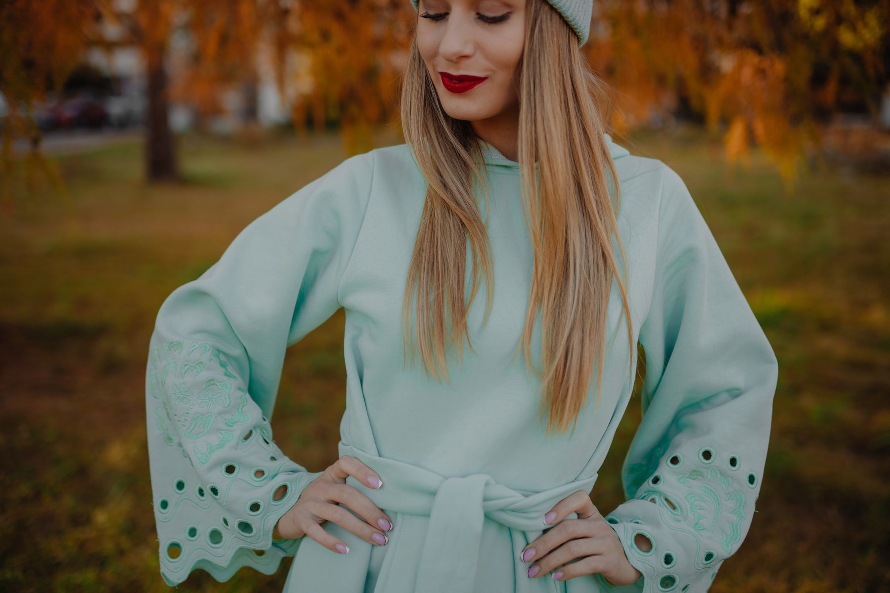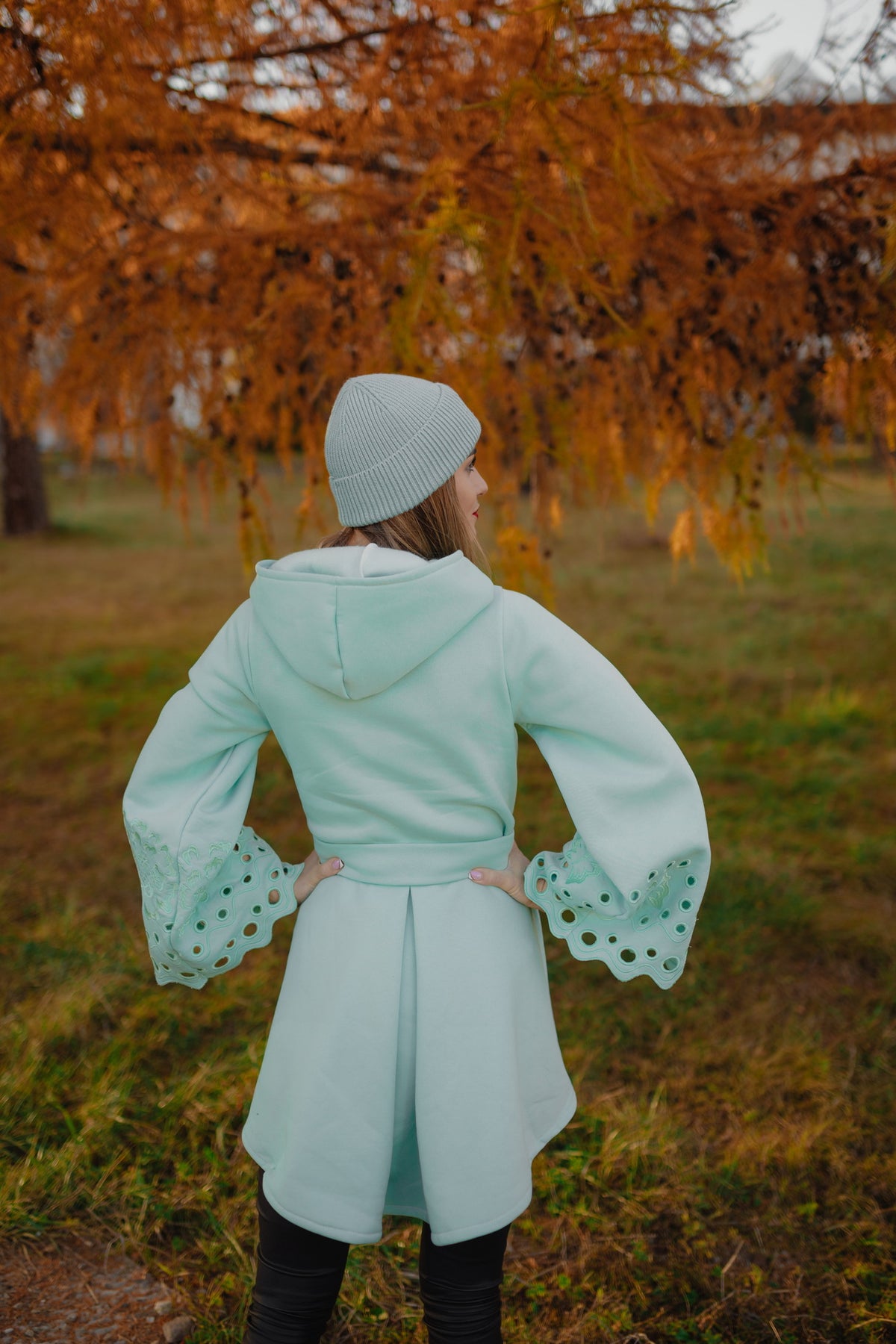 Bavlnená predlžená mikina s kapucňou a vreckami. Bez podšitia. Okrúhly výstrih. Na rukávoch autorská, strojom vyšívaná madeira, plný steh, ručne vystrihovaná.