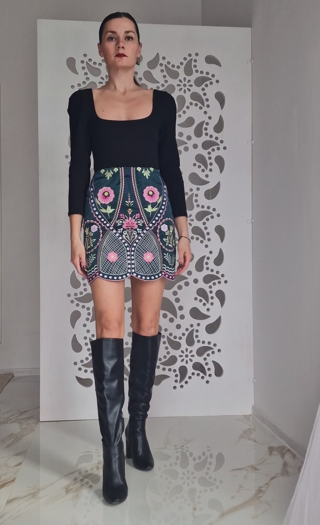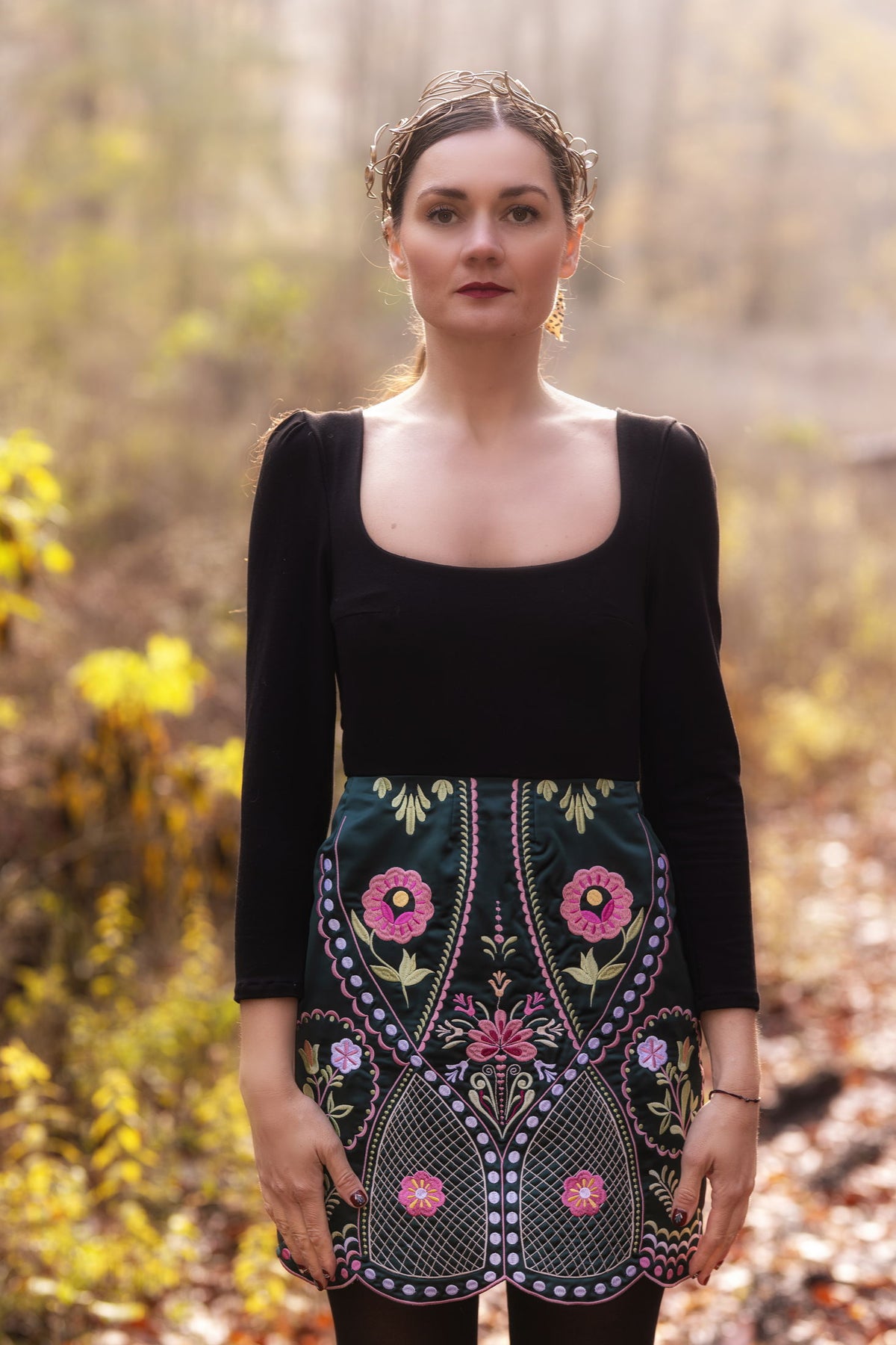 Šaty sa zapínajú vzadu na krytý zips. Predný diel podšitý. Živôtik z pružného bavlneného úpletu, sukňa saténová, polopodšitá bavlnou. Strojovo vyšívané, motív inšpirovaný pozdišovskou keramikou.