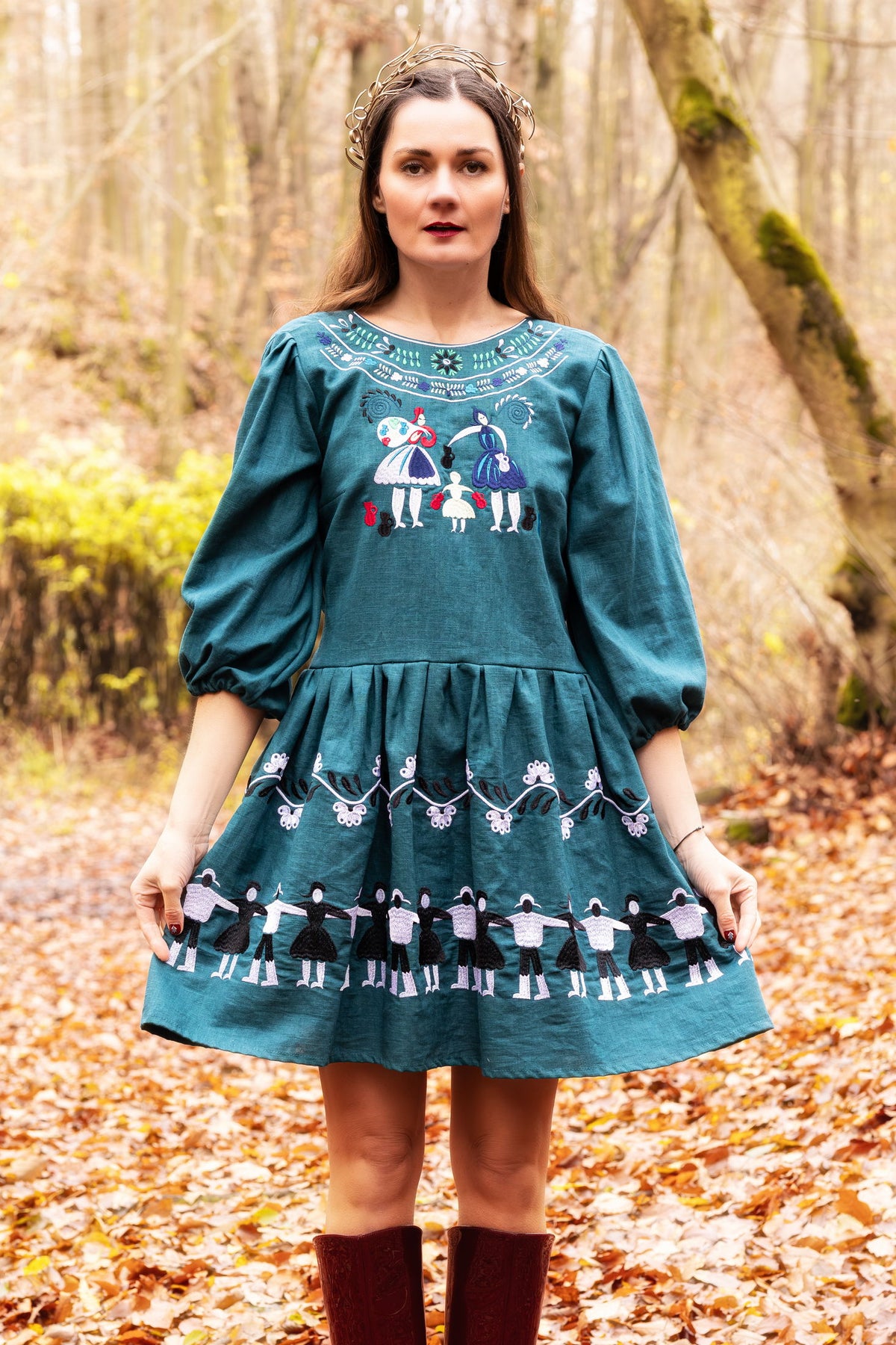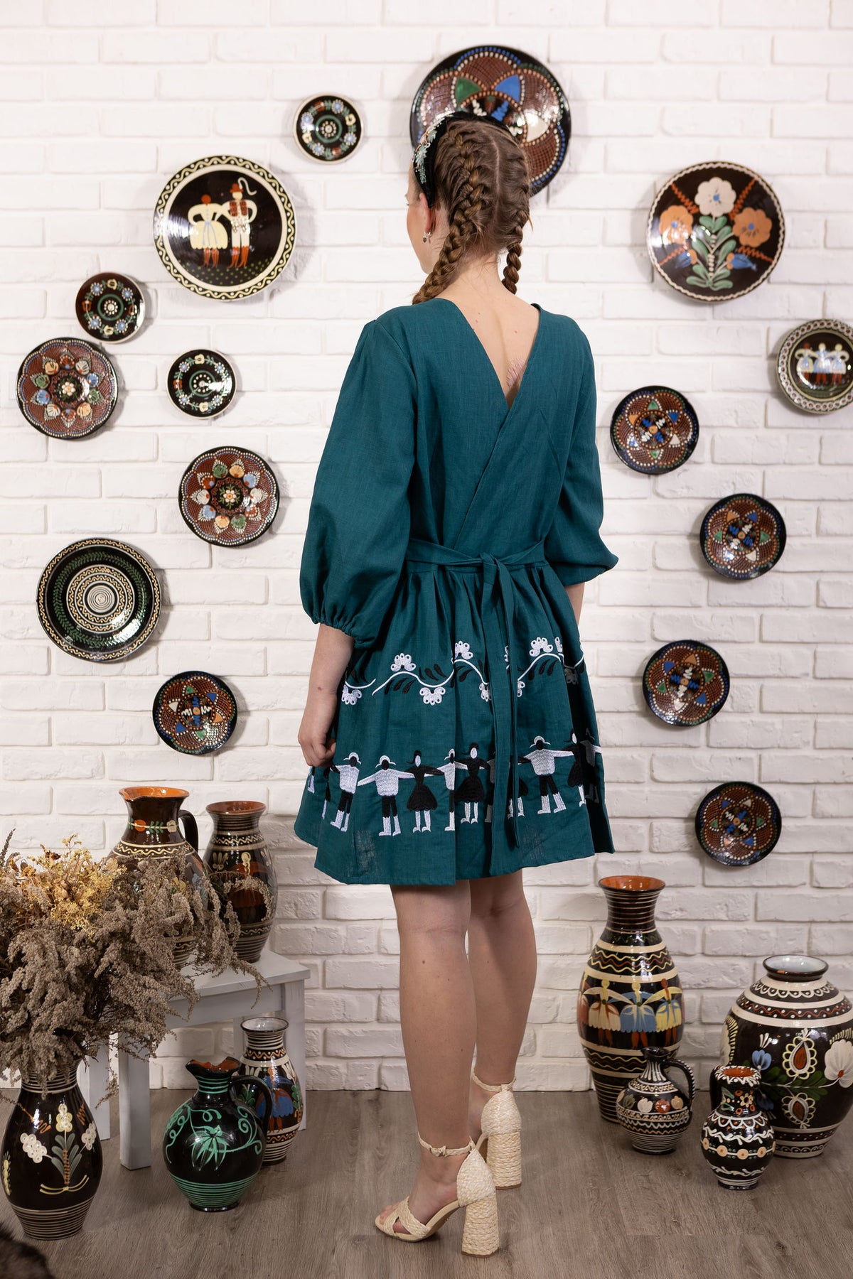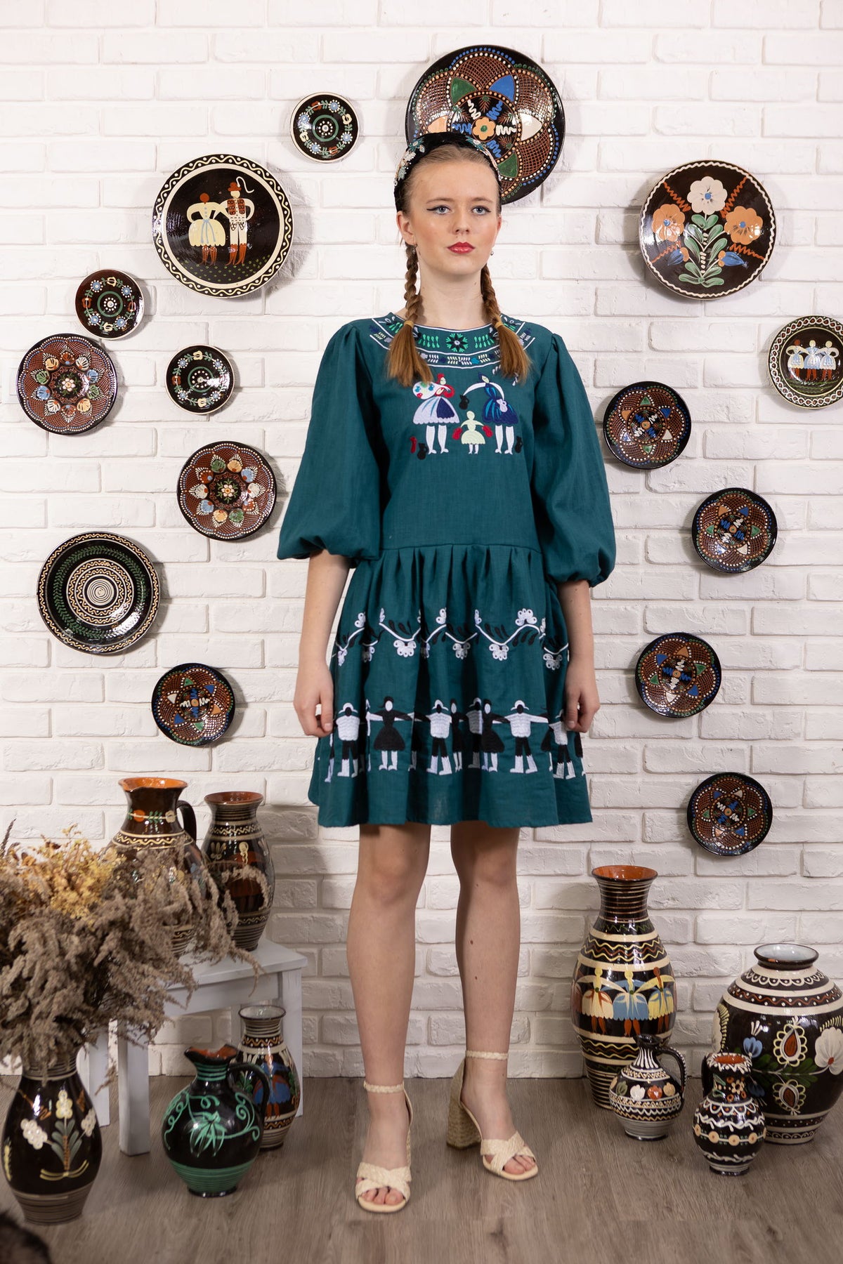 Šaty sa v páse sťahujú viazaním. Predný diel živôtika podšitý. Sukňa nepodšitá. Rukávy stiahnuté gumičkou. Živôtik a sukňa strojovo vyšívané, motív výšivky inšpirovaný pozdišovskou keramikou.